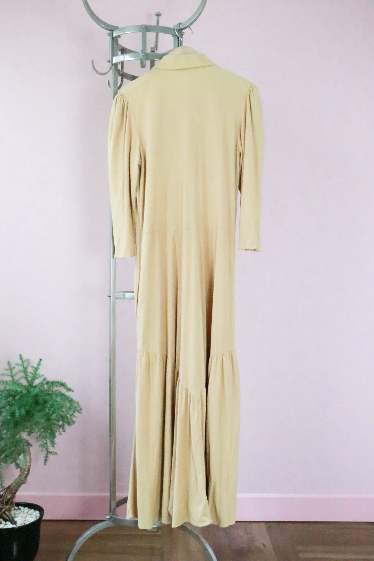 ギャザーのたっぷりはいったスリーブやスカート裾に広がるリッチなドレープ仕立てなど、通常のシャツワンピースにはないドラマチックな佇まい。
