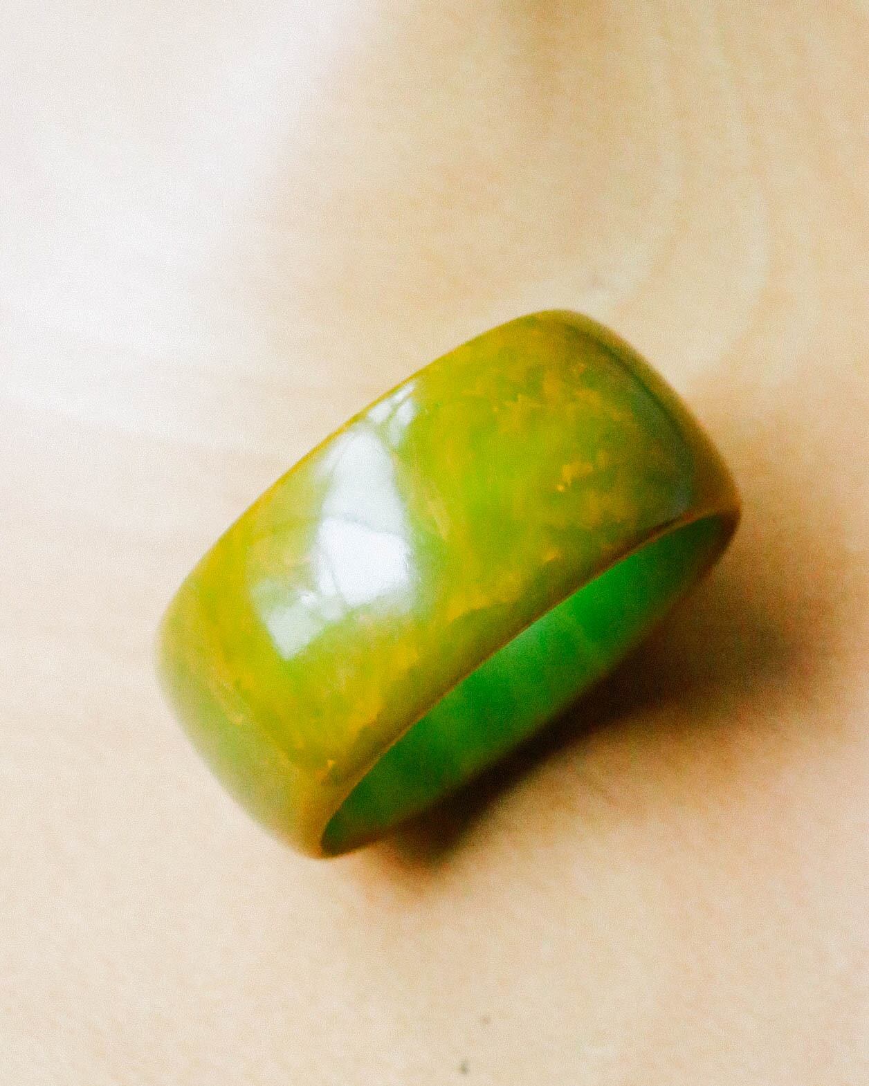 こちらのバングルはマーブル模様が特徴的で、コレクター達の中でも特に人気の高いデザインのひとつです。艶やかで独特の色と質感に魅了されます。