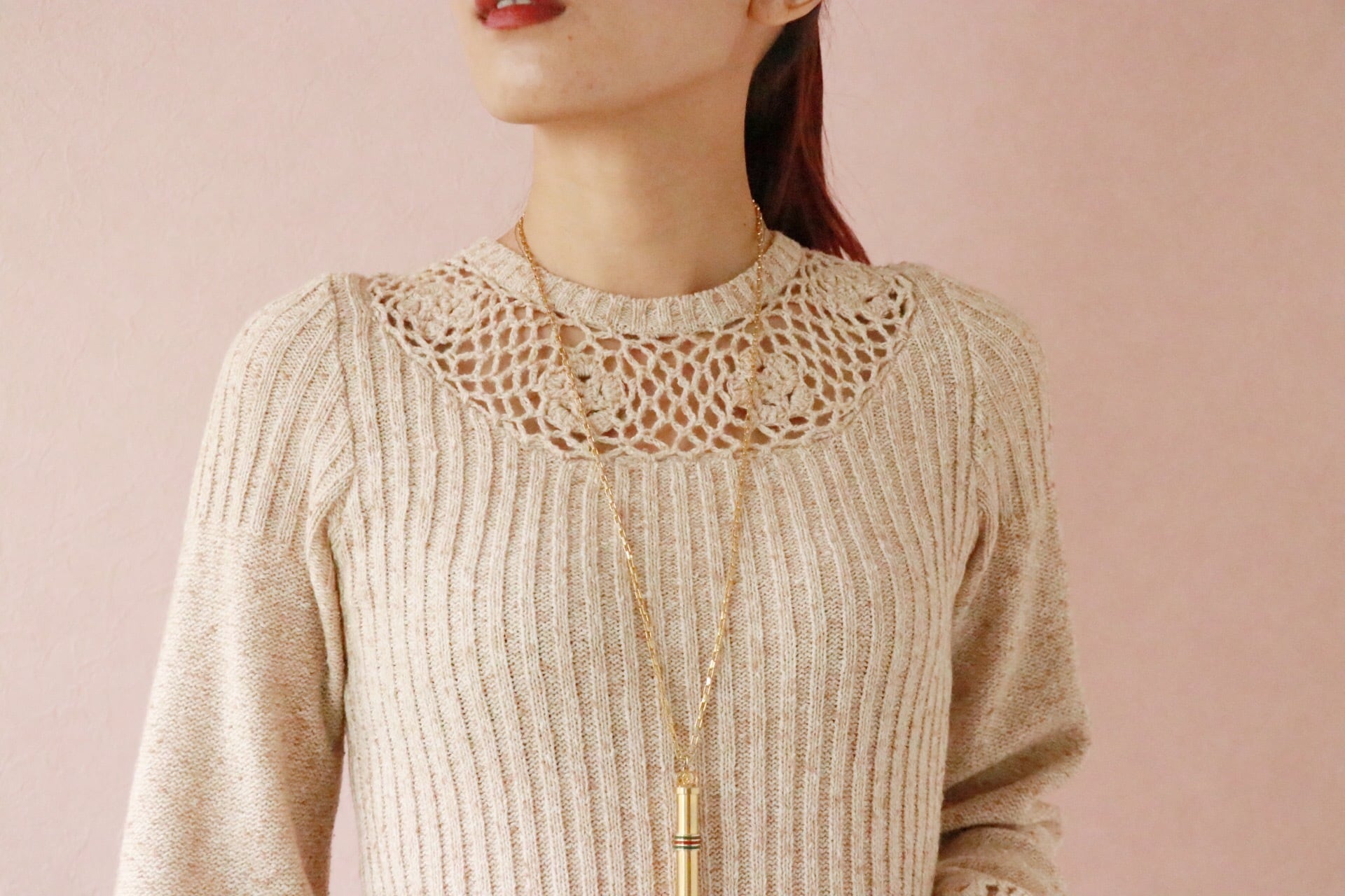 首元と袖口のお花の透かし編みデザインが抜け感を添え、女性らしい仕上がりに。