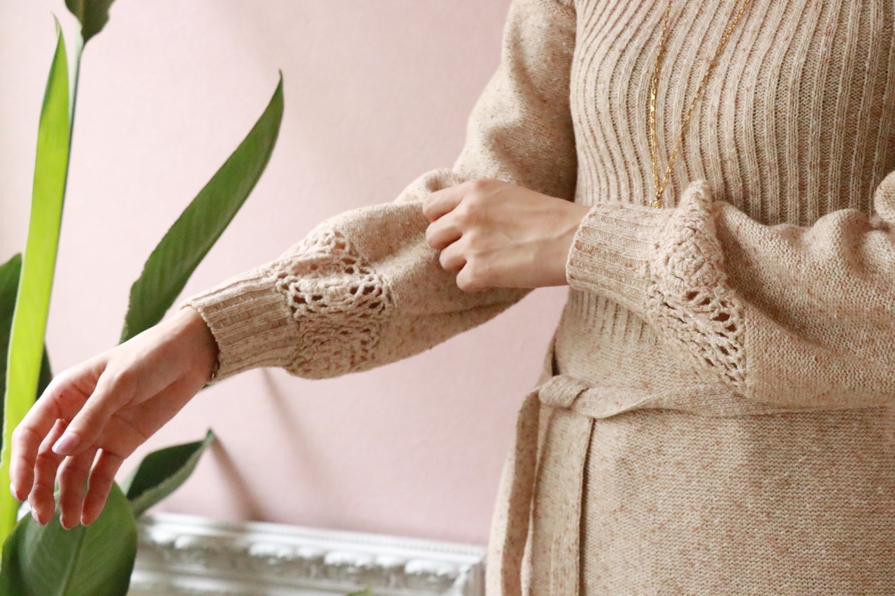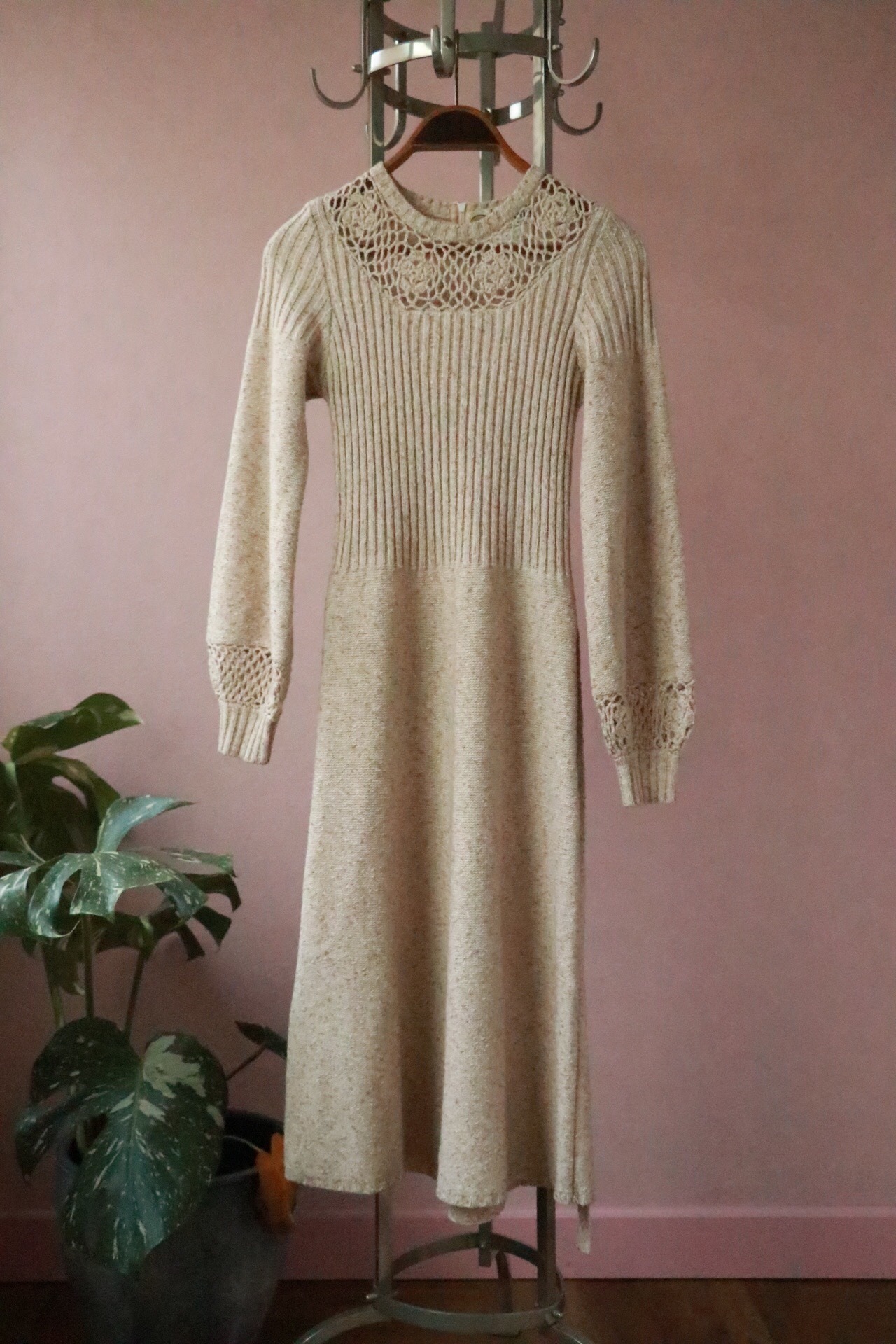 秋めくベジューカラーのこちらのクロシェットニットドレスは、1970年代のもの。