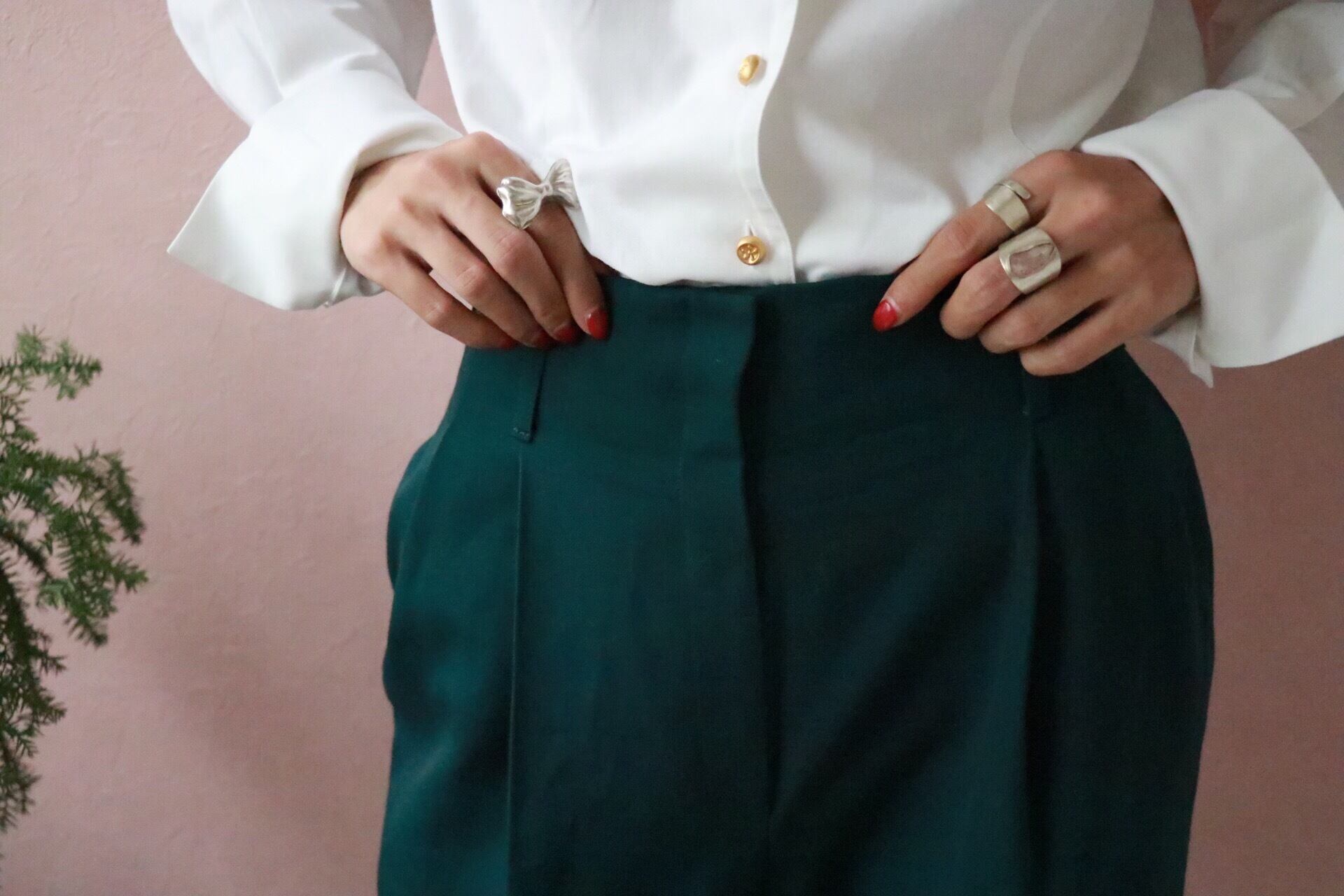 深いグリーンとブルーが混ざったような綺麗な色合いの細かいヘリンボーン生地が上品なパンツは、60年代に創立したアメリカのファッションブランド、