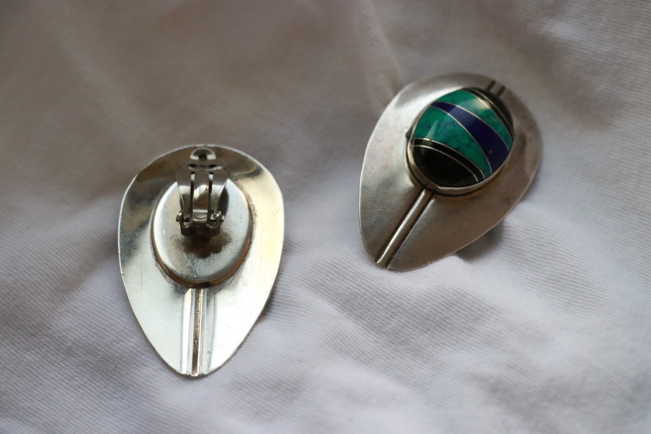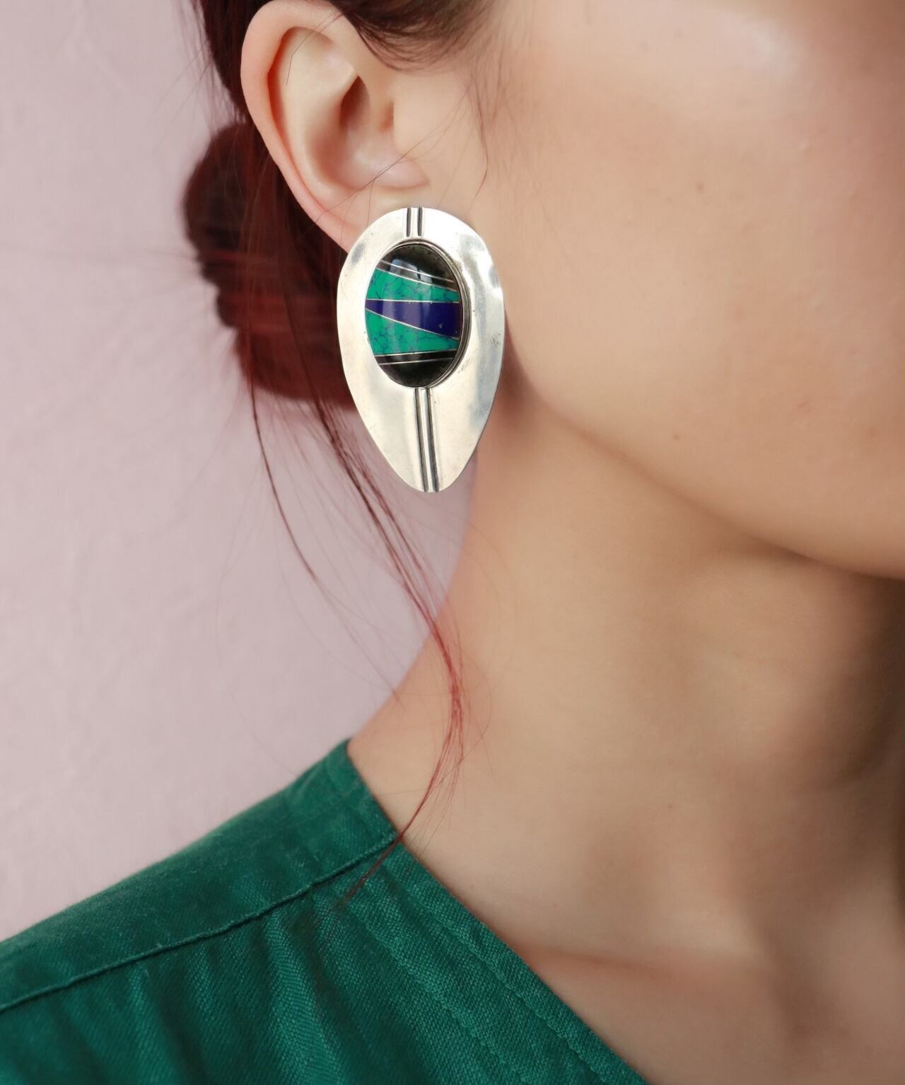 時を経たシルバー特有の味わいやラピスラズリをはじめ、ミックスされた石達のパワーにマッチする個性的なデザイン。