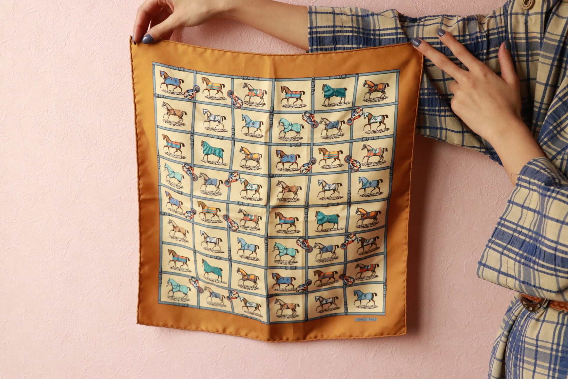こちらは、HERMES王道の馬モチーフが繊細なタッチで描かれているデザインで柄が生き、さっと巻くだけで普段のコーディネートが華やかになります。