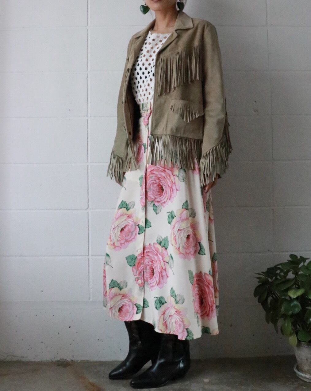 気持ち弾むフリンジデコは、今春の注目アイテムです。こちらは、ダイナミックに動くフリンジが圧倒的な存在感を放つスエードジャケット。さっと羽織るだけでブームな70'sスタイルが完成し、BOHOコーディネートに。柔らかなベージュと上質なスエード素材で着まわしやすく、カジュアルなデニムからフェミニンなスカートまでどんなボトムスとも好相性です。