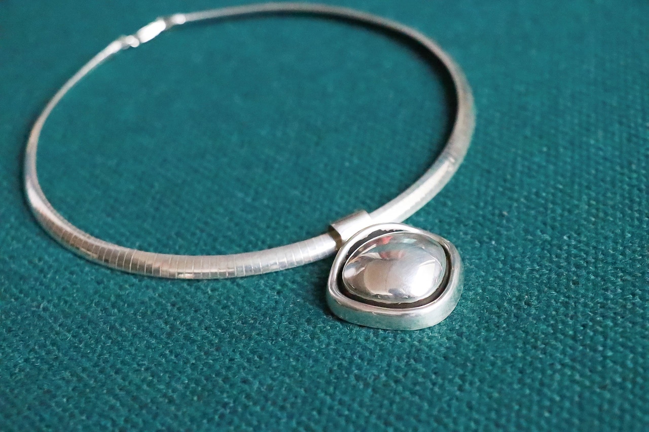 どことなく武骨さを感じるソリッドなモチーフは、地金のみで仕上げられ、春夏のお洋服と相性抜群です。首元に存在感を放つ幅太なチェーンも魅力的。
