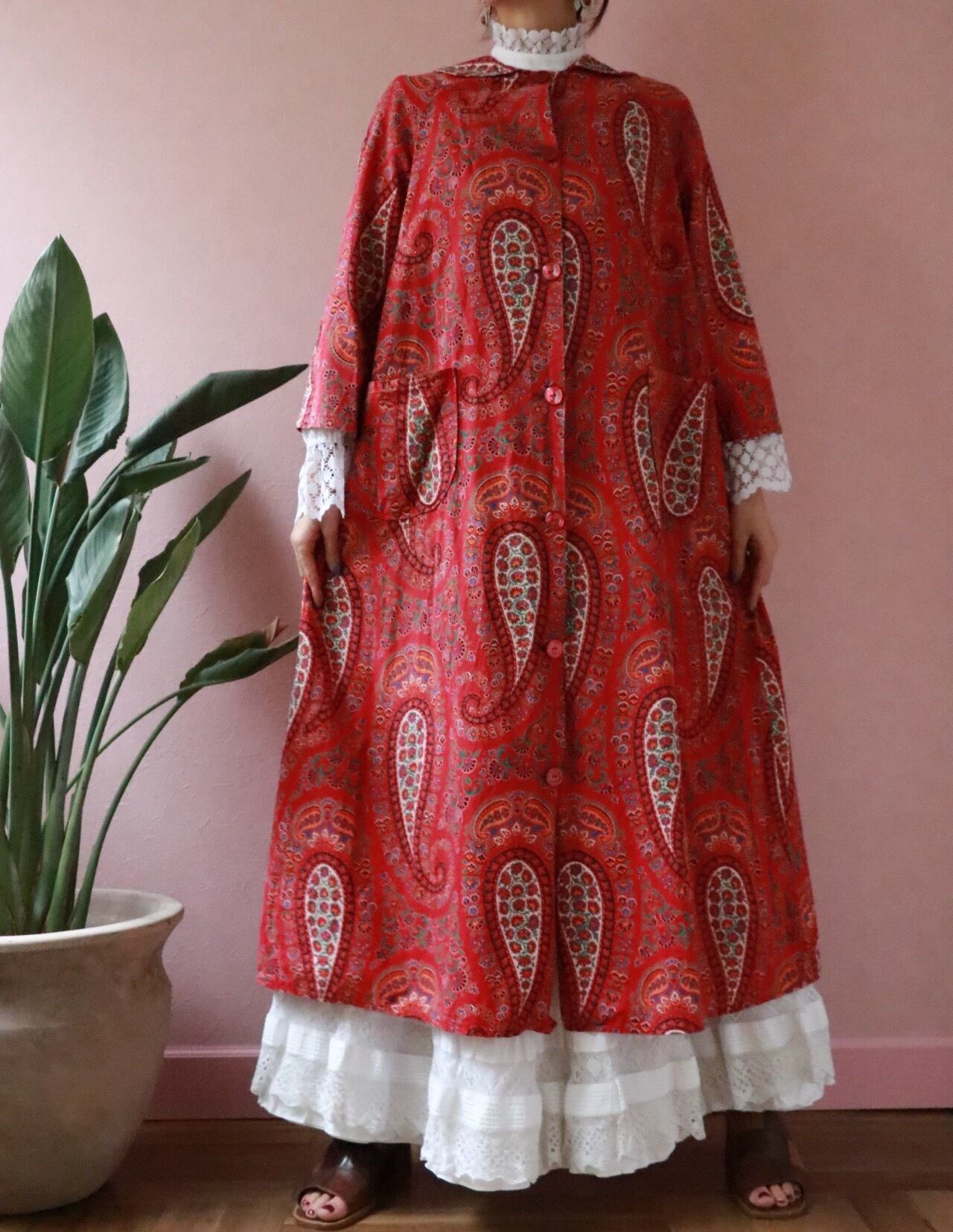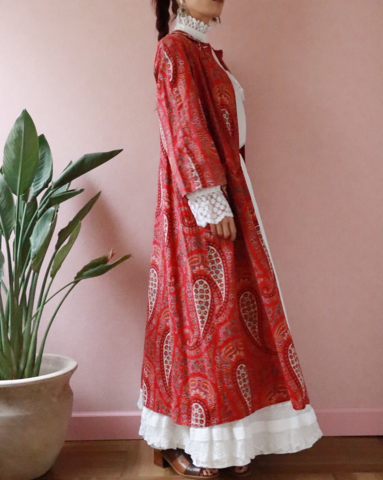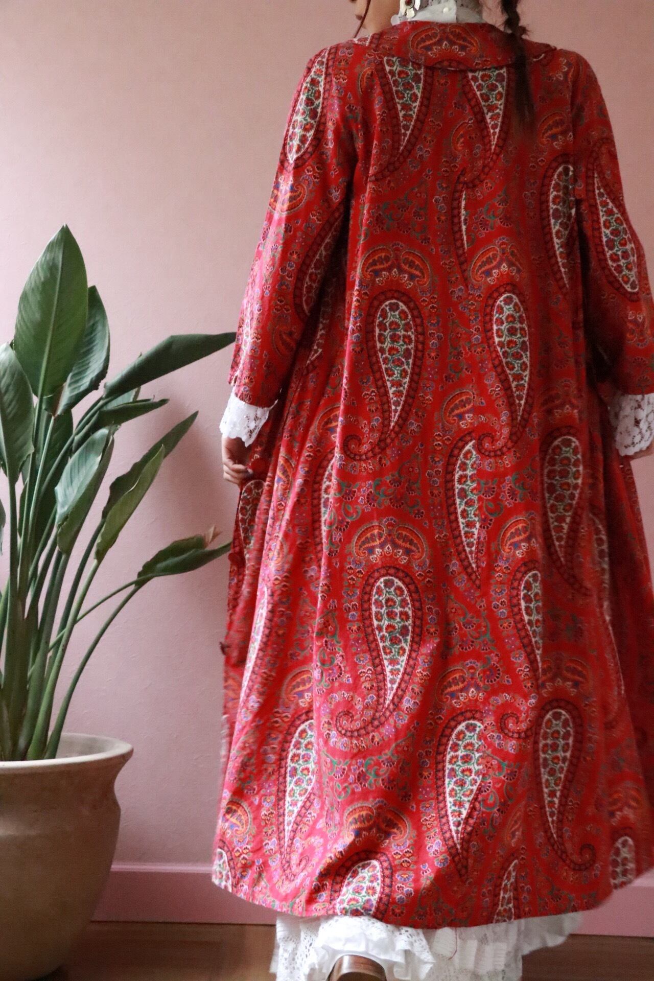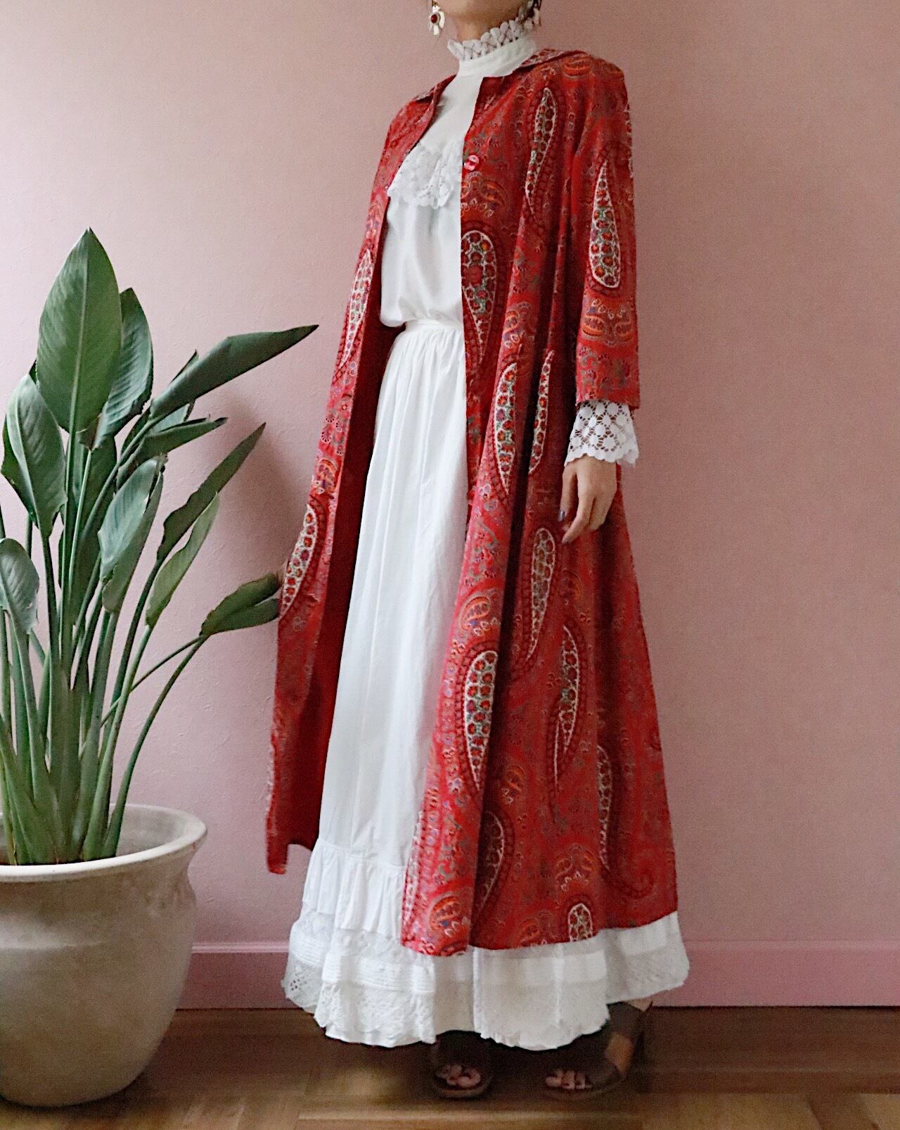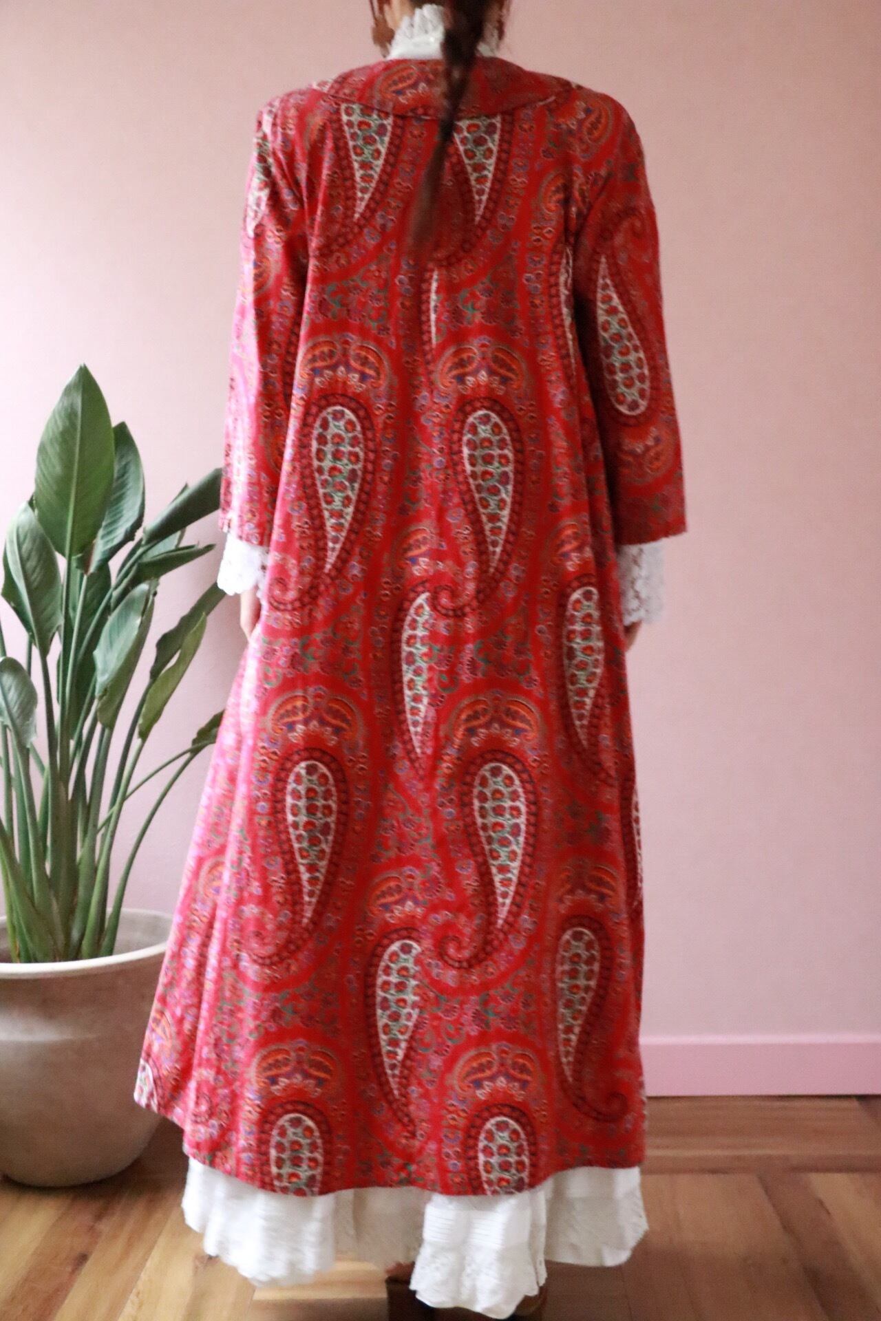 赤いペーズリーのロングコートは70年代のvintage