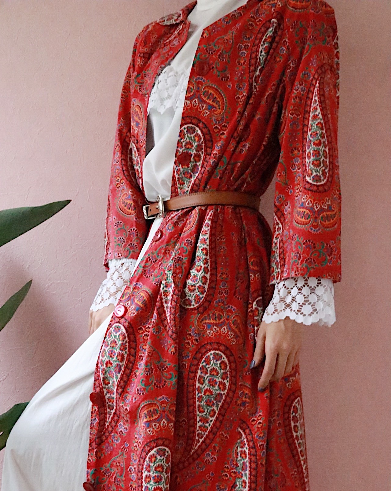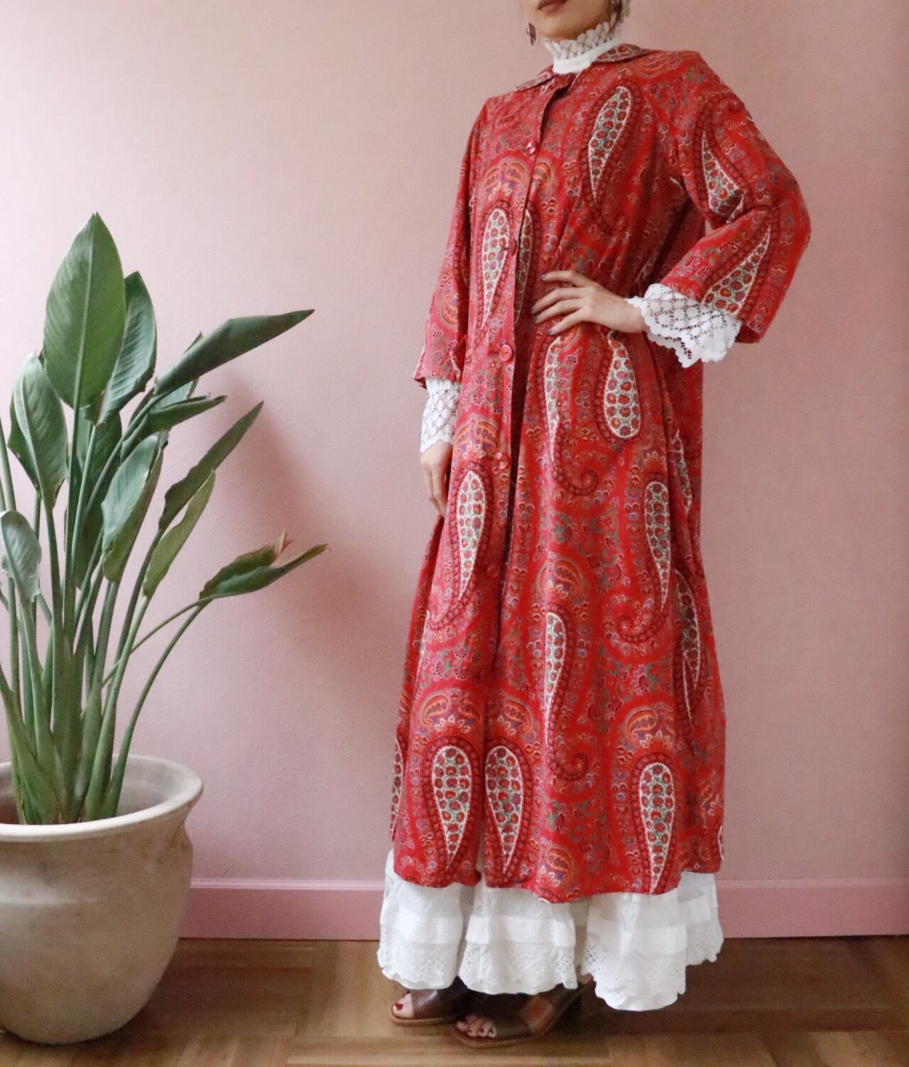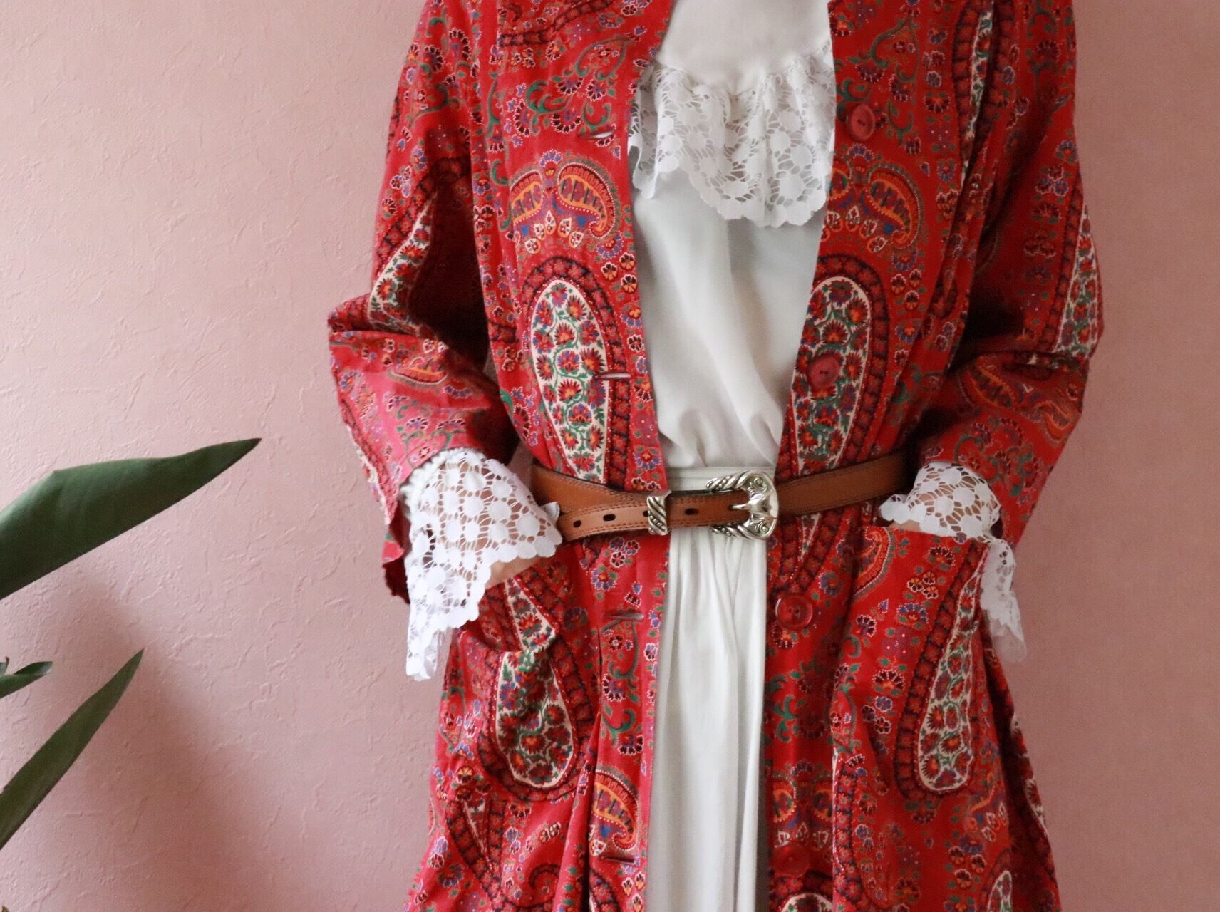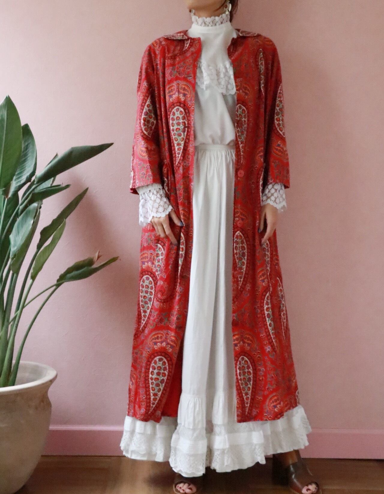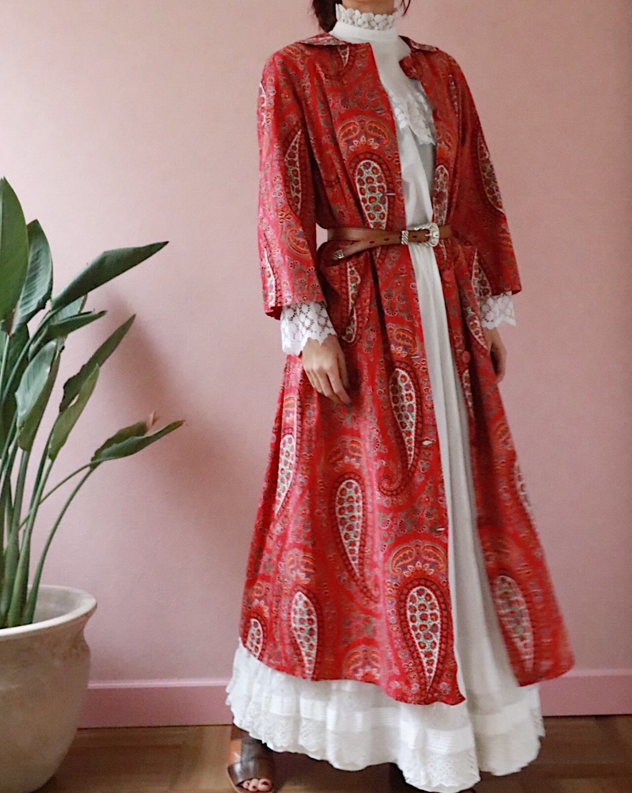 赤いペーズリーのロングコートは70年代のvintage