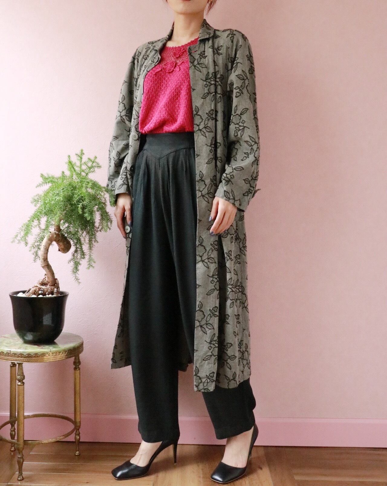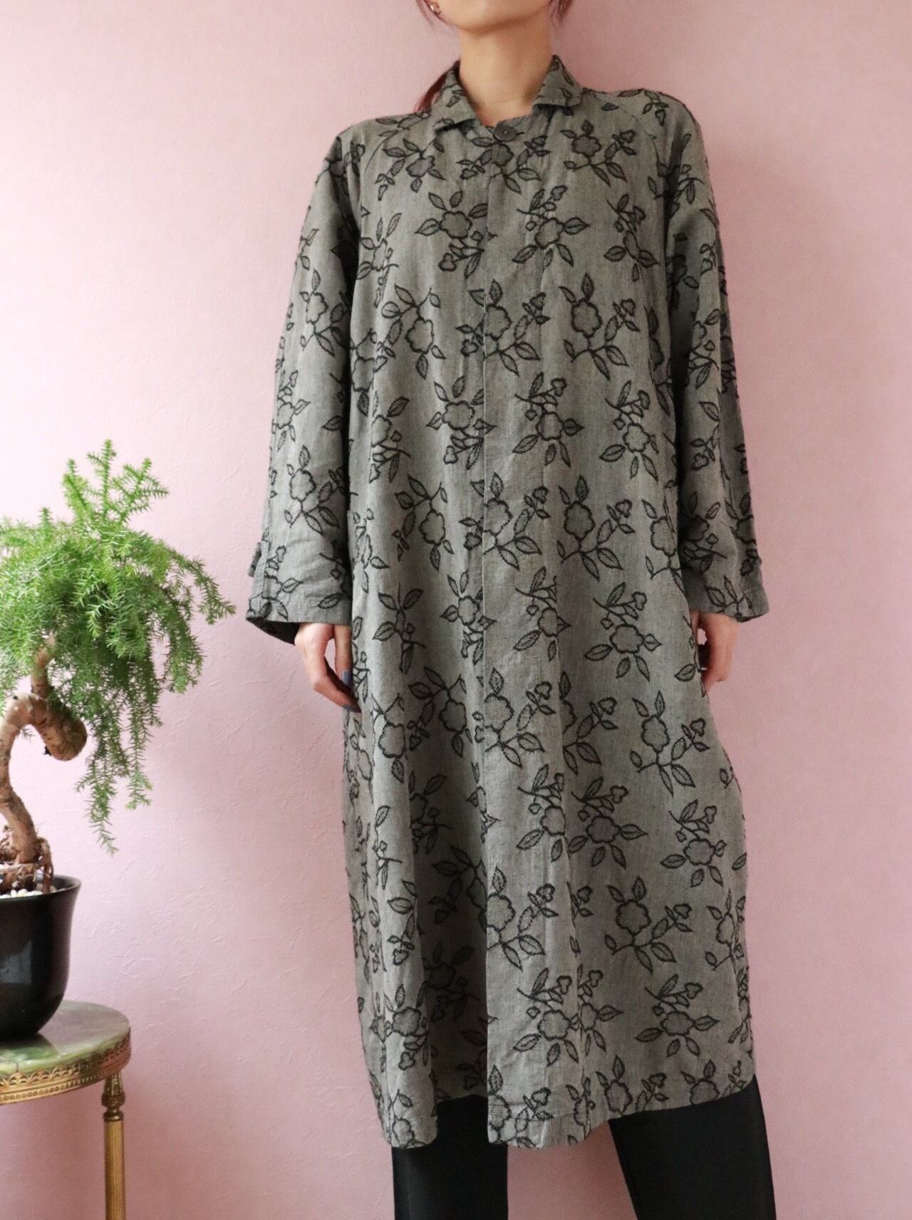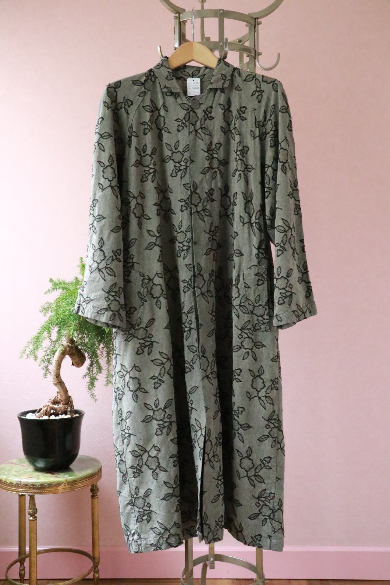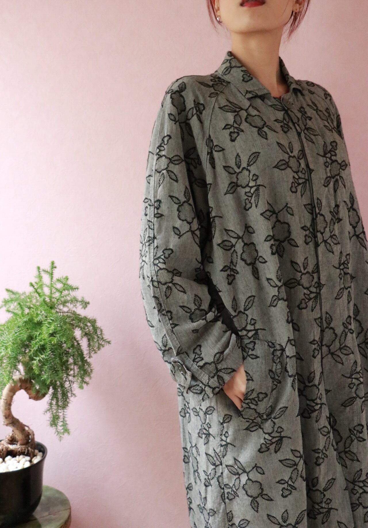 グレーのダンガリー風の生地に花柄の刺繍が施されたUSA製ロングコート。