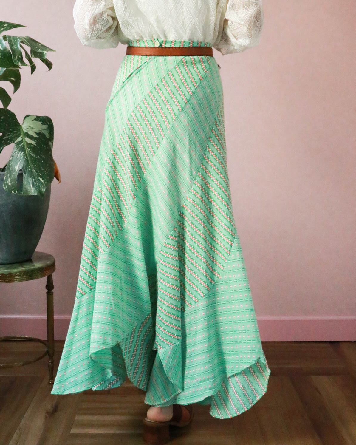 ミントグリーンベースのロングフレアスカートは70年代のvintage