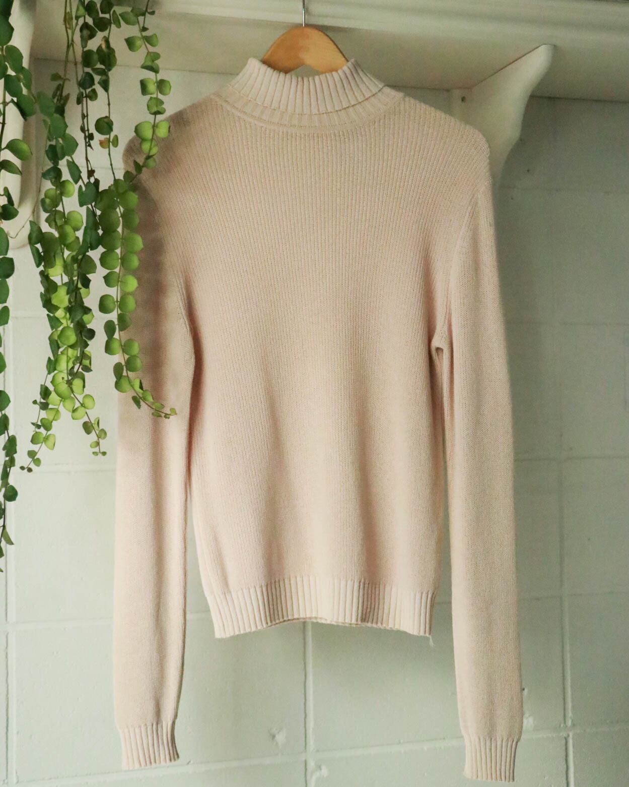 タートルネックで首元がすっぽりとおさまるデザインですが、ざっくり編みで通気性がとてもいい。素材表記はないのですがウールではなくアクリルとコットンの混紡かと思われます。