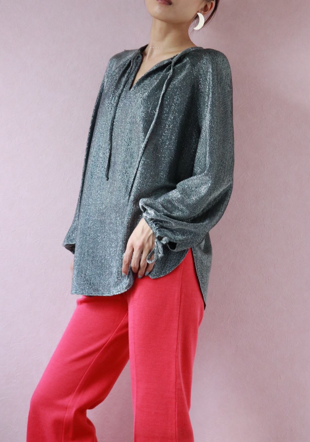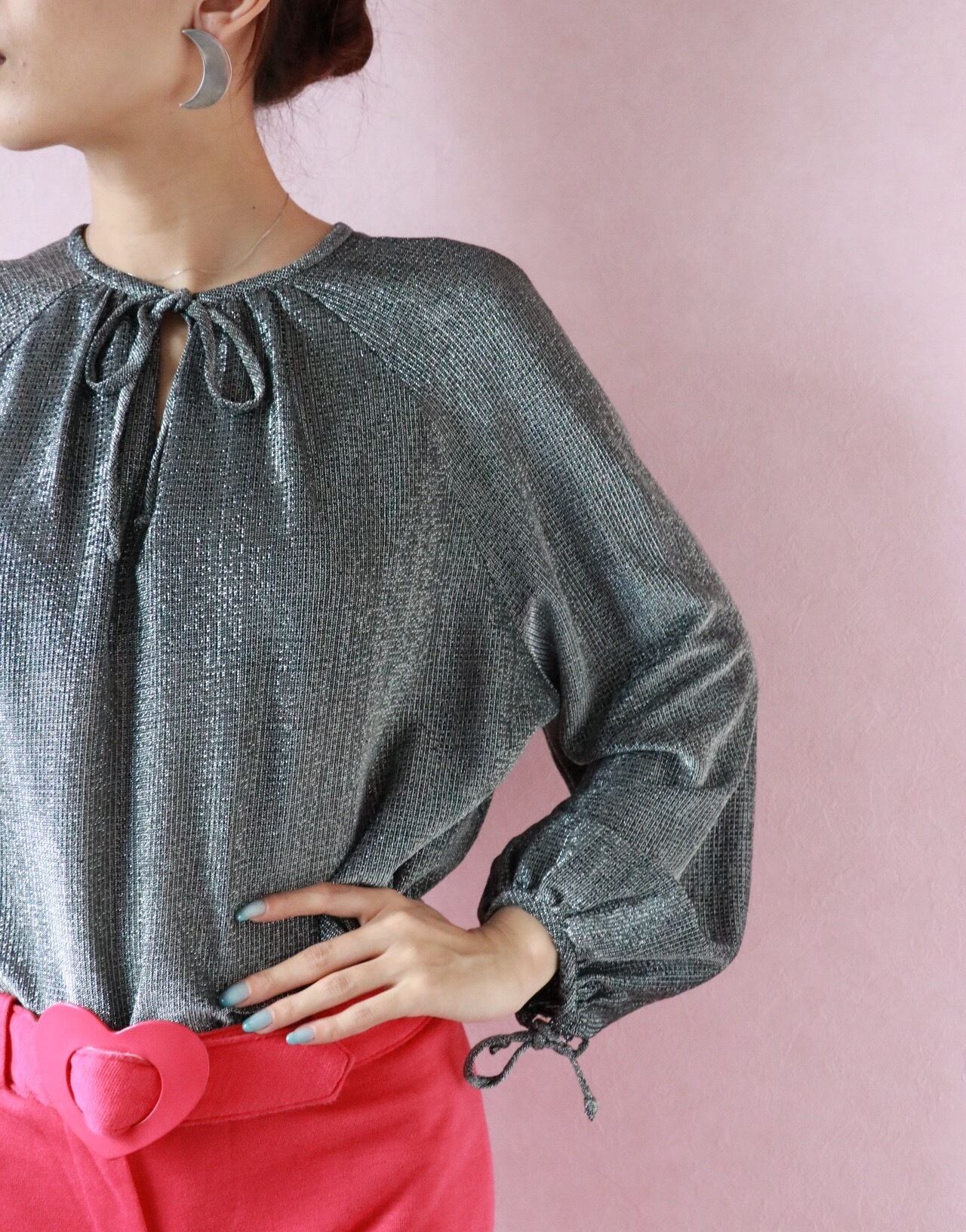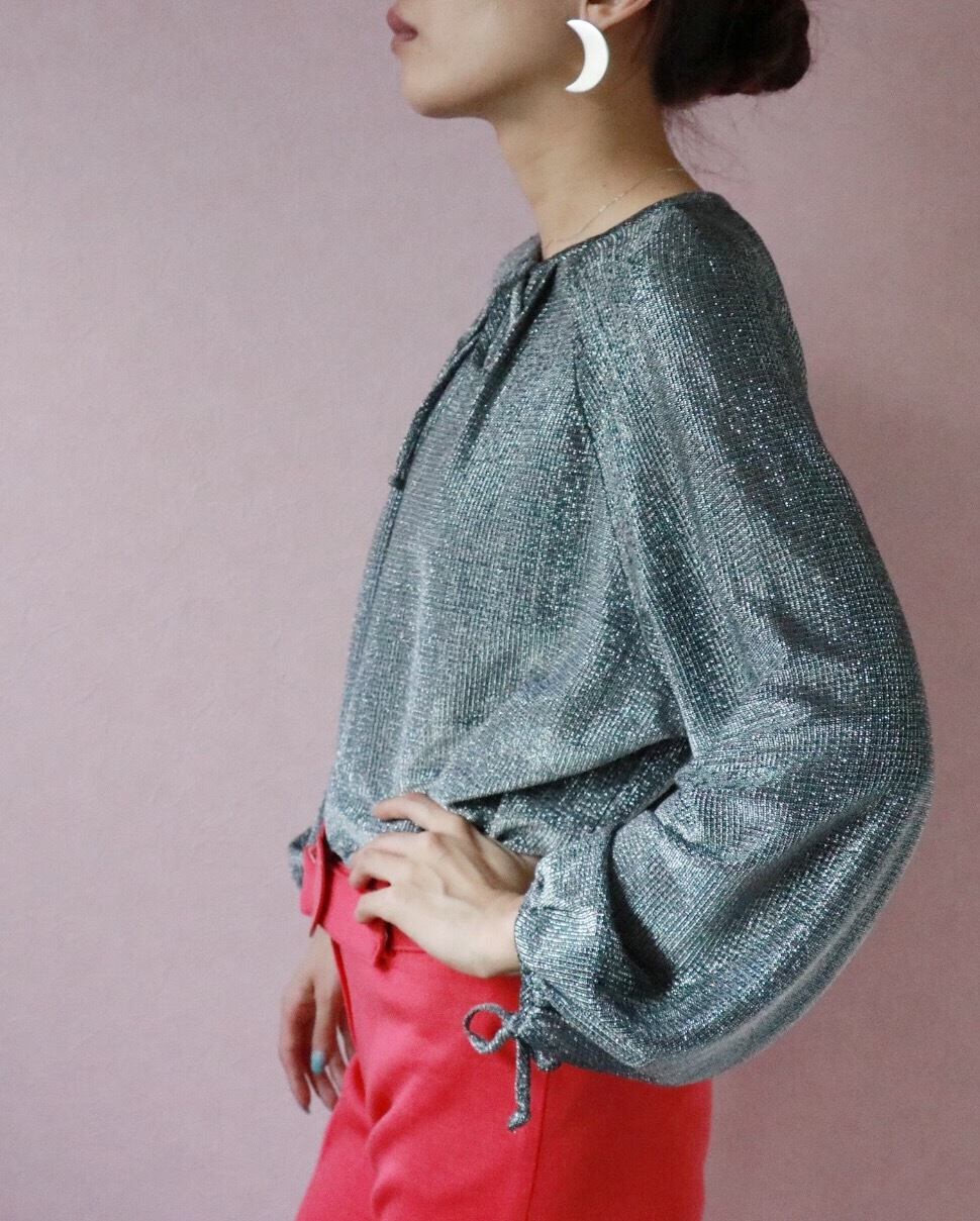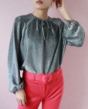 煌めくラメ素材やコンシャスな袖、ふんわりとしたスモッグシルエットが大人フェミニンを演出する1970年代のブラウス。