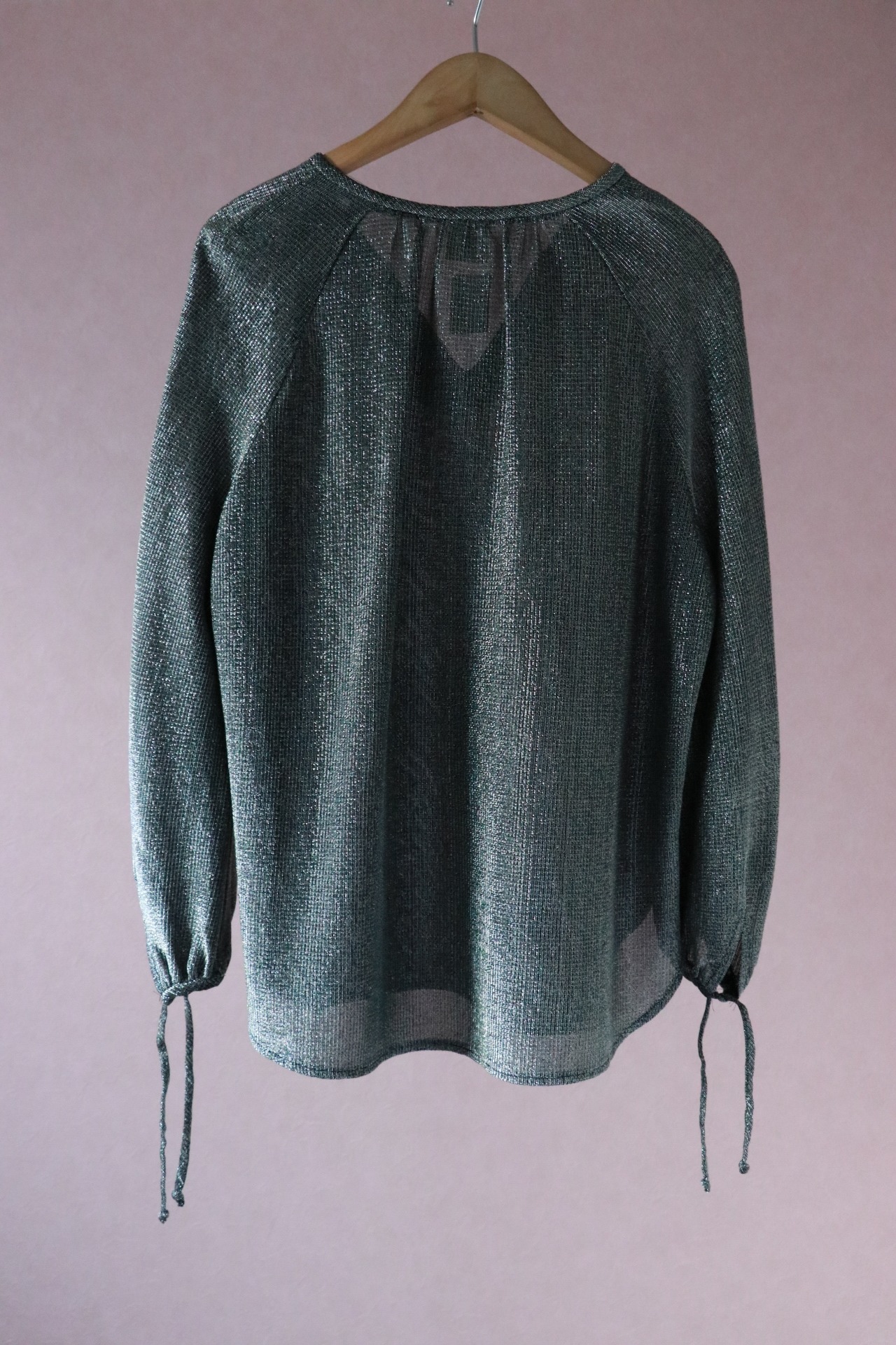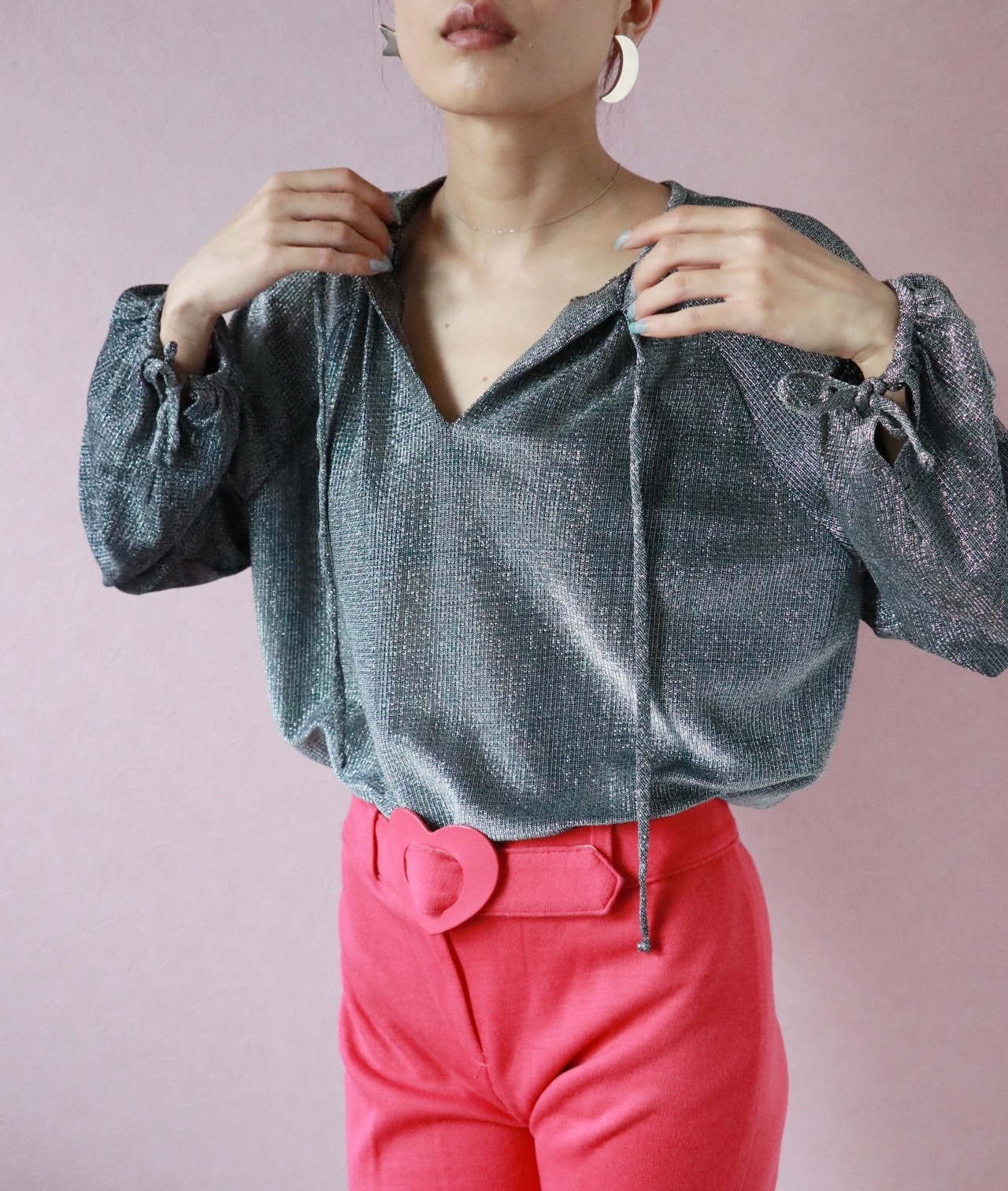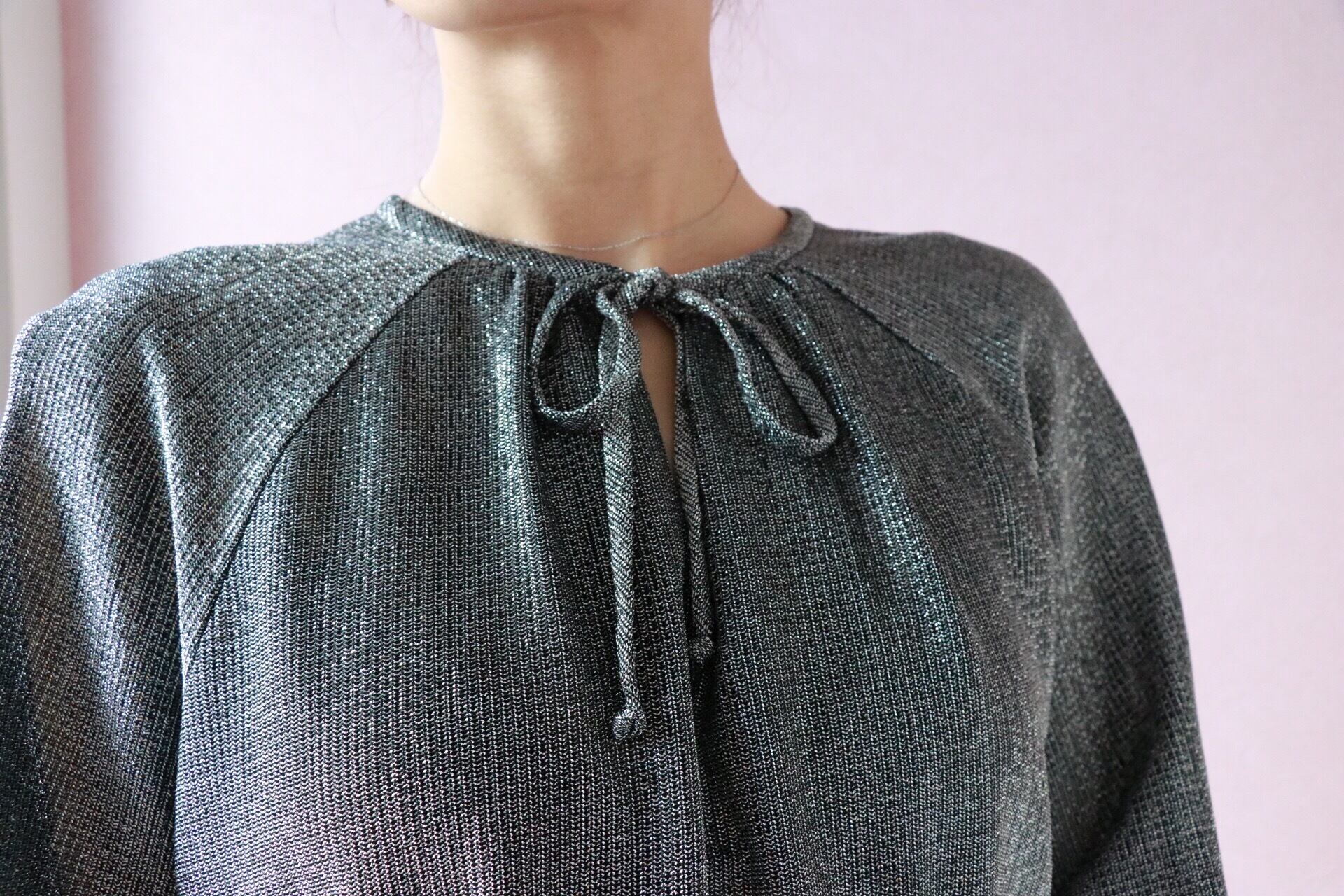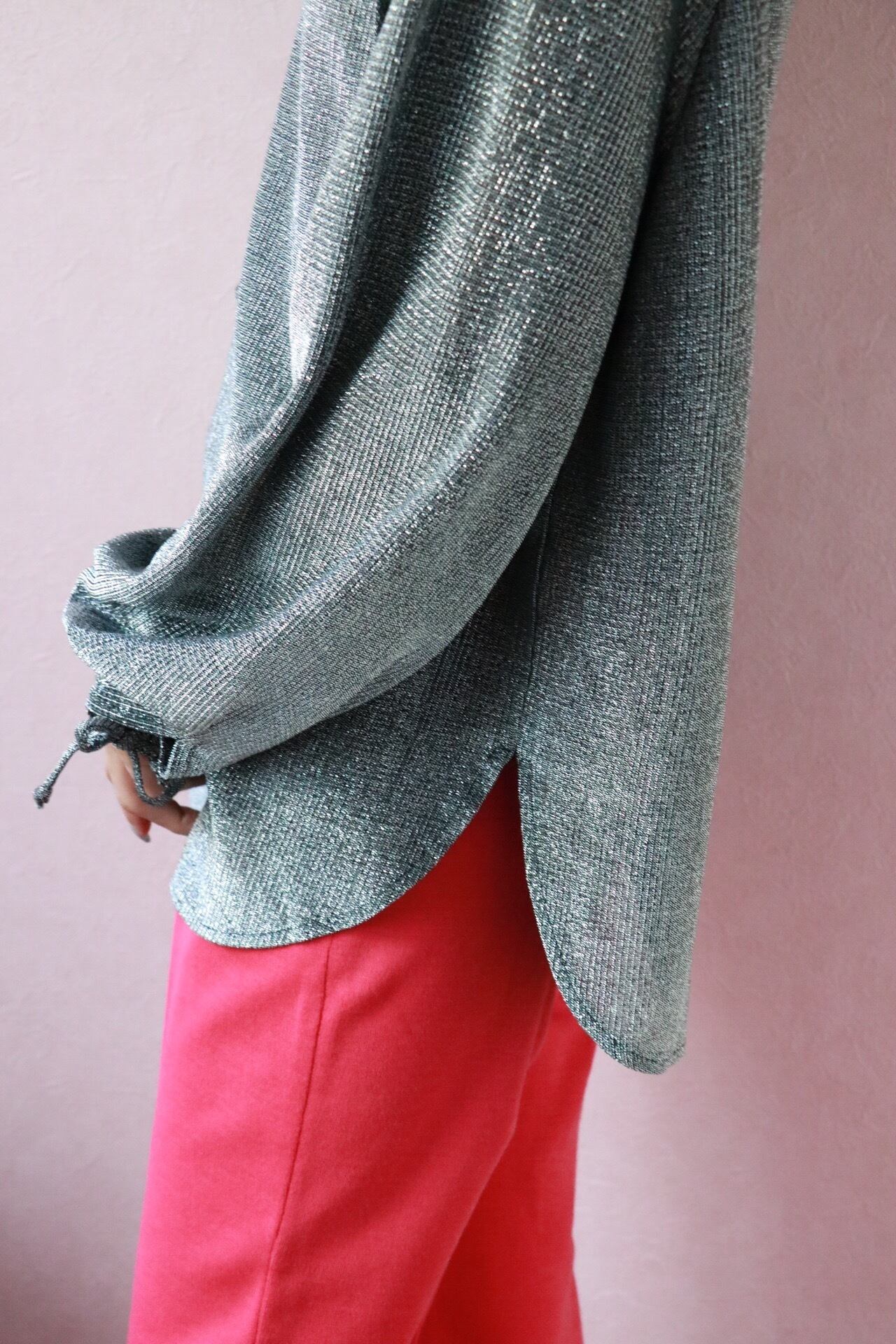 煌めくラメ素材やコンシャスな袖、ふんわりとしたスモッグシルエットが大人フェミニンを演出する1970年代のブラウス。