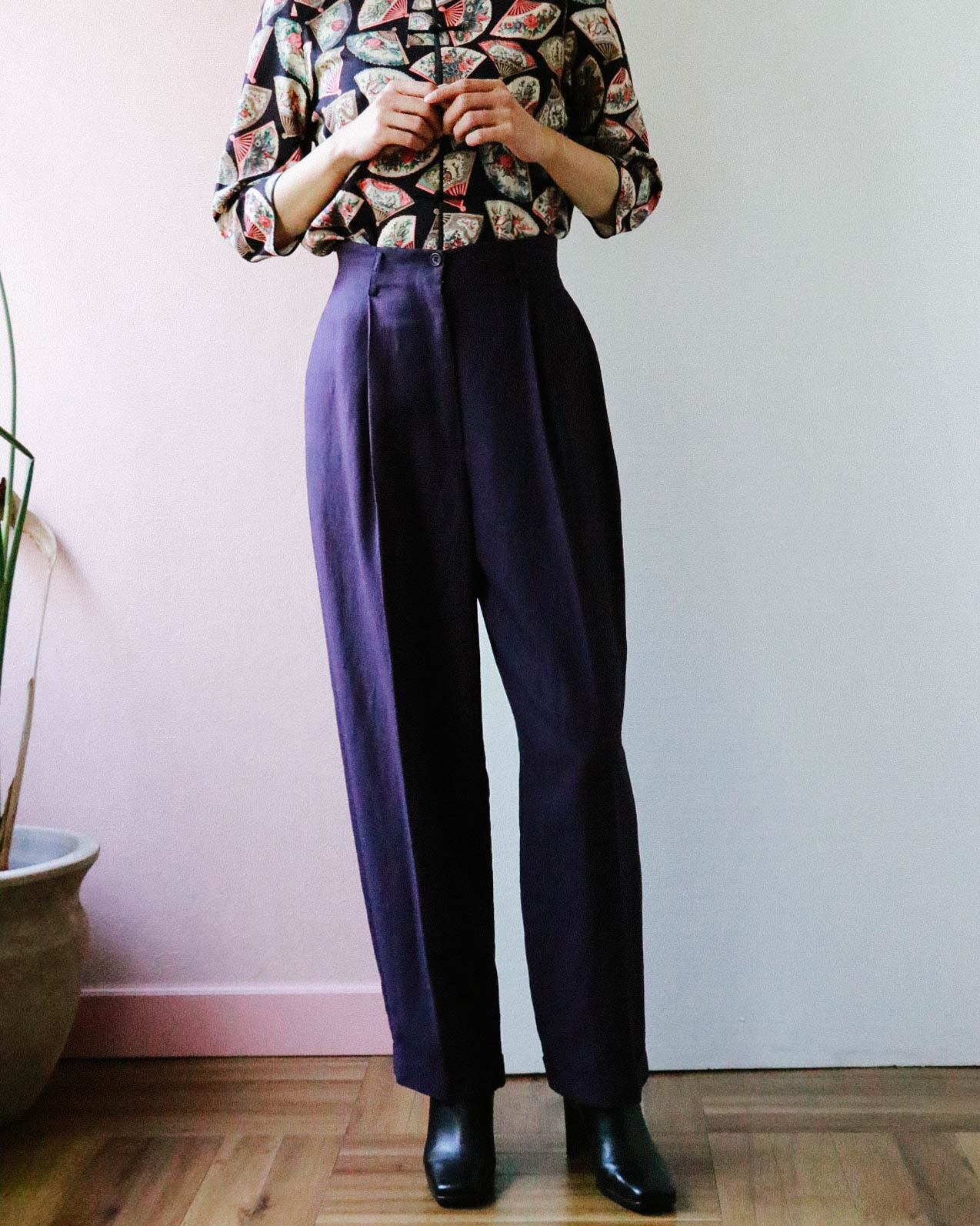 センターにしっかりとしたラインが入ったダークパープルのパンツ