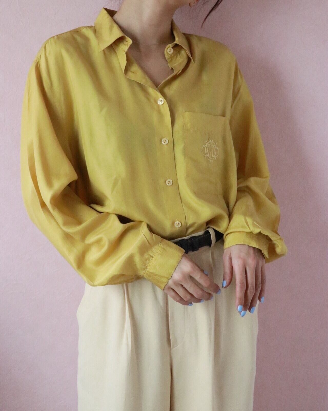 落ち着きあるイエローカラーがトレンドムードを高めるシルクシャツです。