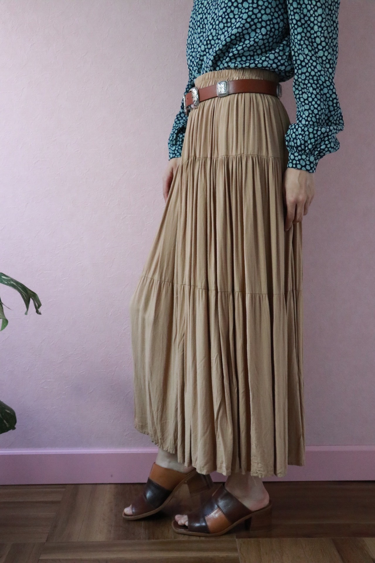ボリュームをおさえたシルエットがシーズンムードを高めるティアードスカート。