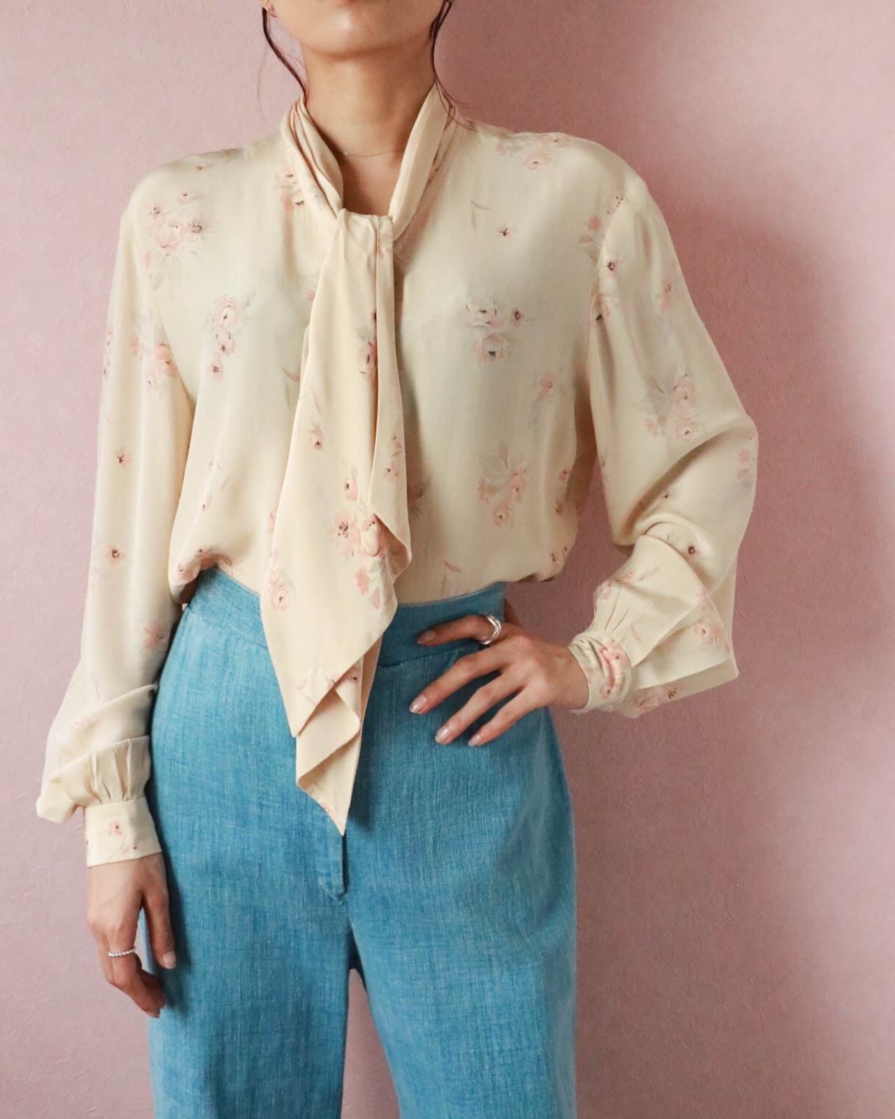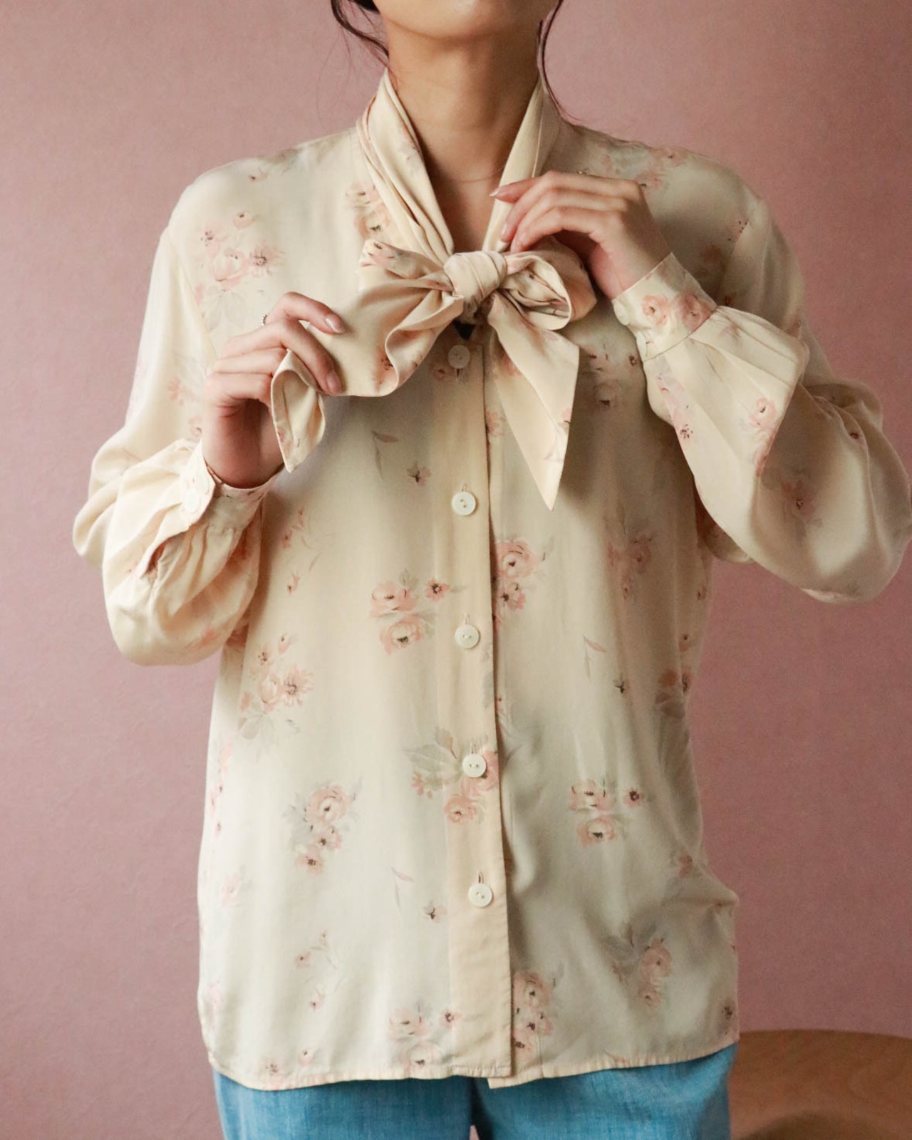 薄いベージュベースにアンティークの花柄がプリントされたvintageのシルクブラウスが入荷しました