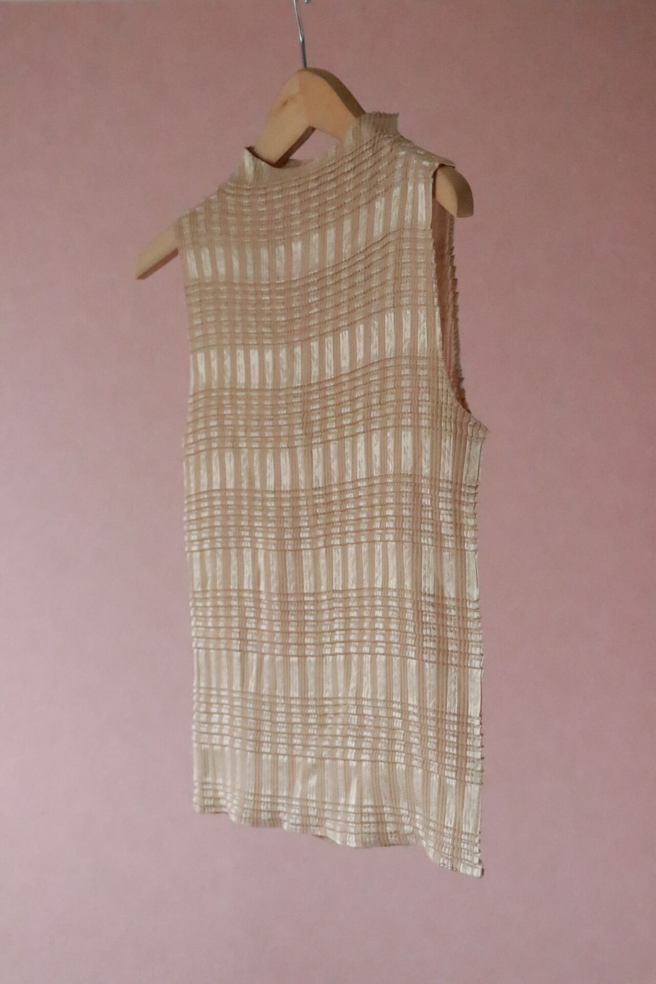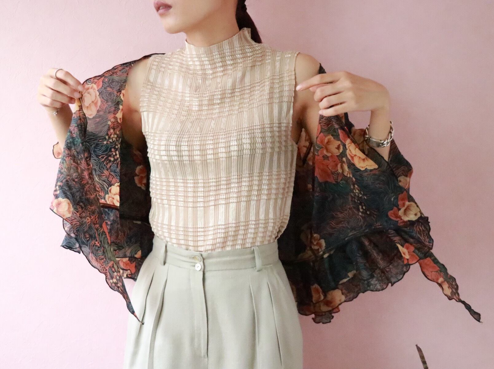 センシュアルな透け感に気品溢れるベージュゴールドのハイネックトップス。