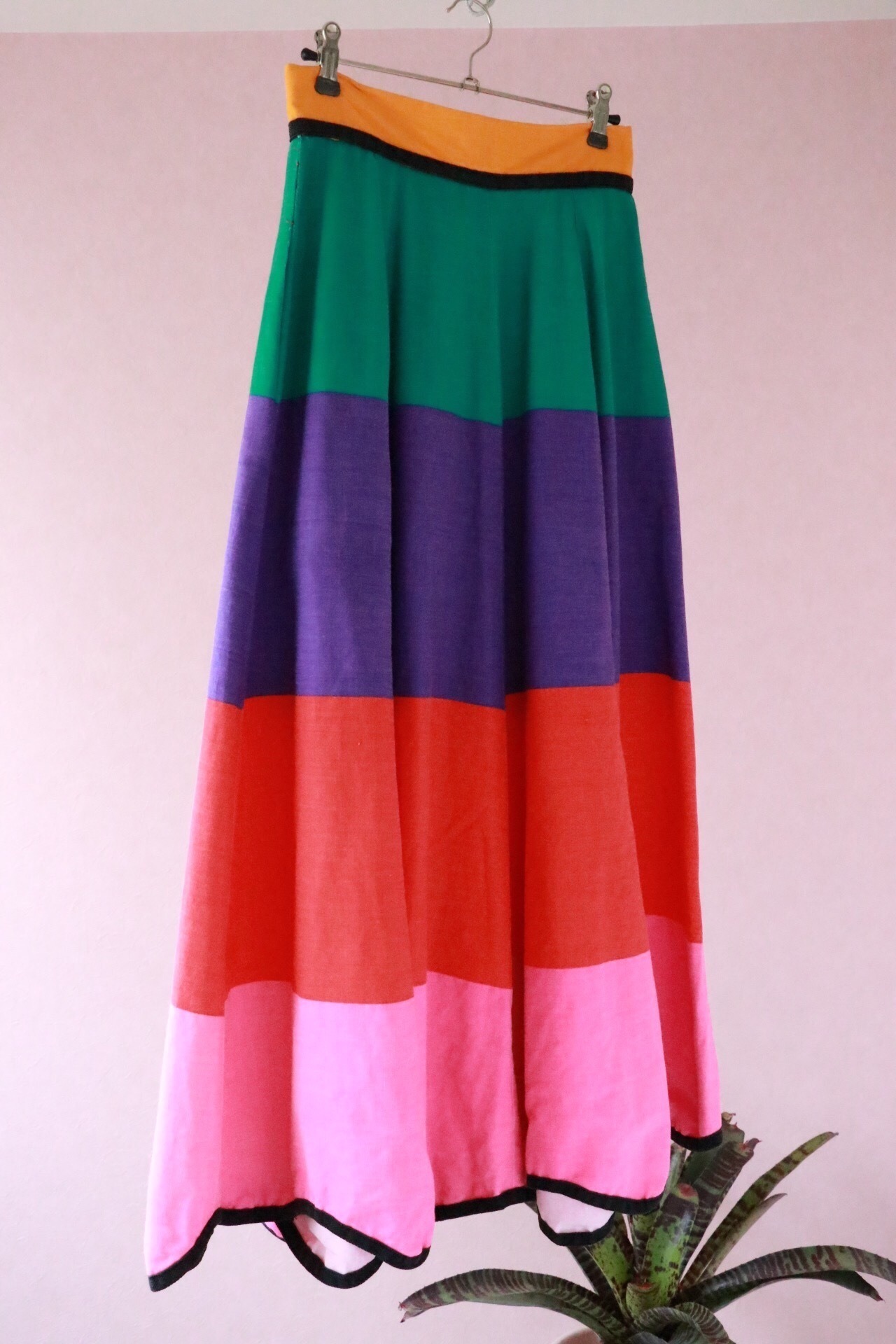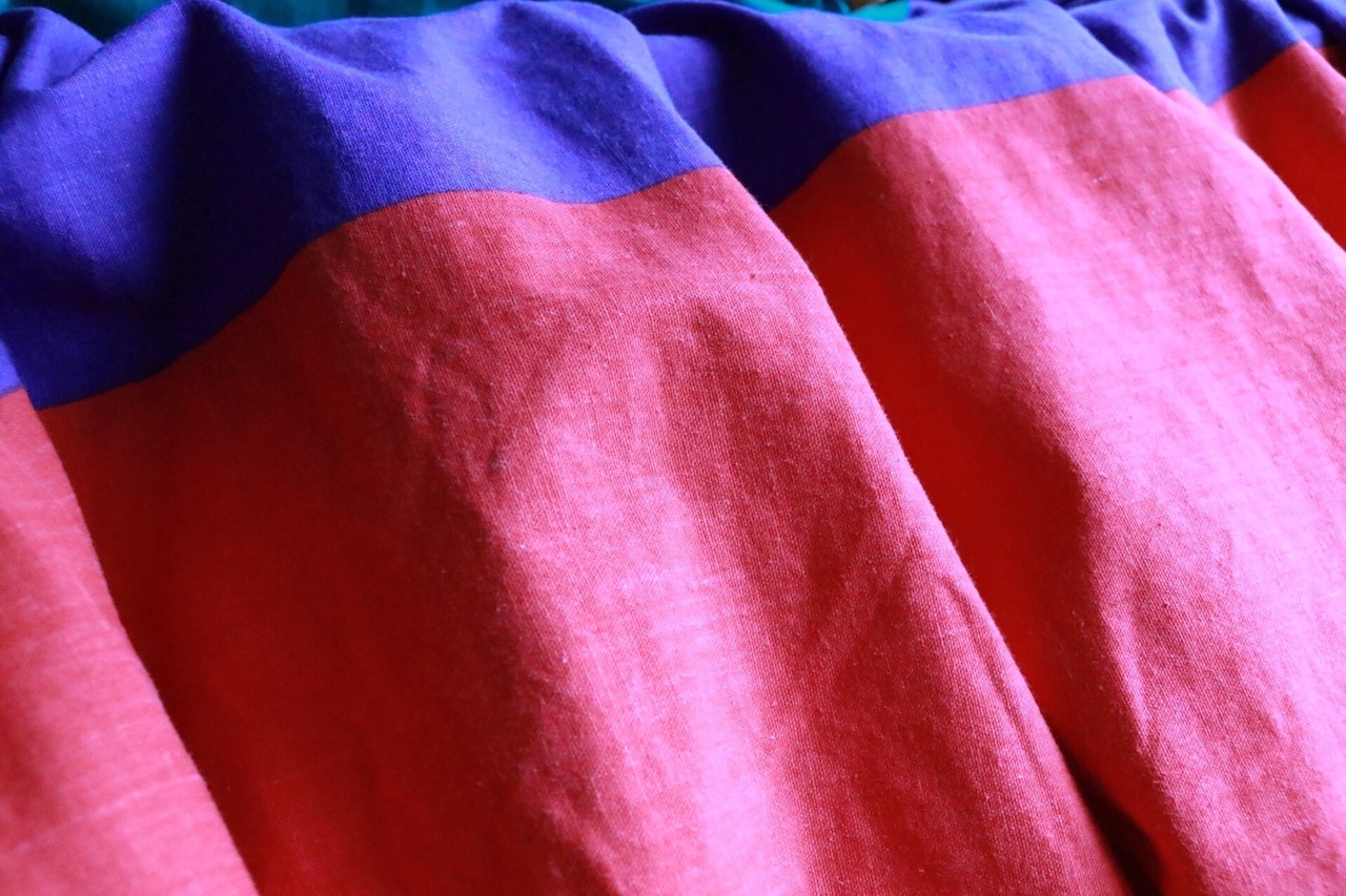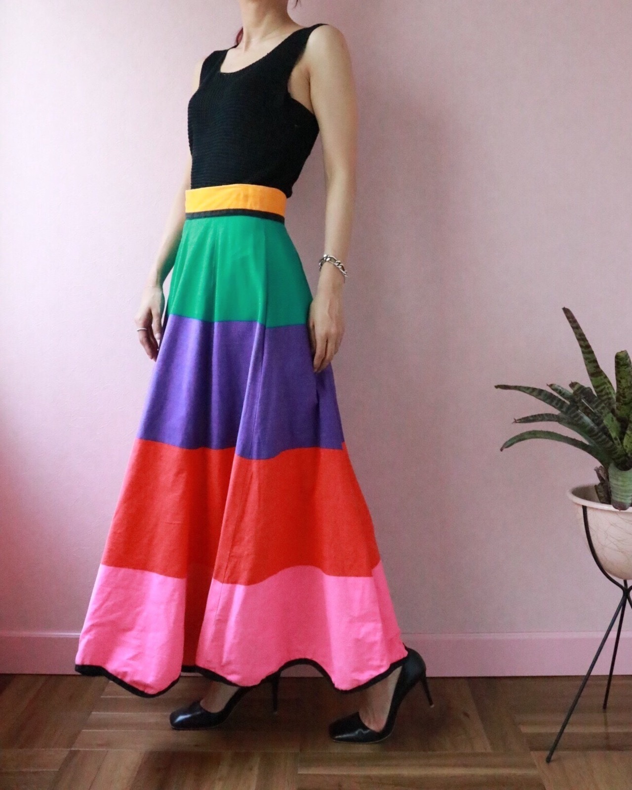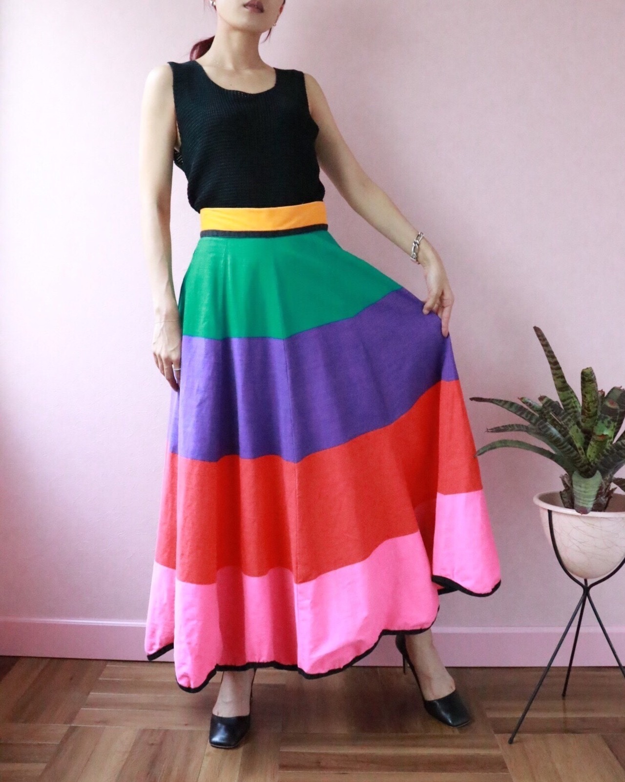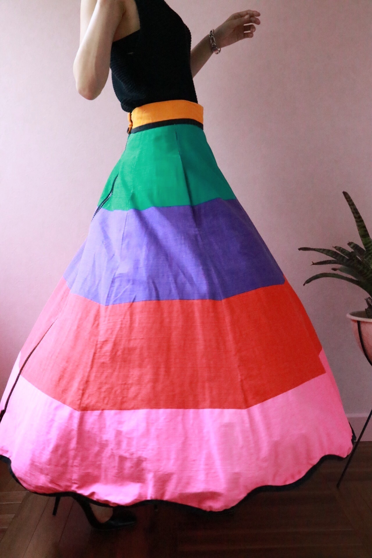 厳選されたビビッドなカラーがレイヤーされたデザイン。裾元のパイピングがスカラップになっているディテールにもこだわりが感じられます。