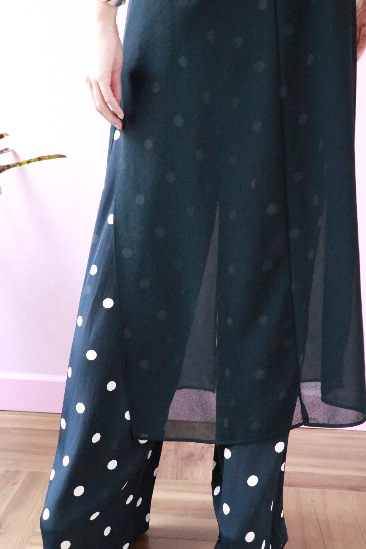こちらはチャイニーズカラーやアジアンノットボタンがオリエンタルムードを一気に高めてくれる一枚。さりげなく透け感もあり、深めのスリットのディテールも含め艶っぽさ満載です。