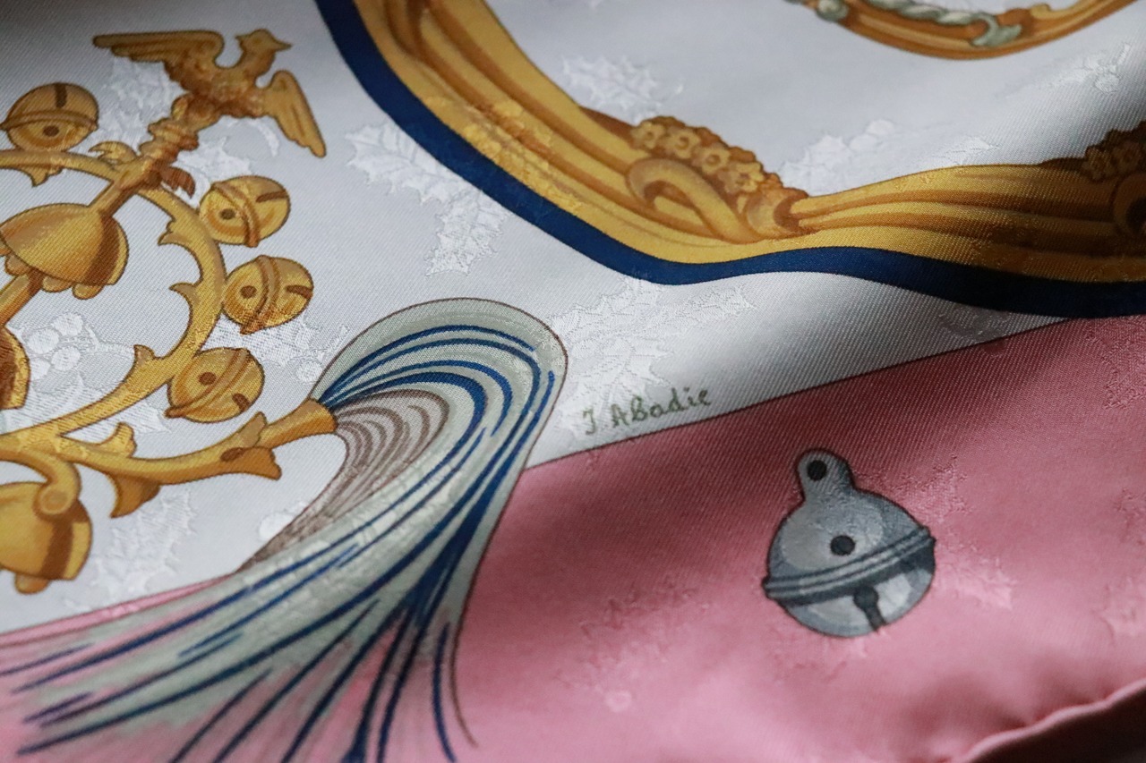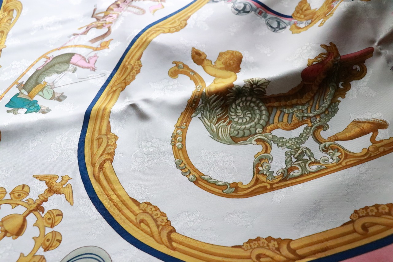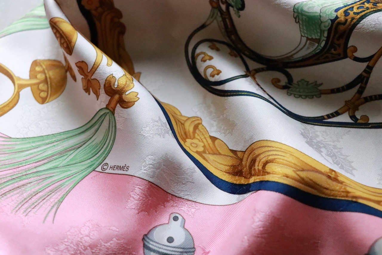 エルメス王道のクラシックデザインと淡いピンクでパイピングされたカレ。