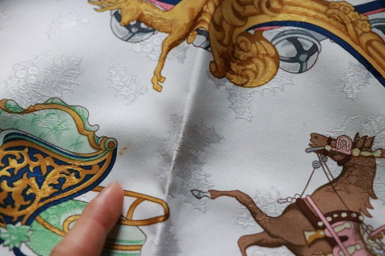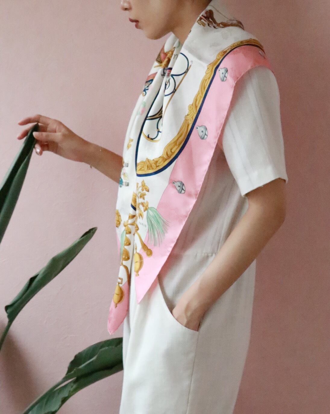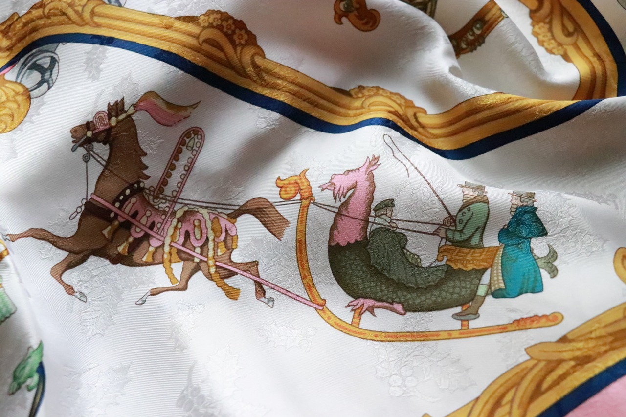 エルメス王道のクラシックデザインと淡いピンクでパイピングされたカレ。