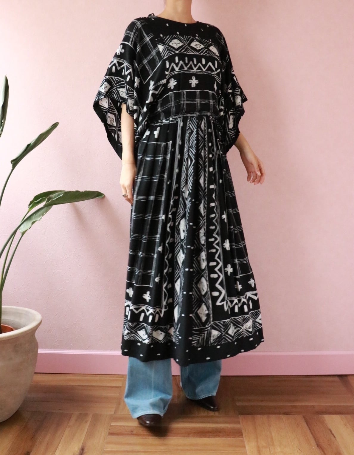 民族調のプリントにユニークなシルエットが特徴的な1970年代のドレスはUSA製。