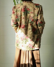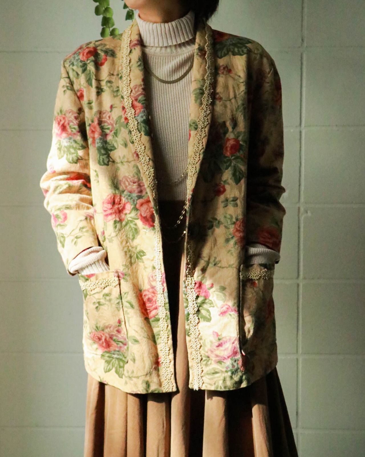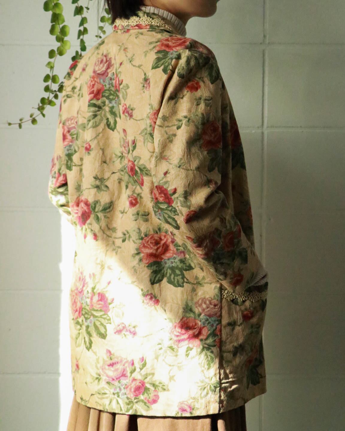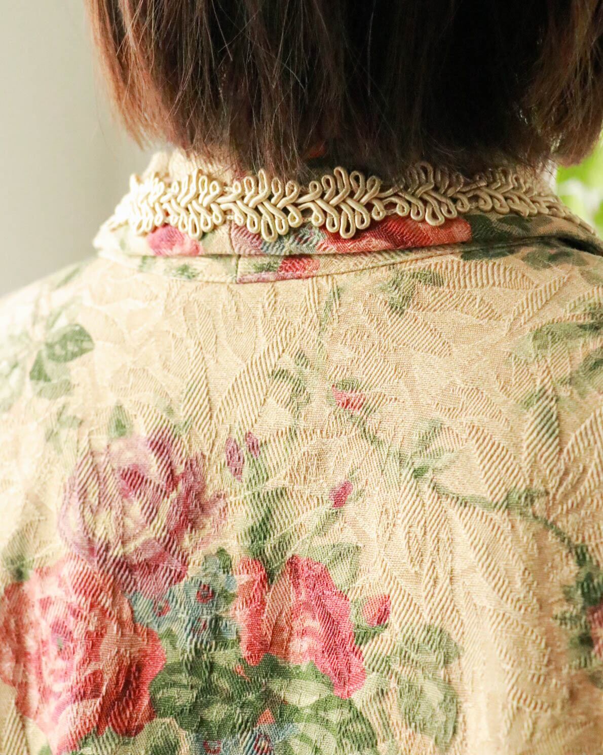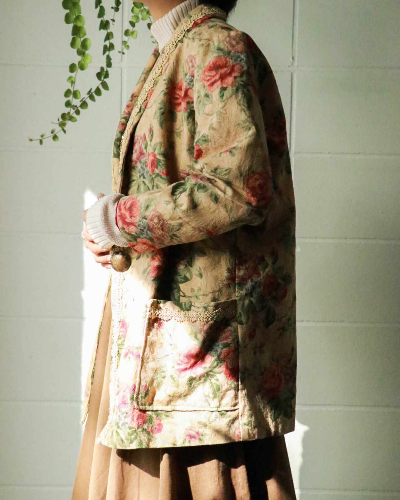 ベージュカラーの花柄ジャケット。特徴的な大きめのフロントボタンに襟や