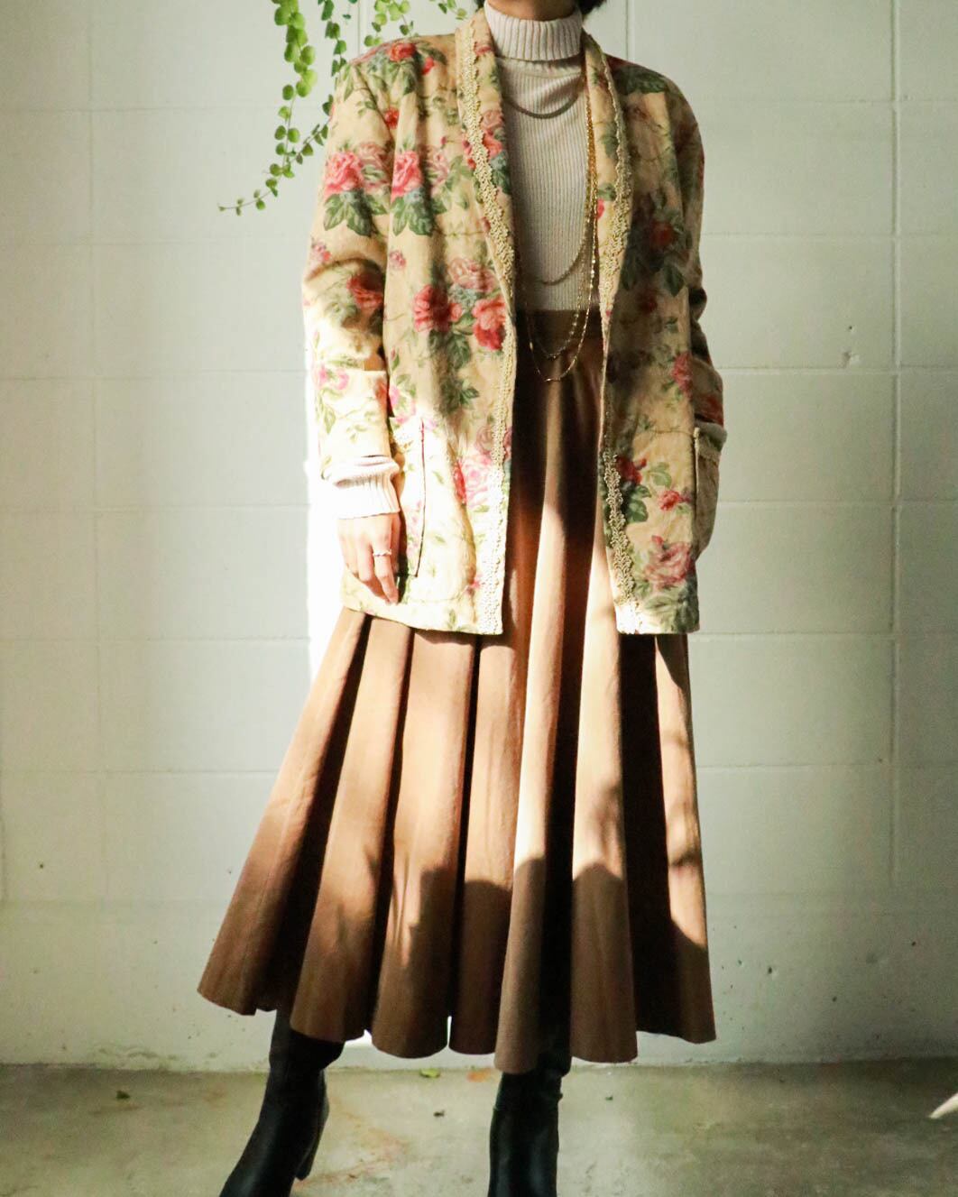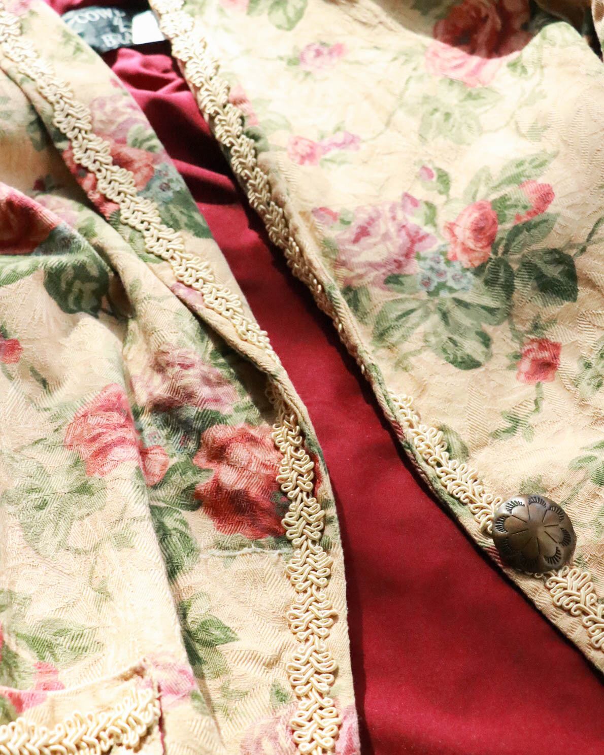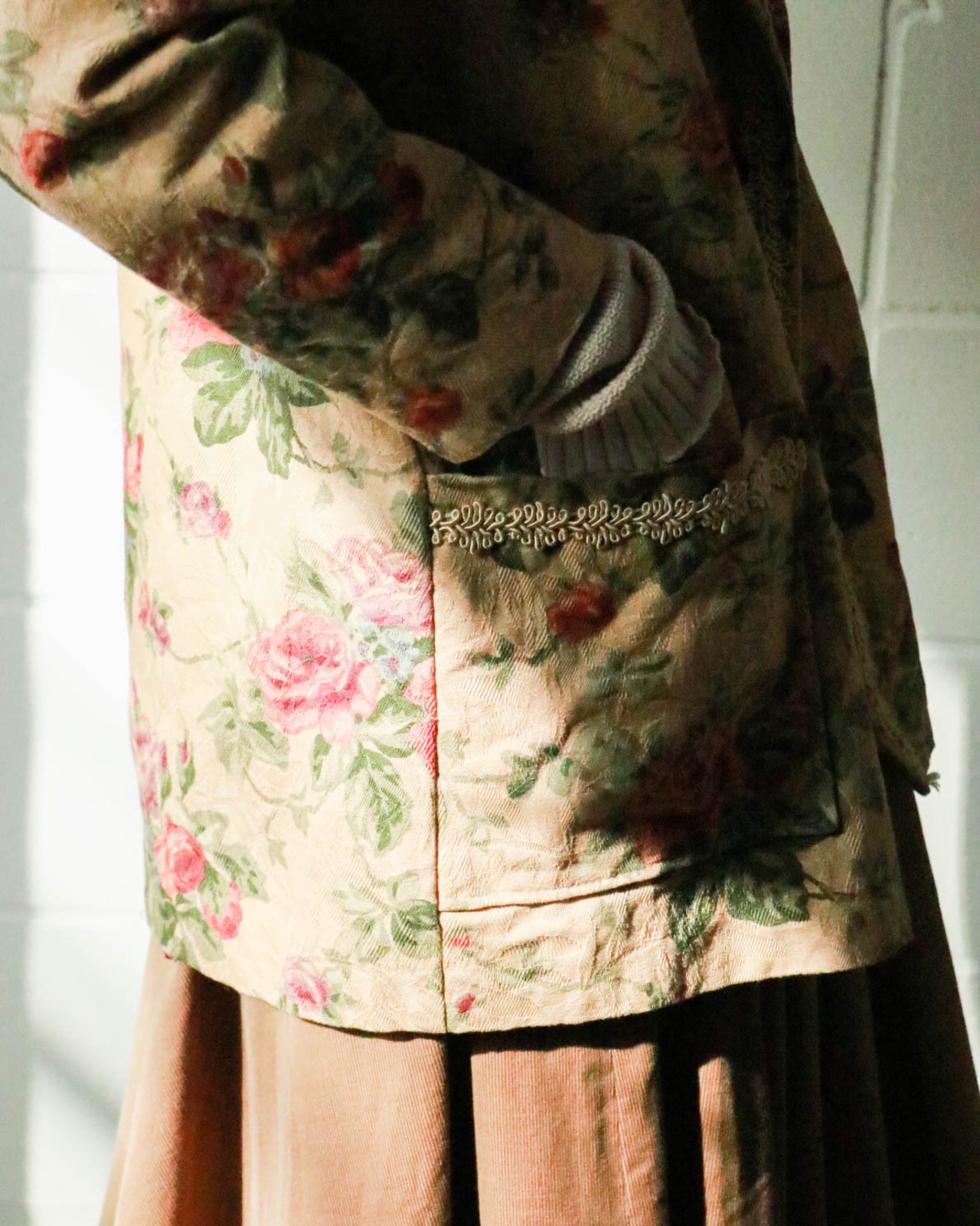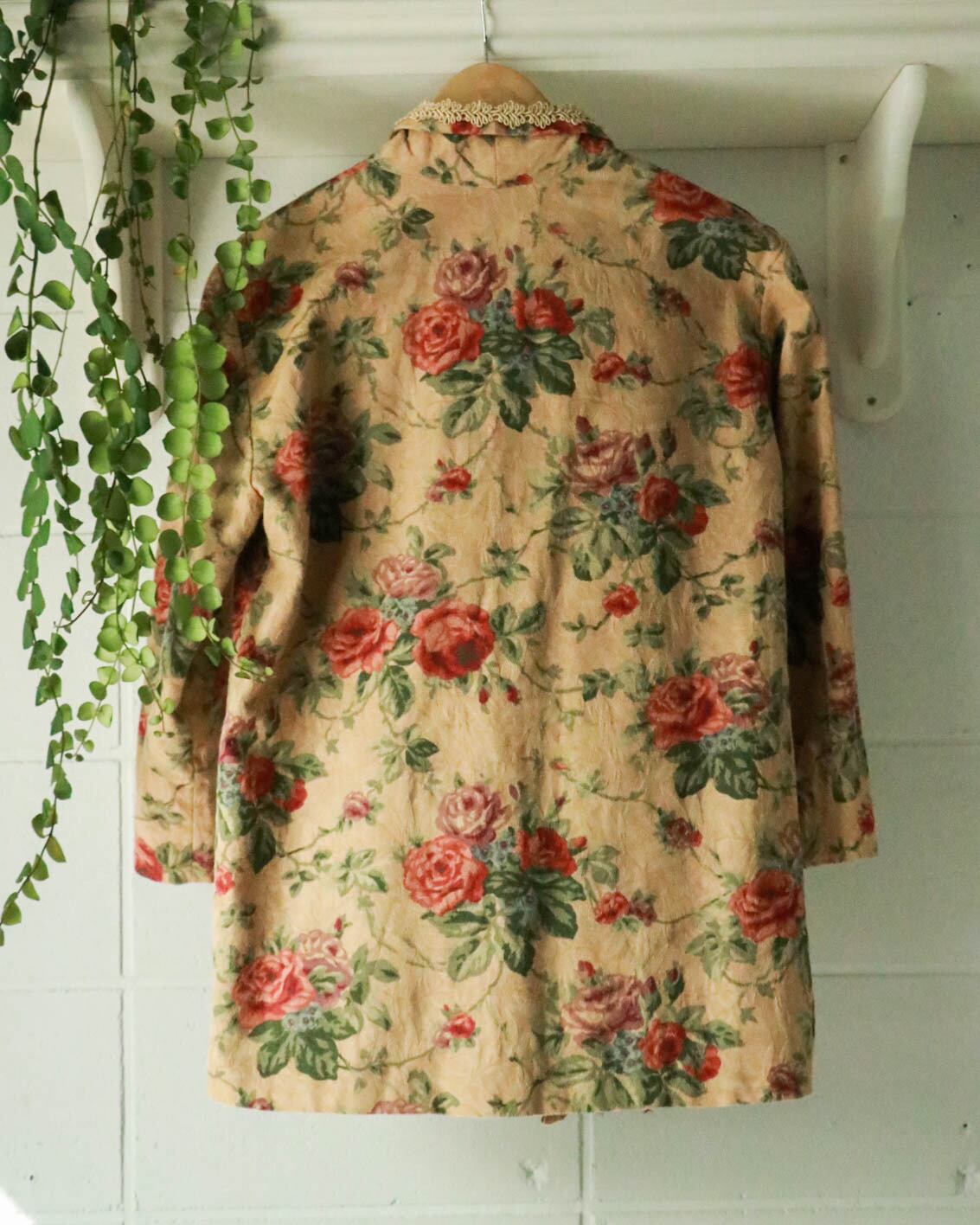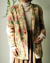 ベージュカラーの花柄ジャケット。特徴的な大きめのフロントボタンに襟や
