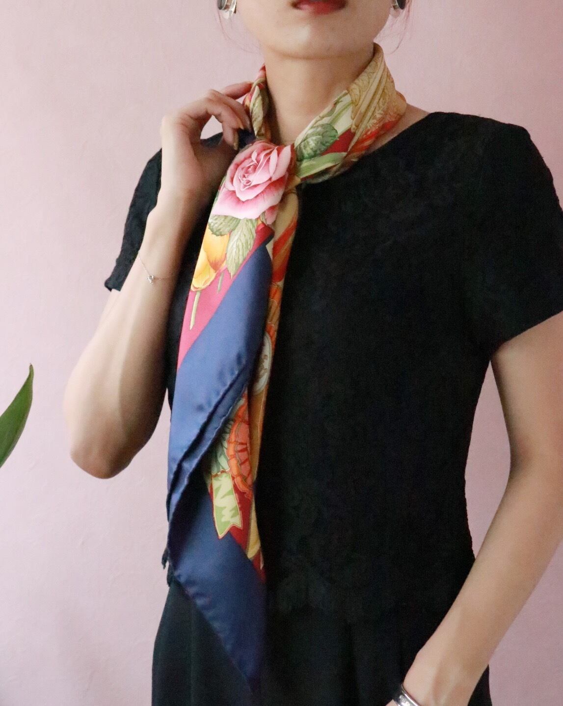 巻き方で柄の出る部分が変わるのもスカーフが楽しめる理由のひとつ。