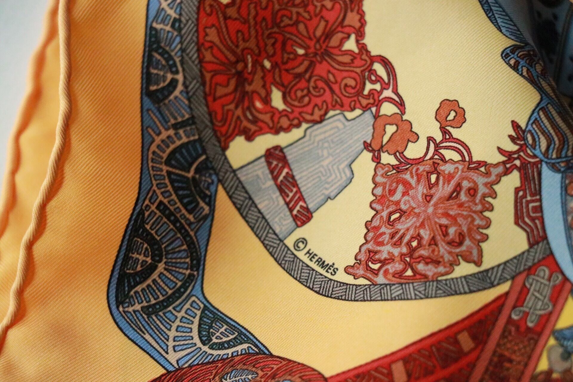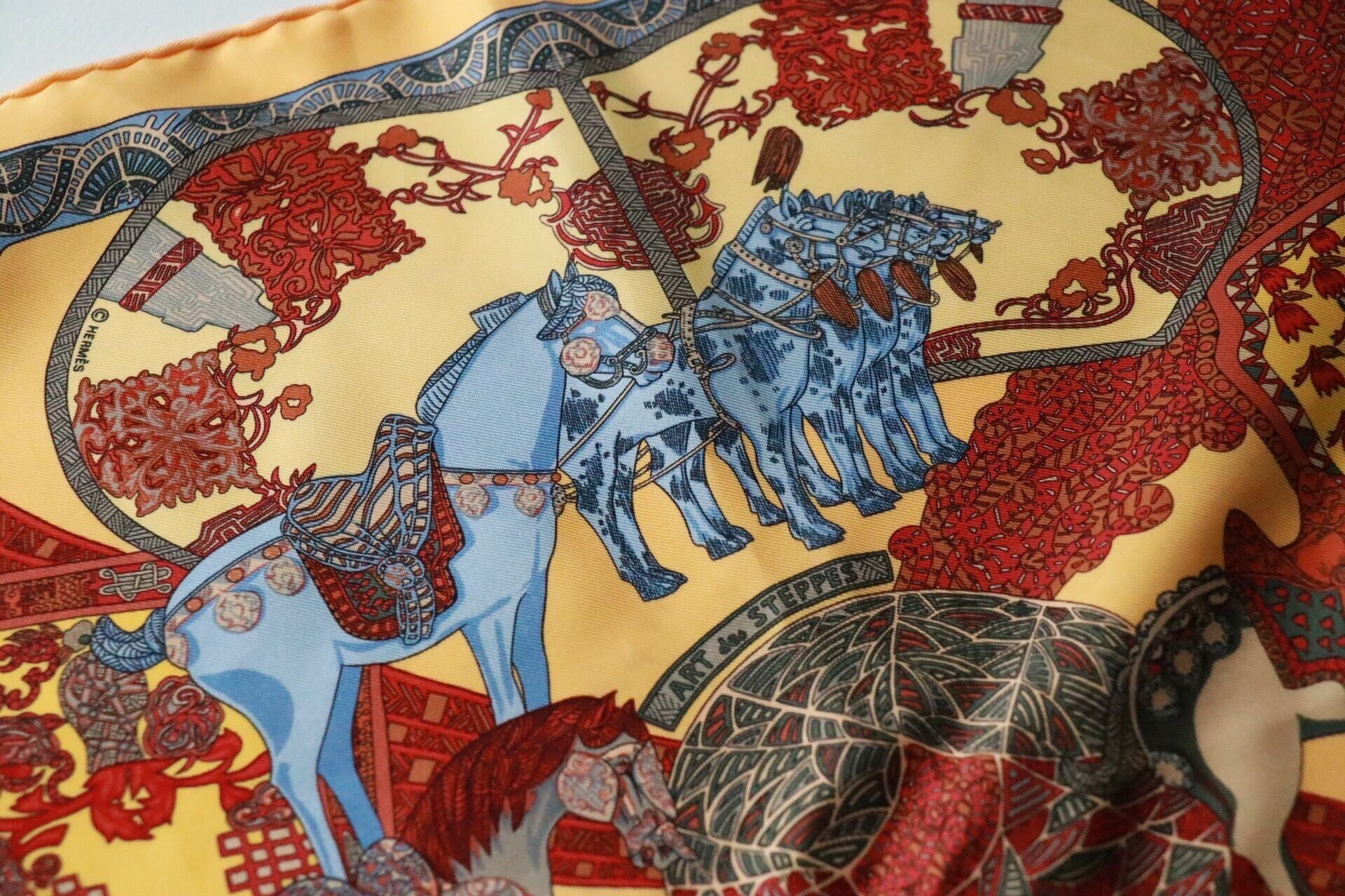 こちらは、HERMES王道の馬モチーフが繊細なタッチで描かれているデザインで柄が生き、さっと巻くだけで普段のコーディネートが華やかになります。