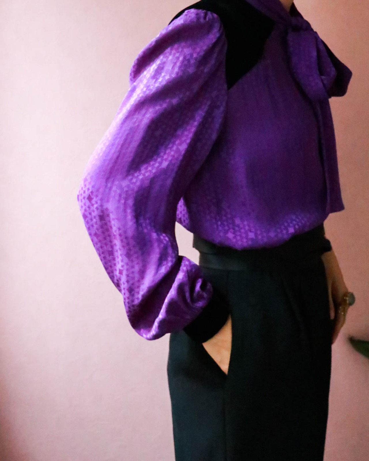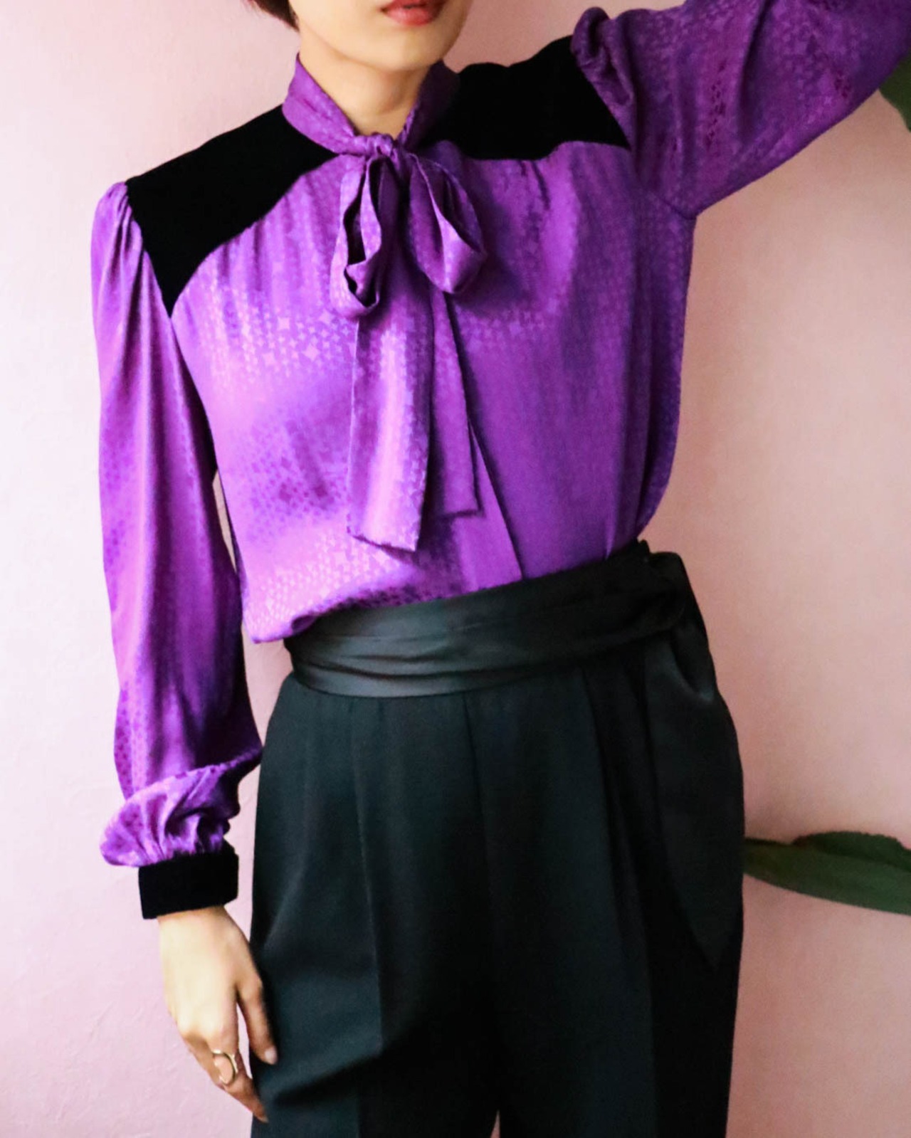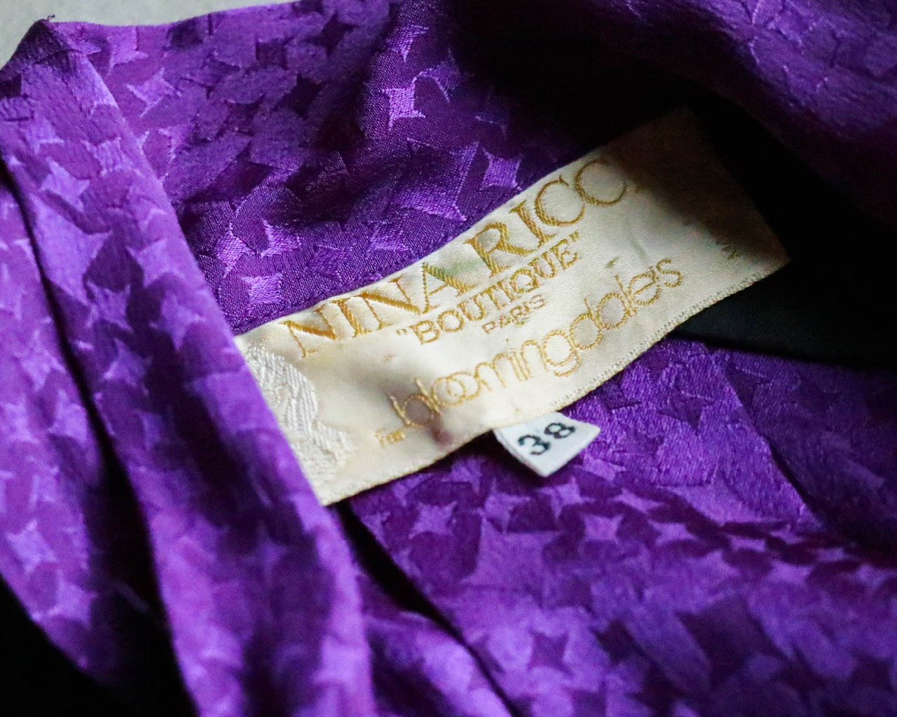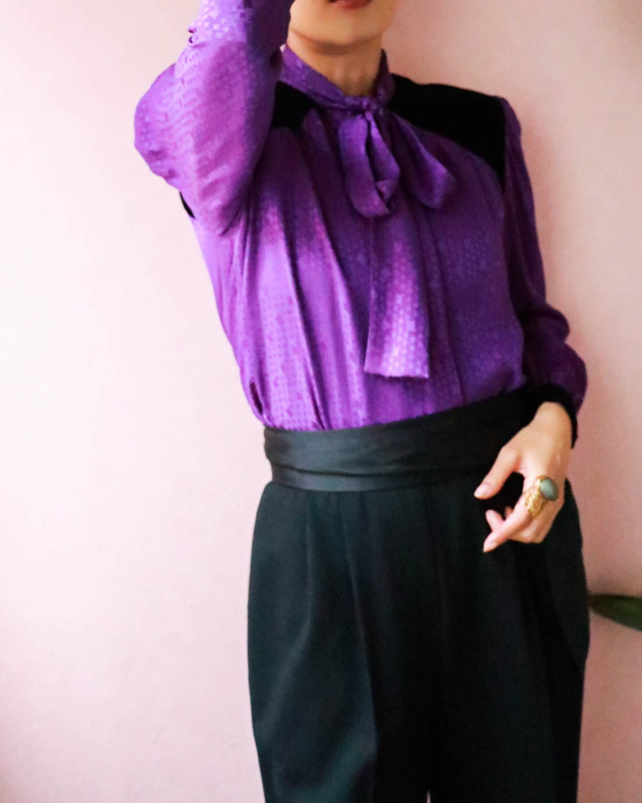 鮮やかなパープルが目にとまる表情豊かで艶やかなブラウスは70年代ニナリッチ。