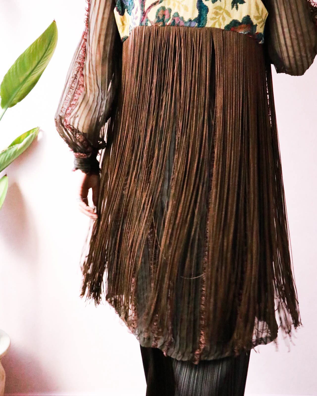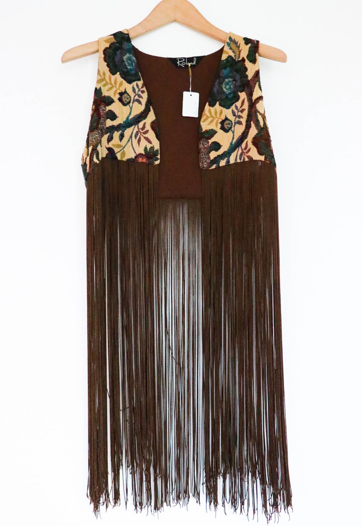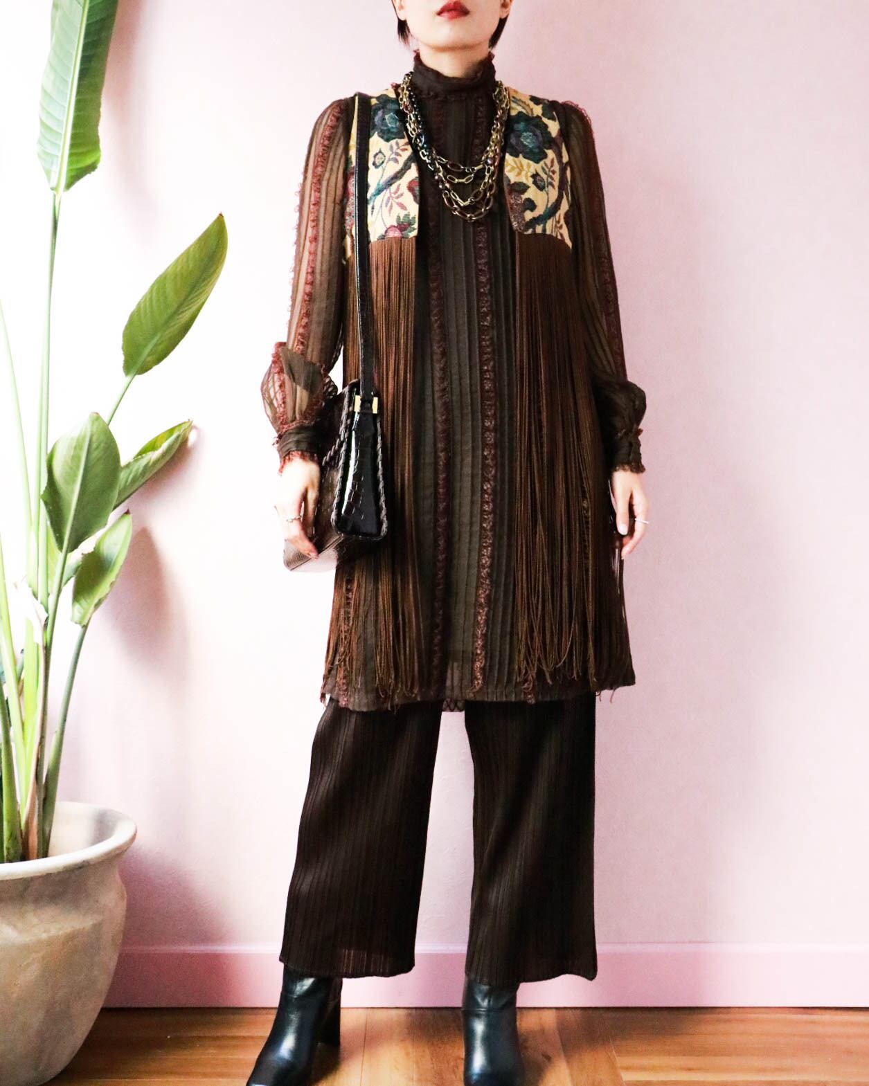 アクセサリー感覚で取り入れたいアイテムの一つであるヴィンテージベストはデザインで選びたい。ゴブラン織と繊細なフリンジの組み合わせはあるようで中々見つからない一点です。揺らすために存在するこの長さ...ブラウスの上やトレンチコートなどアウターの上からさっと羽織って個性を楽しんでみては。