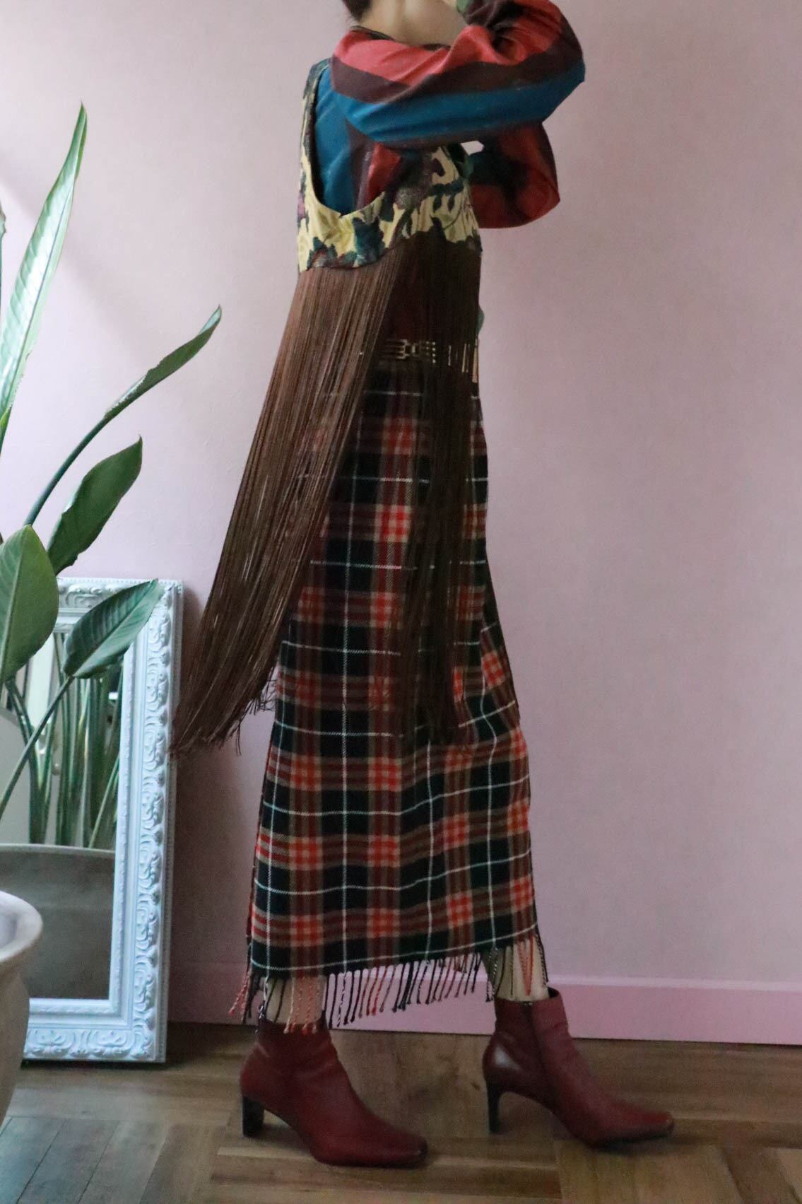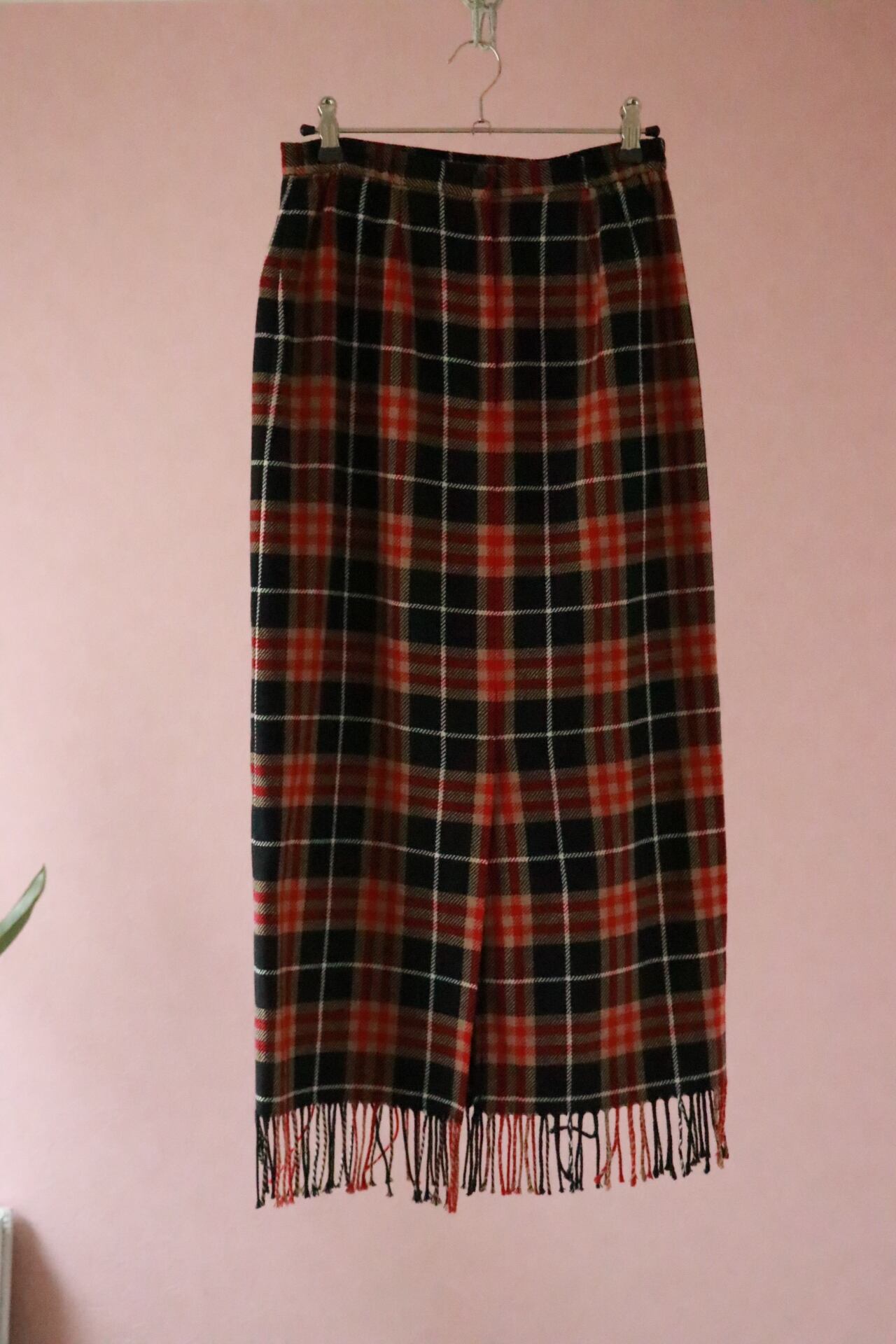 ベージュ+赤+黒の色合いがクラシックな印象のチェックスカート