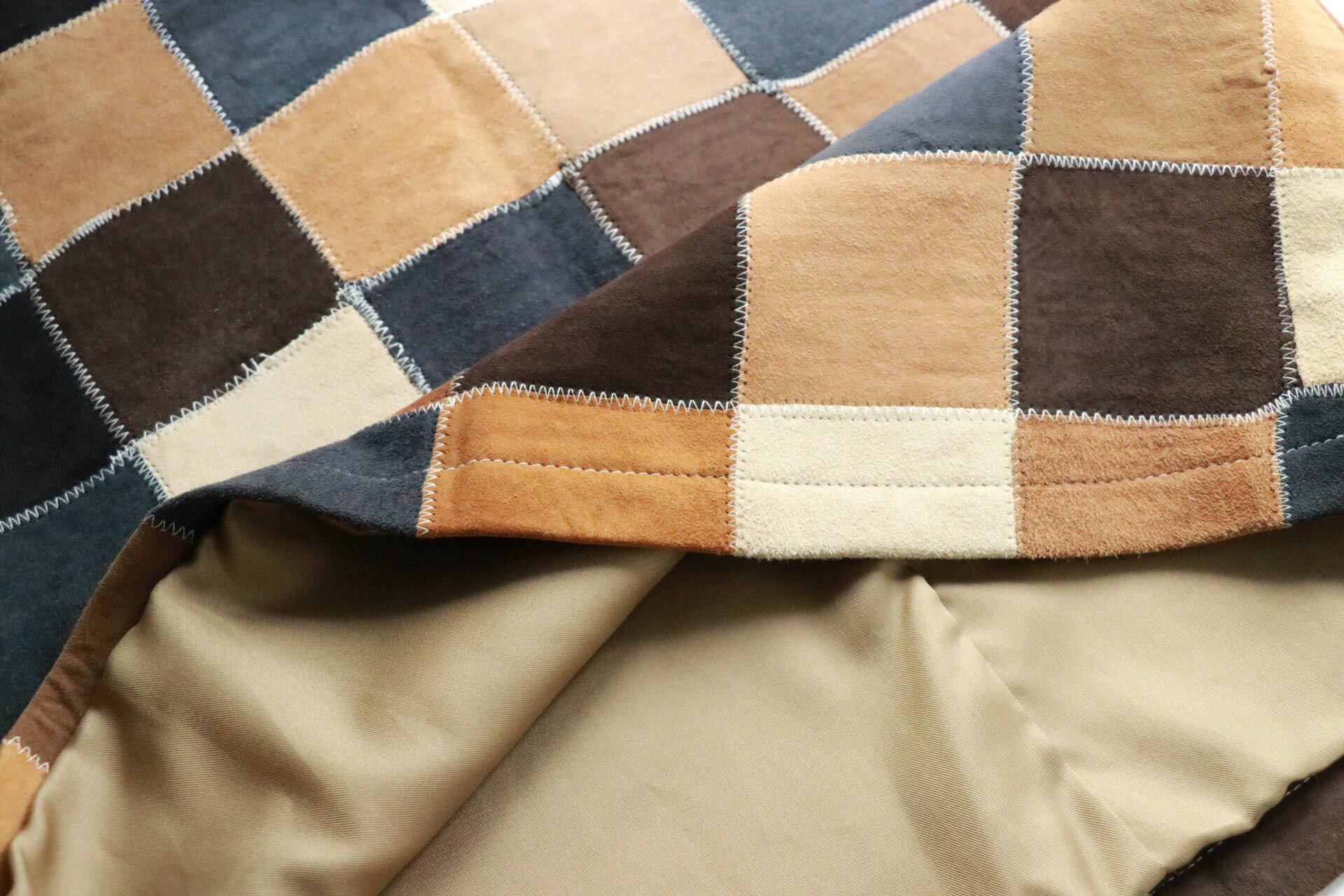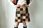 様々なカラーのスエードがブロックチェックのように並んだデザインで、ノスタルジックな雰囲気が漂います。写真のように、トレンドライクなロングブーツと合わせるのがオススメです。