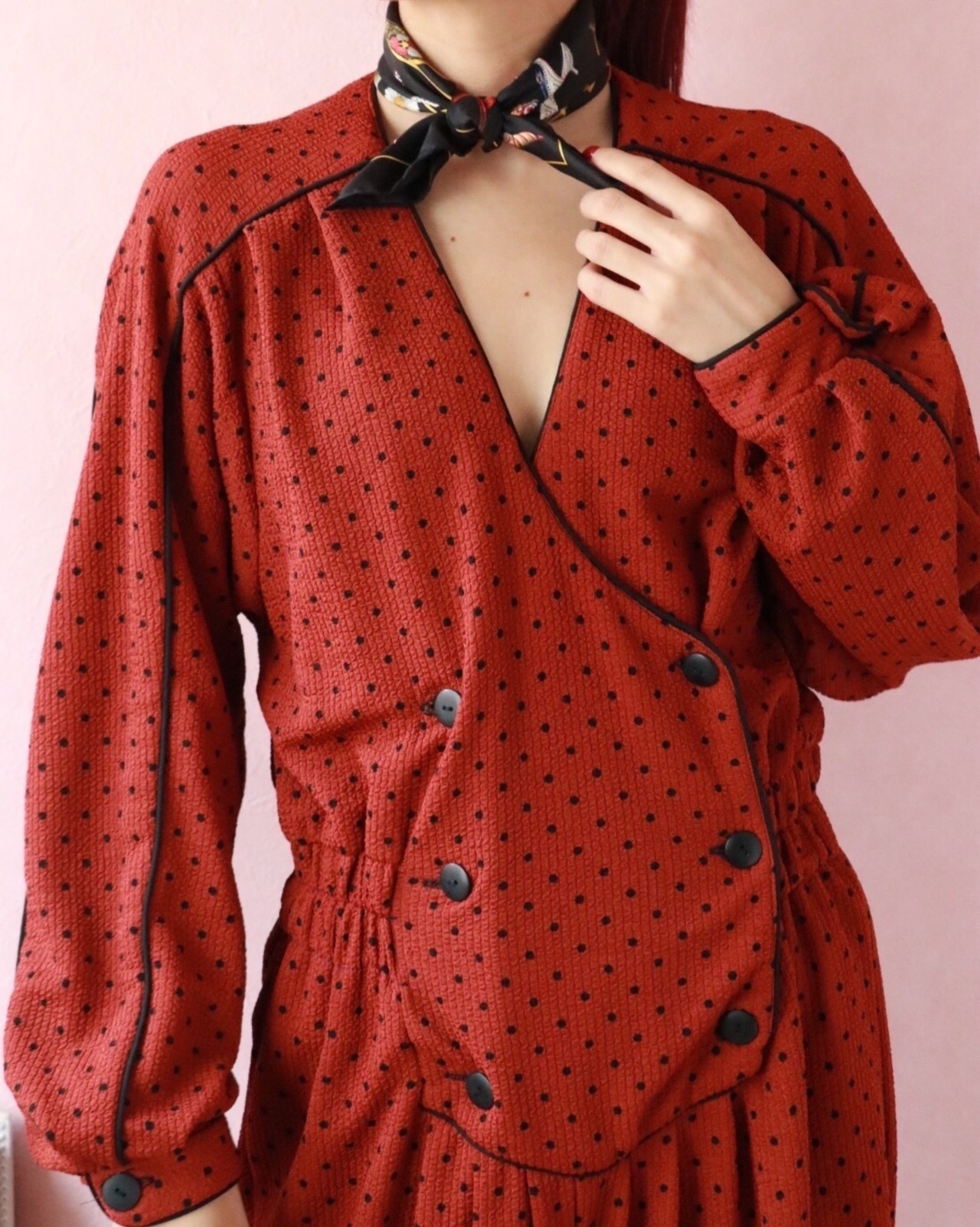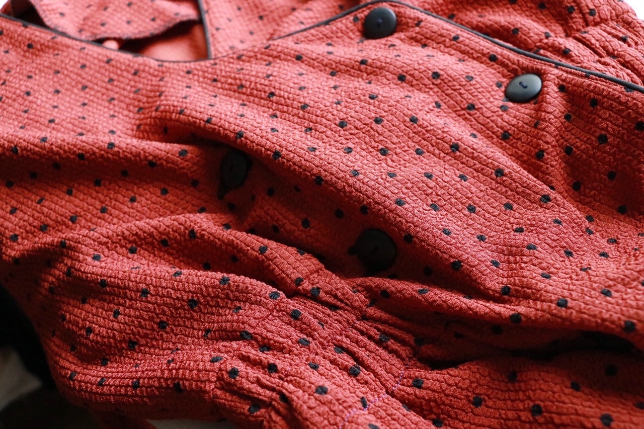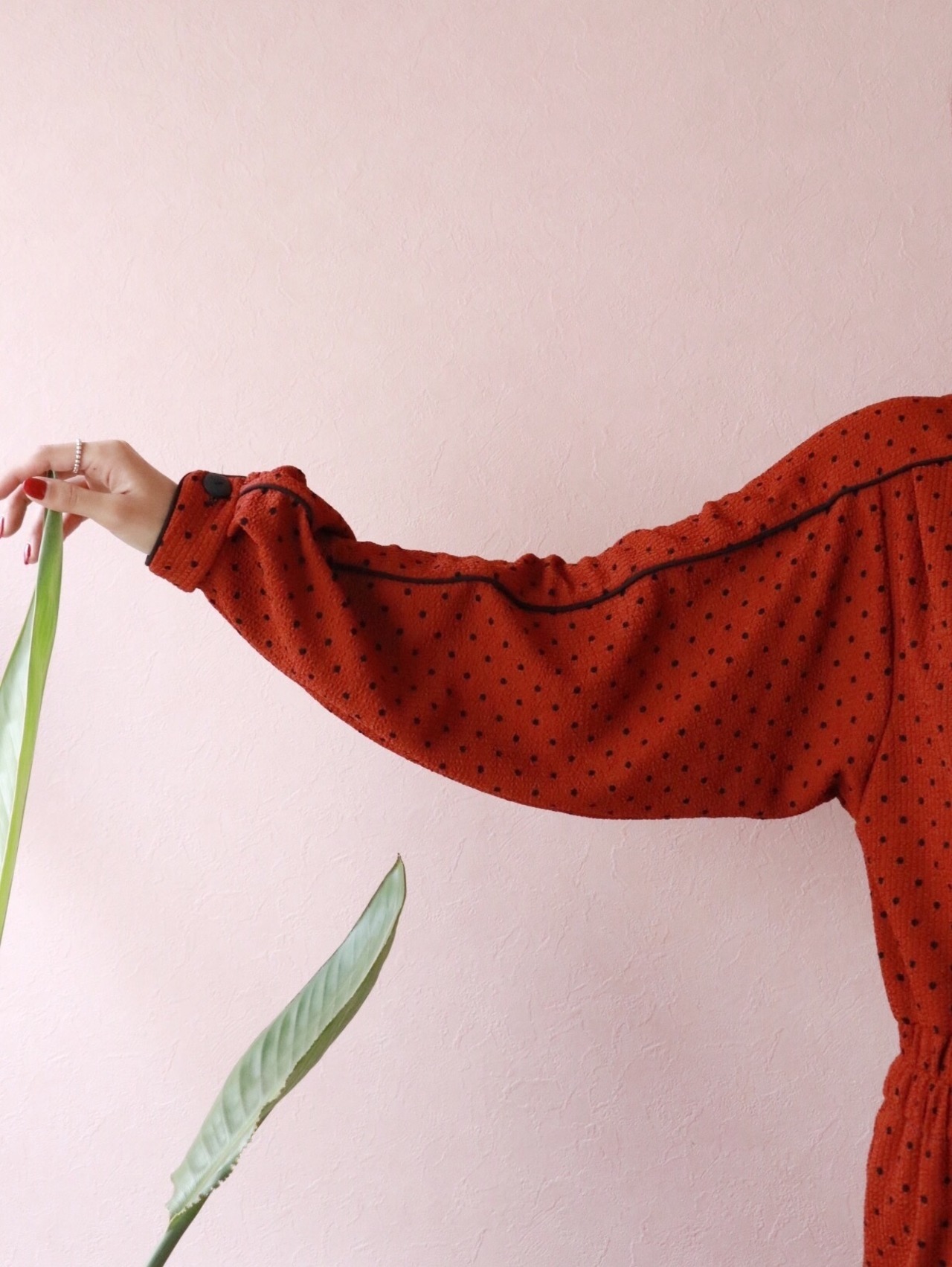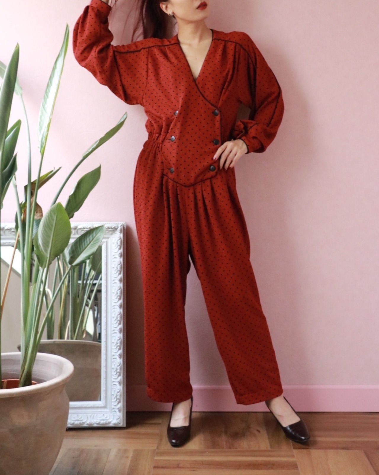 オレンジブラウンのにドット柄がレトロフェミニンなオールインワンは80年代vintage