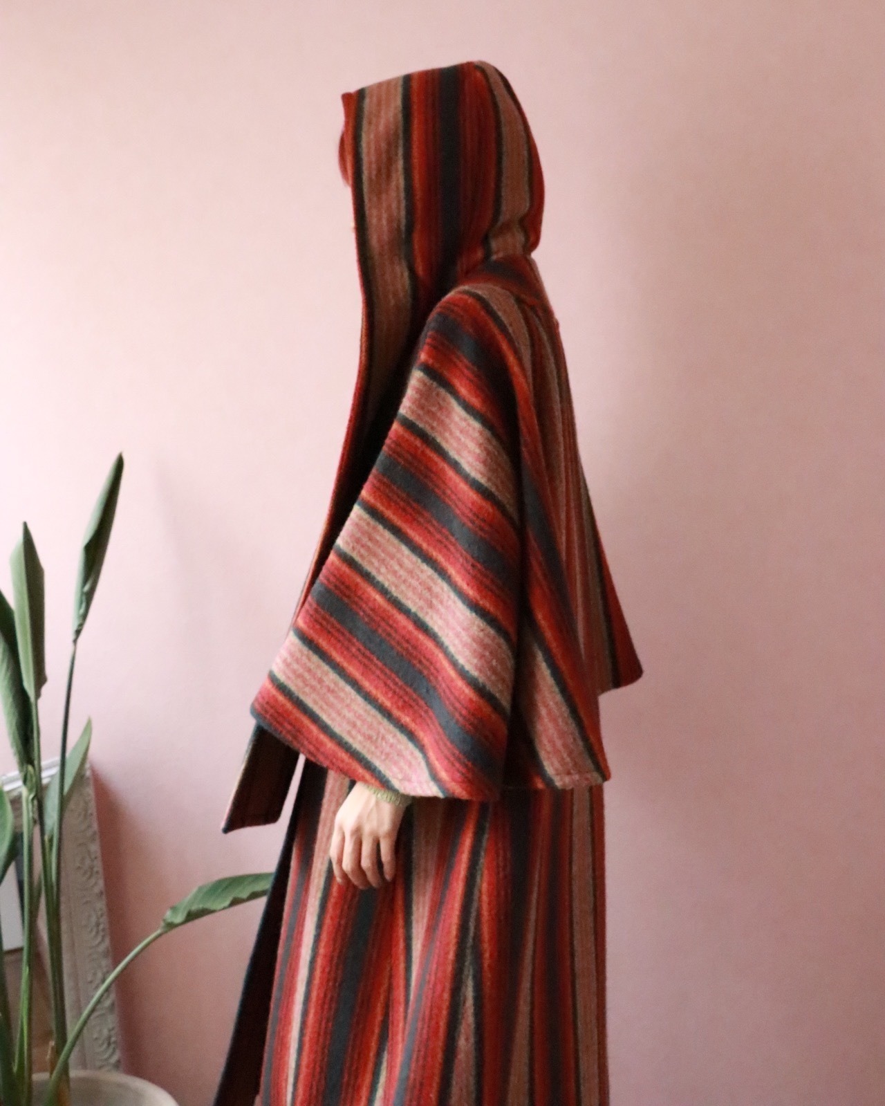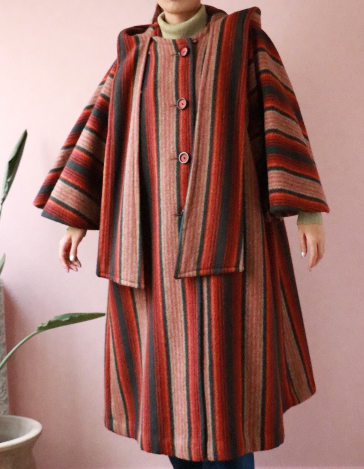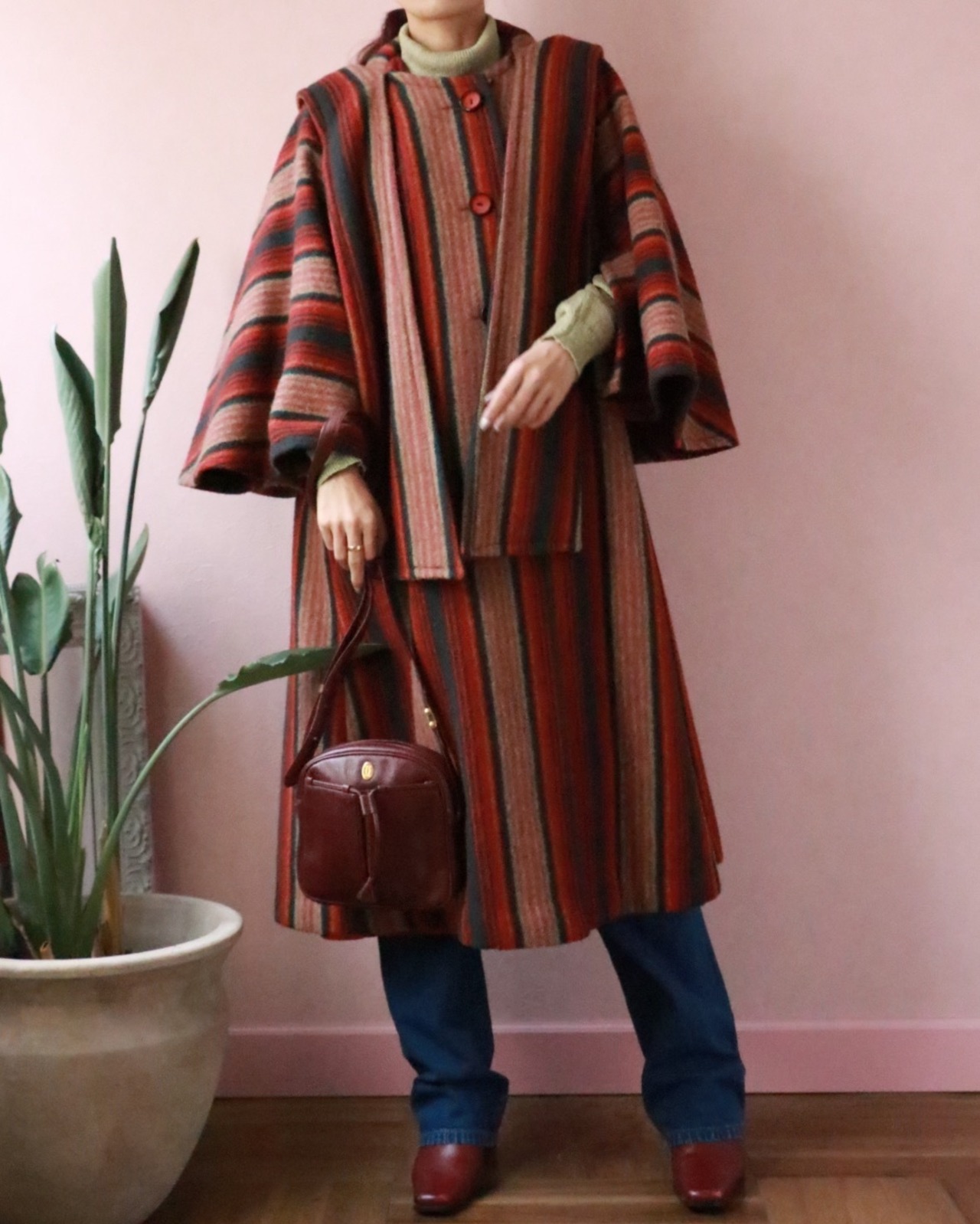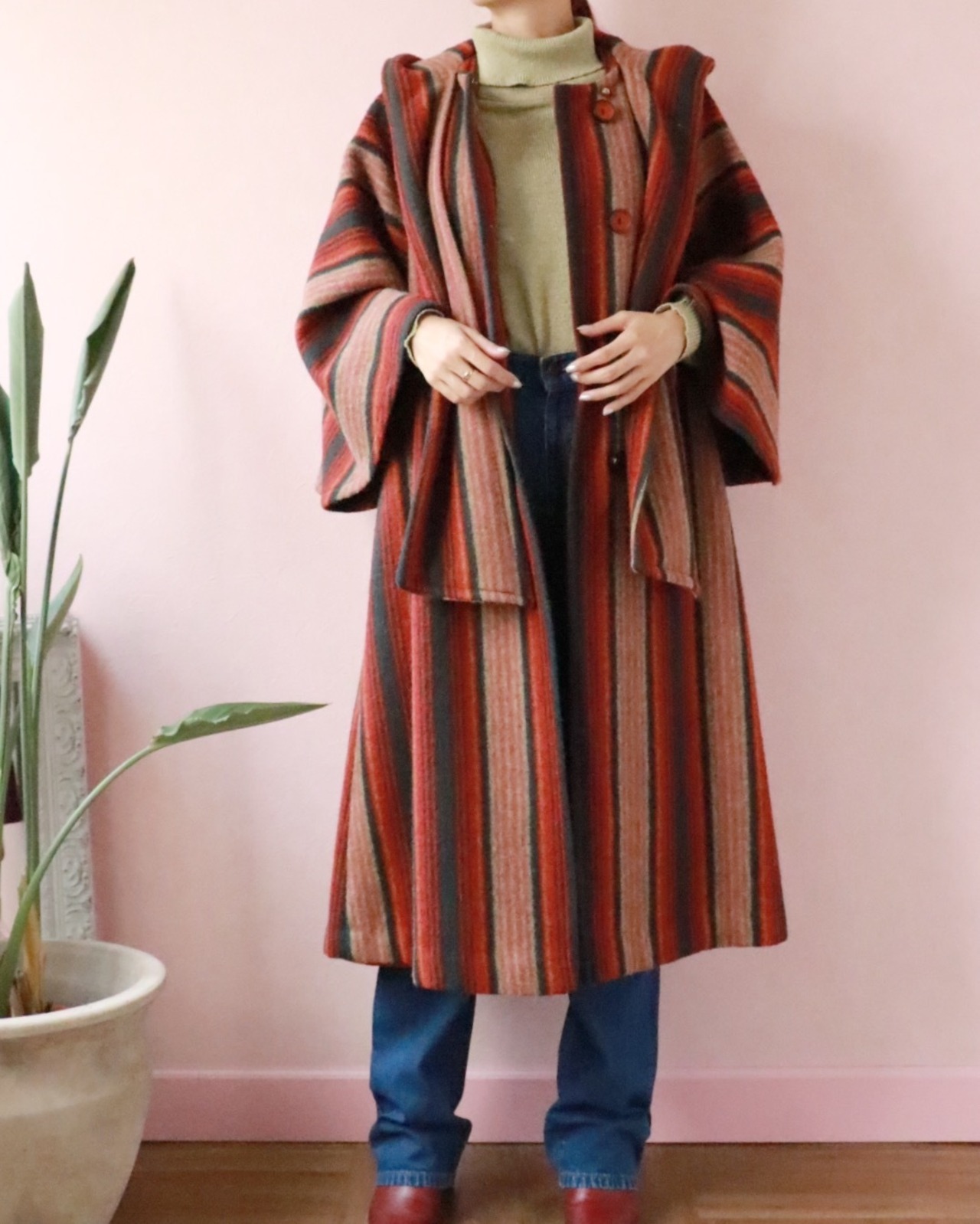 首元はマフラーつきフードで、モダンとレトロをバランスよく組み合わせた一点