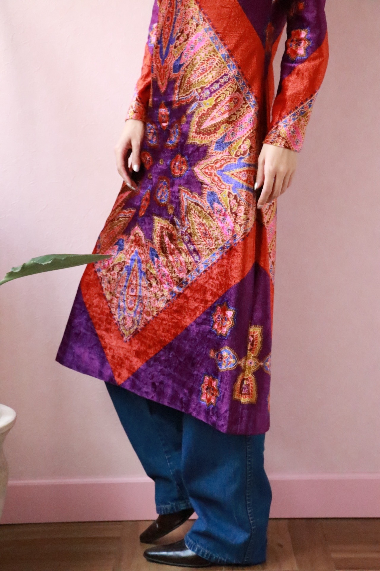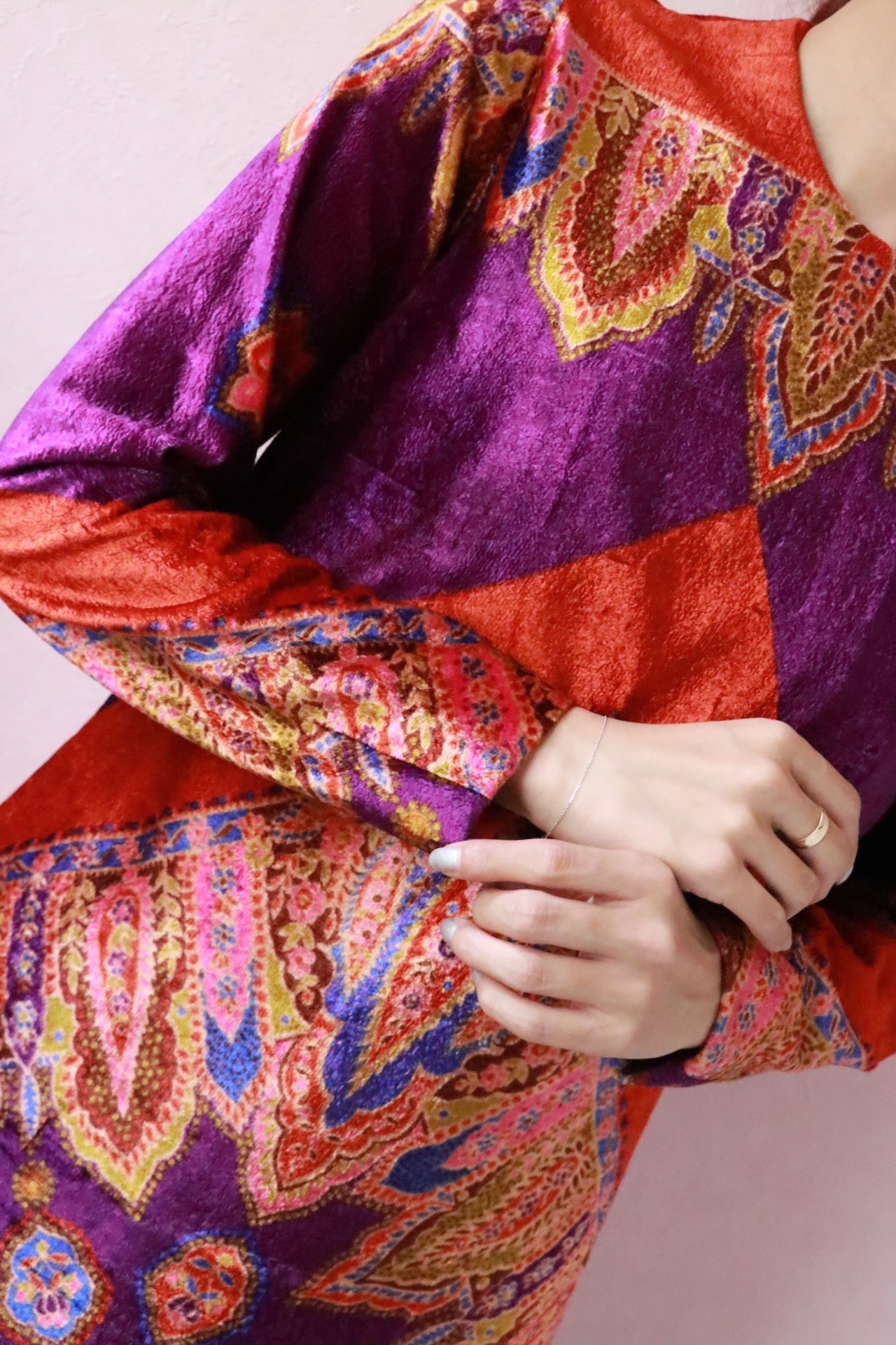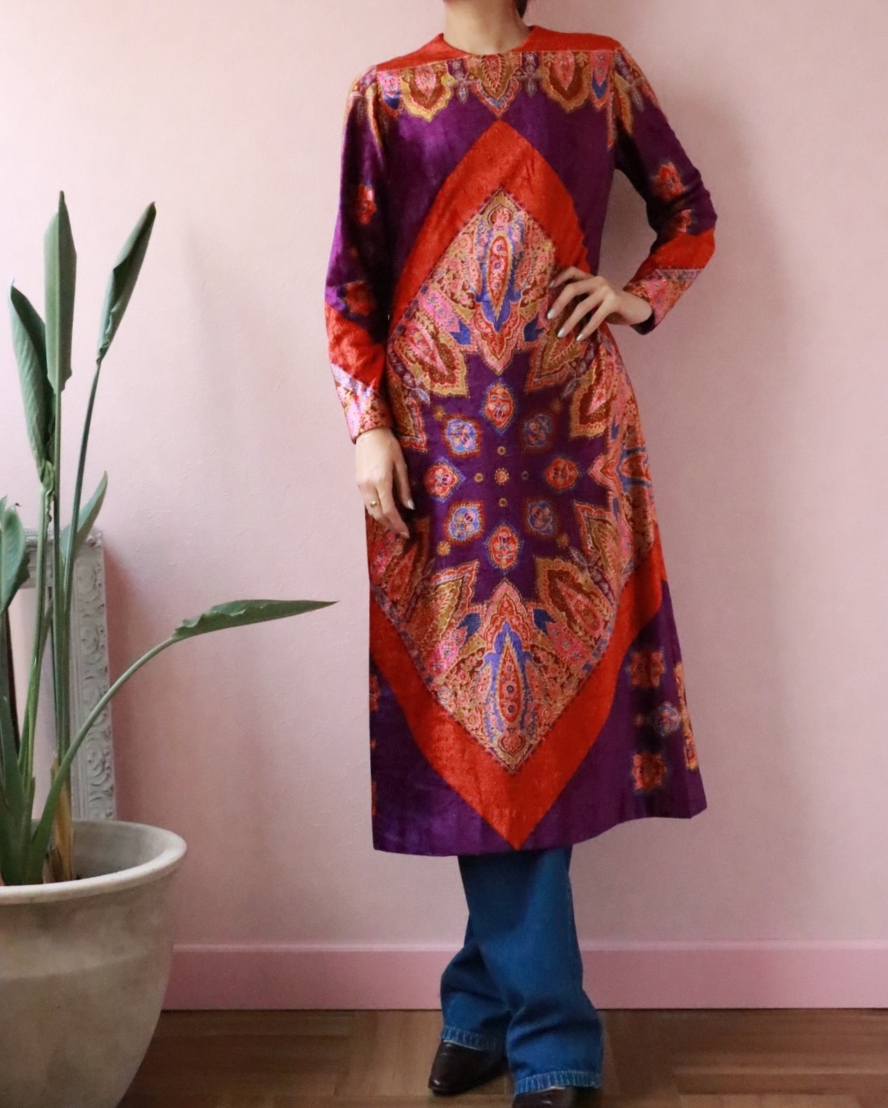 パープルとオレンジのボディーがアーティーなカーペット模様で、自由と平和を求めた70'sカルチャーを思い起こさせます。光沢感をハリのある少しベロアに似たような素材感