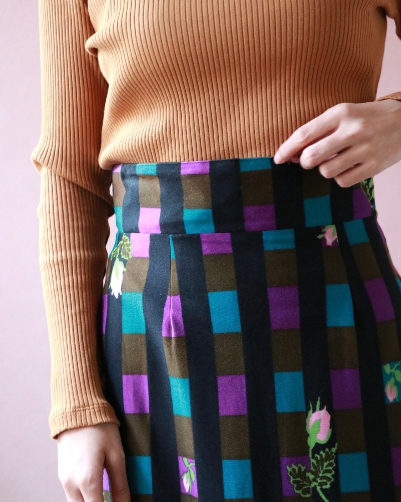 ブルー+パープルのチェックにライトピンクの薔薇がレトロクラシックロングスカート