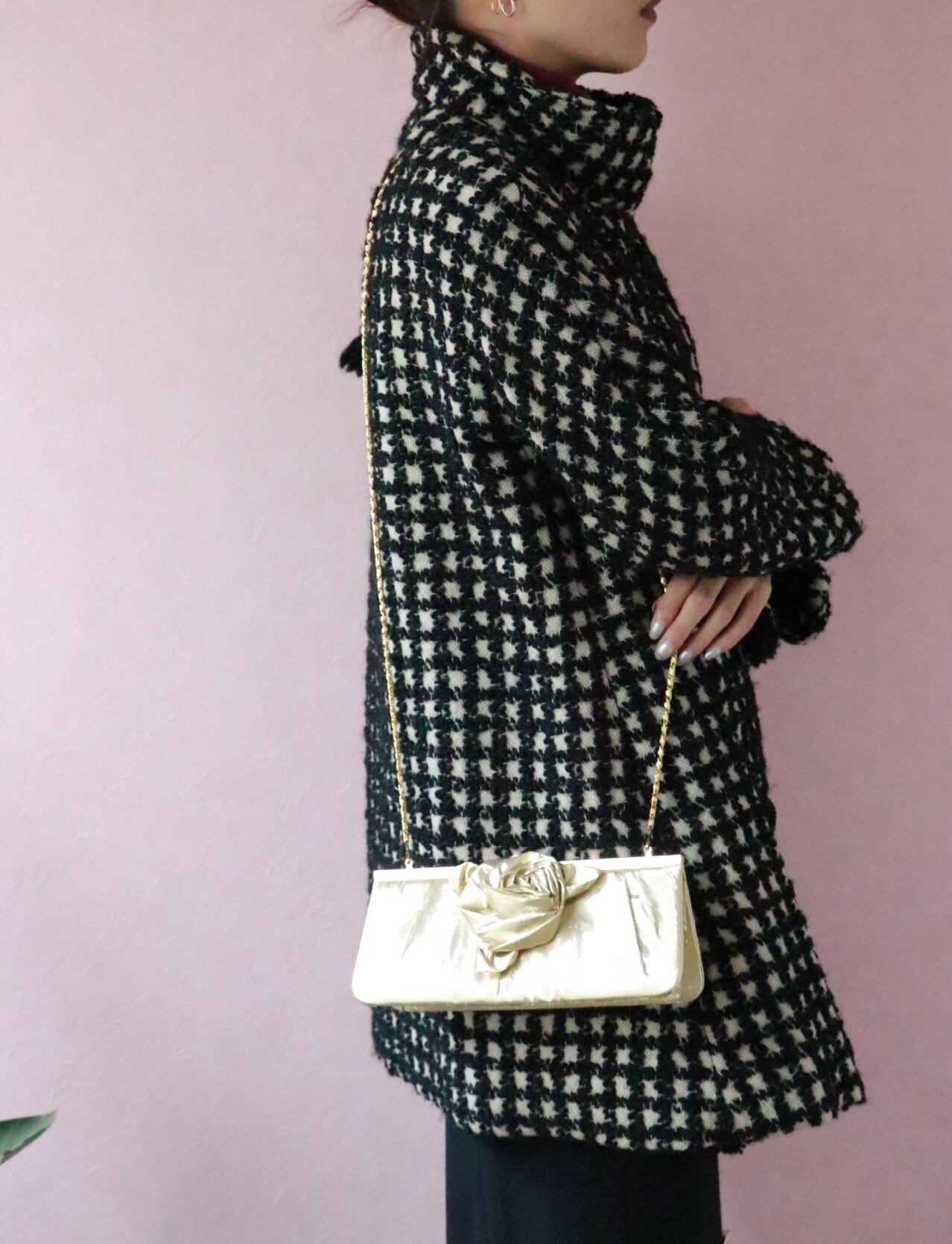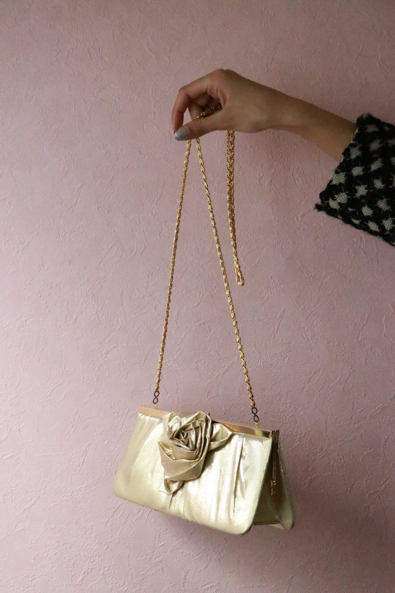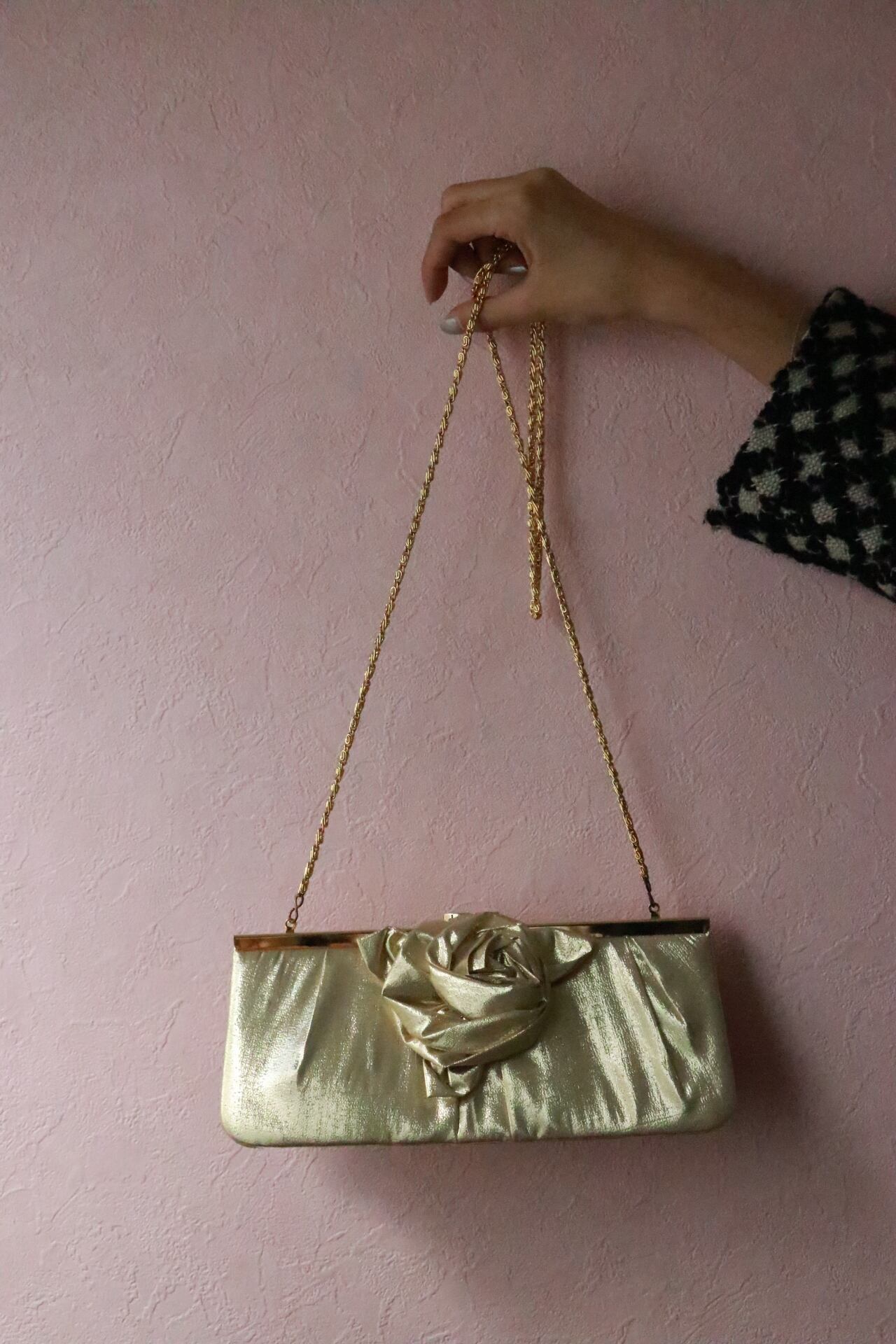 光に合わせて反射する表情が美しく、女性らしい気品が際立ちます。フロントのバラのデザインがポイントの愛らしいがま口タイプのミニマルなデザインで、パーティーシーンはもちろんデイリースタイルの外しにも最適。ずっと大切にしたくなるヴィンテージバッグです