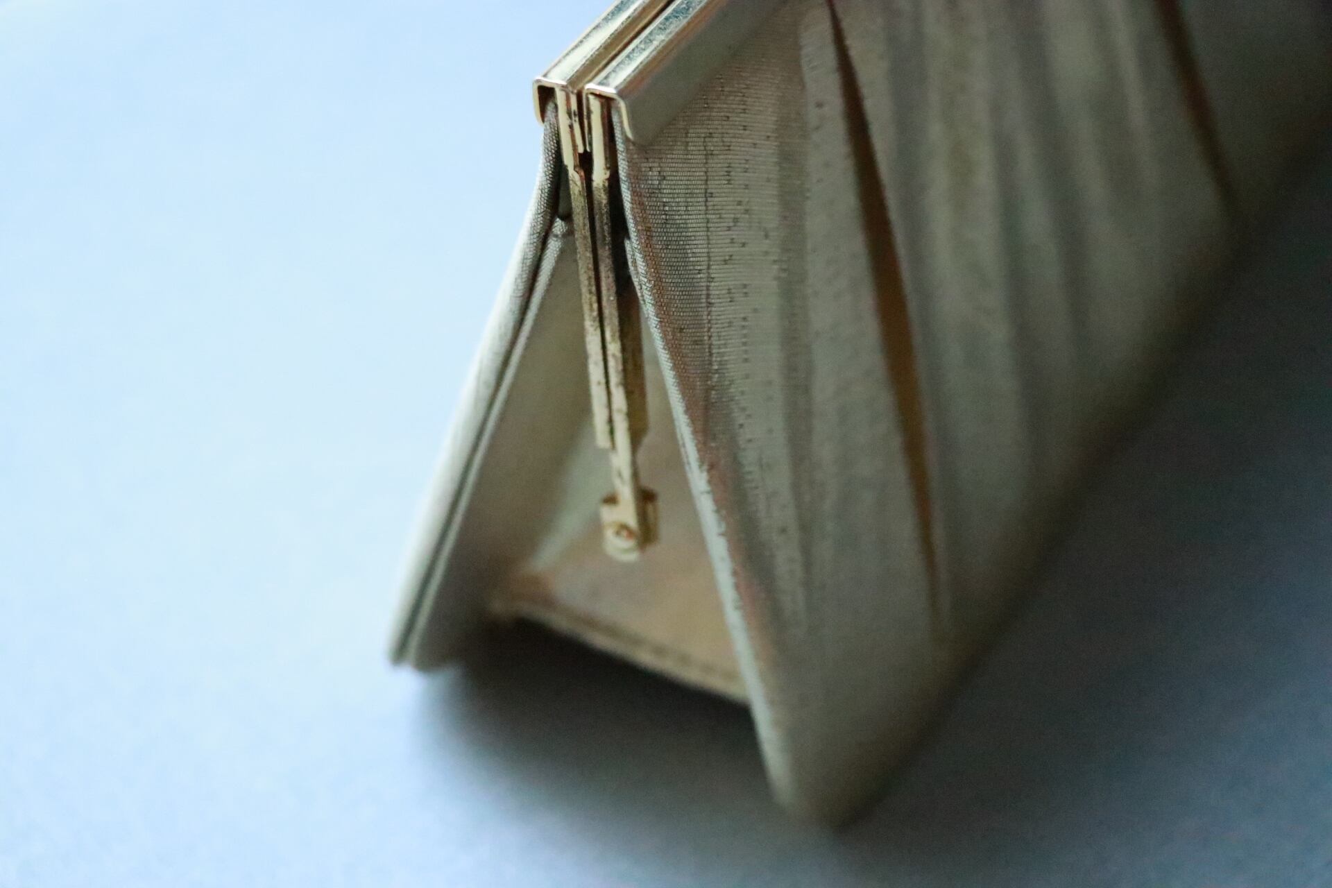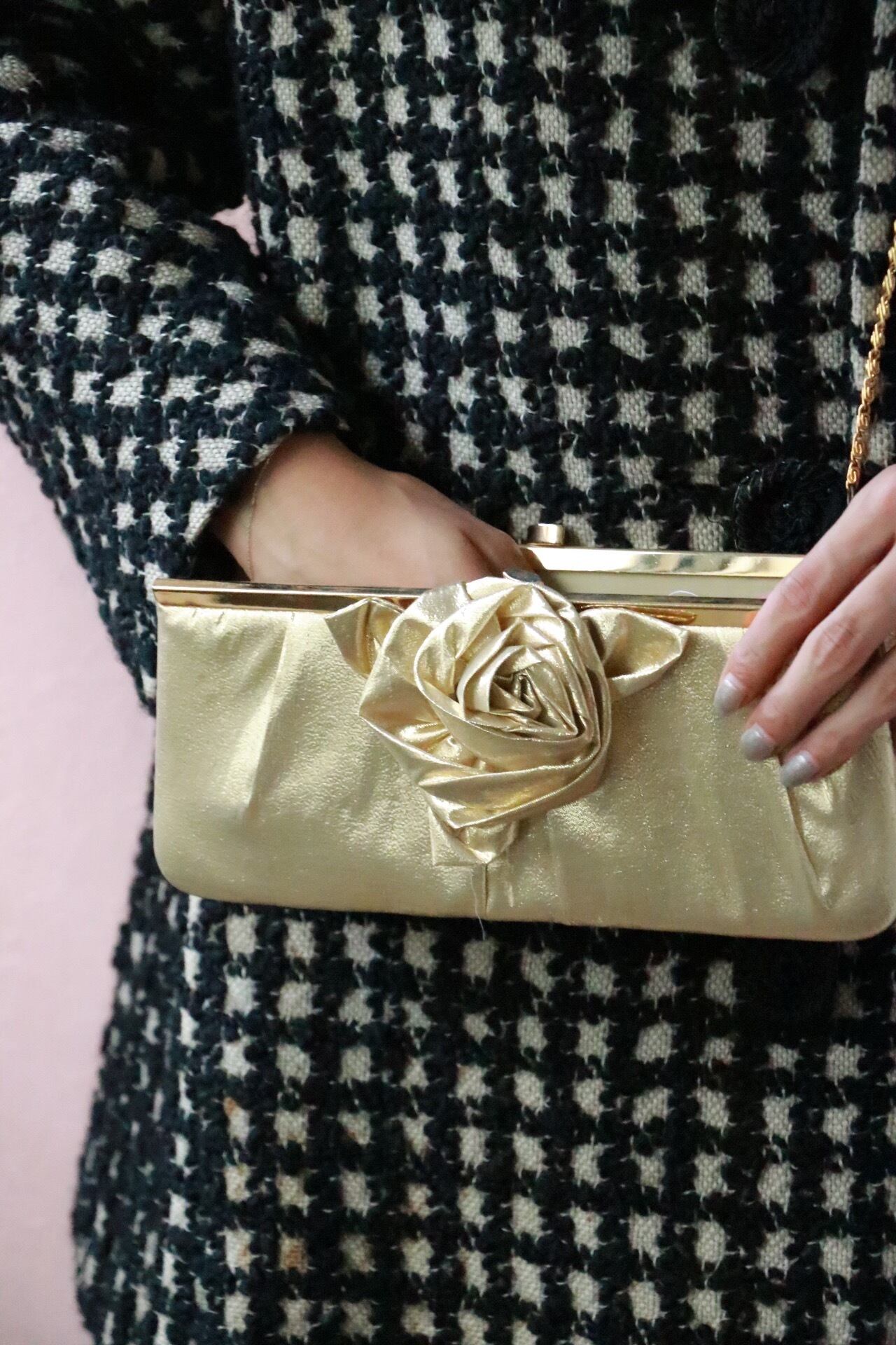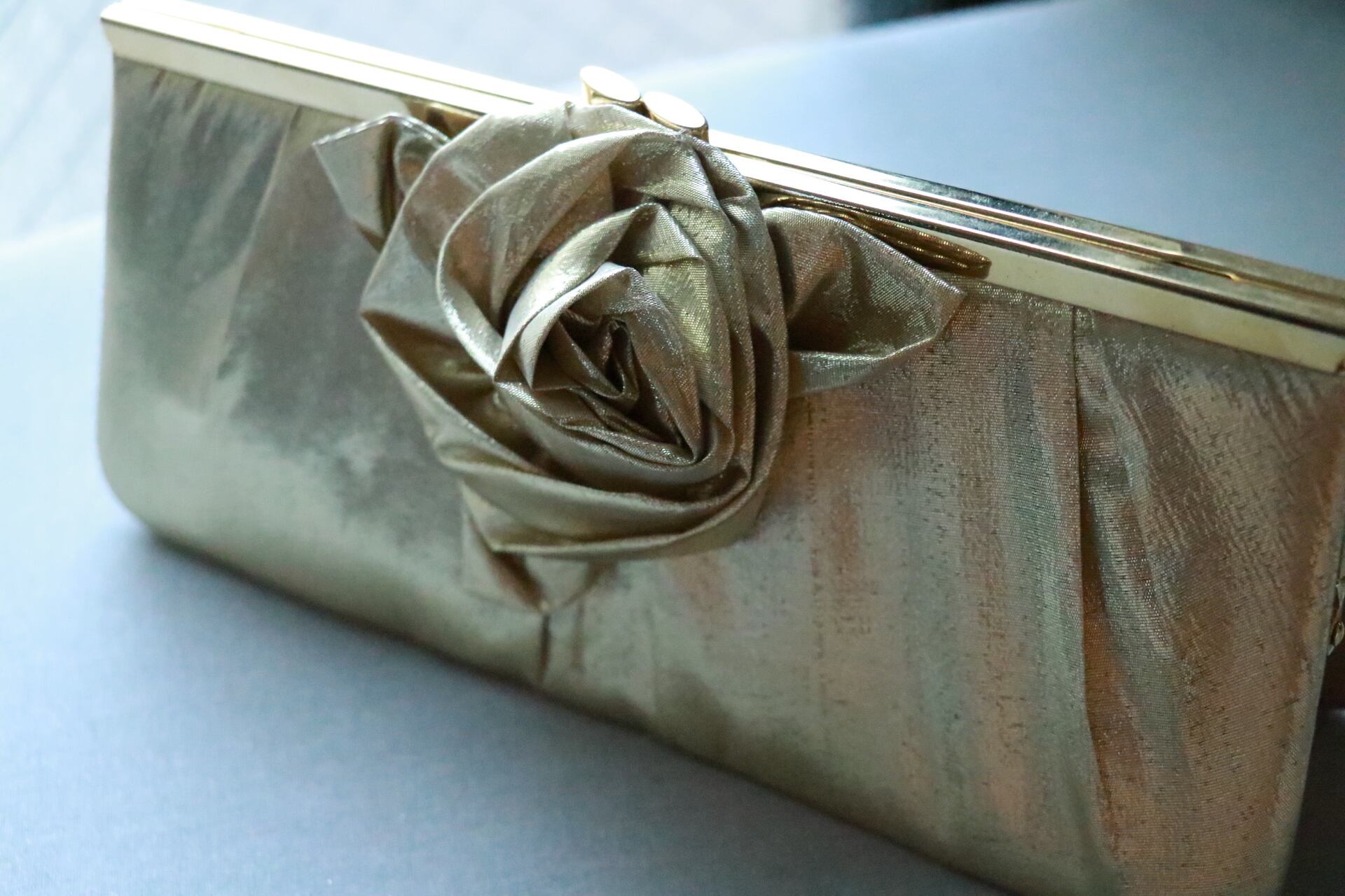 光に合わせて反射する表情が美しく、女性らしい気品が際立ちます。フロントのバラのデザインがポイントの愛らしいがま口タイプのミニマルなデザインで、パーティーシーンはもちろんデイリースタイルの外しにも最適。ずっと大切にしたくなるヴィンテージバッグです