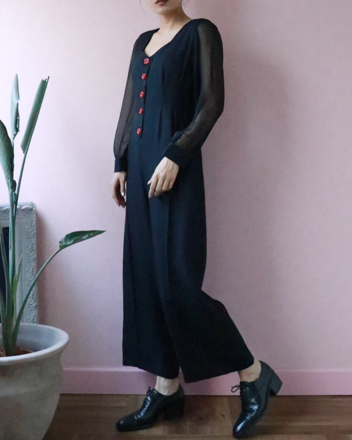 マニッシュになりがちなオールインワンもデコルテラインが綺麗にみえるダイヤモンドネックにシースルーの袖デザインで品良く肌見せされ、女性らしい表情にアップデートします。