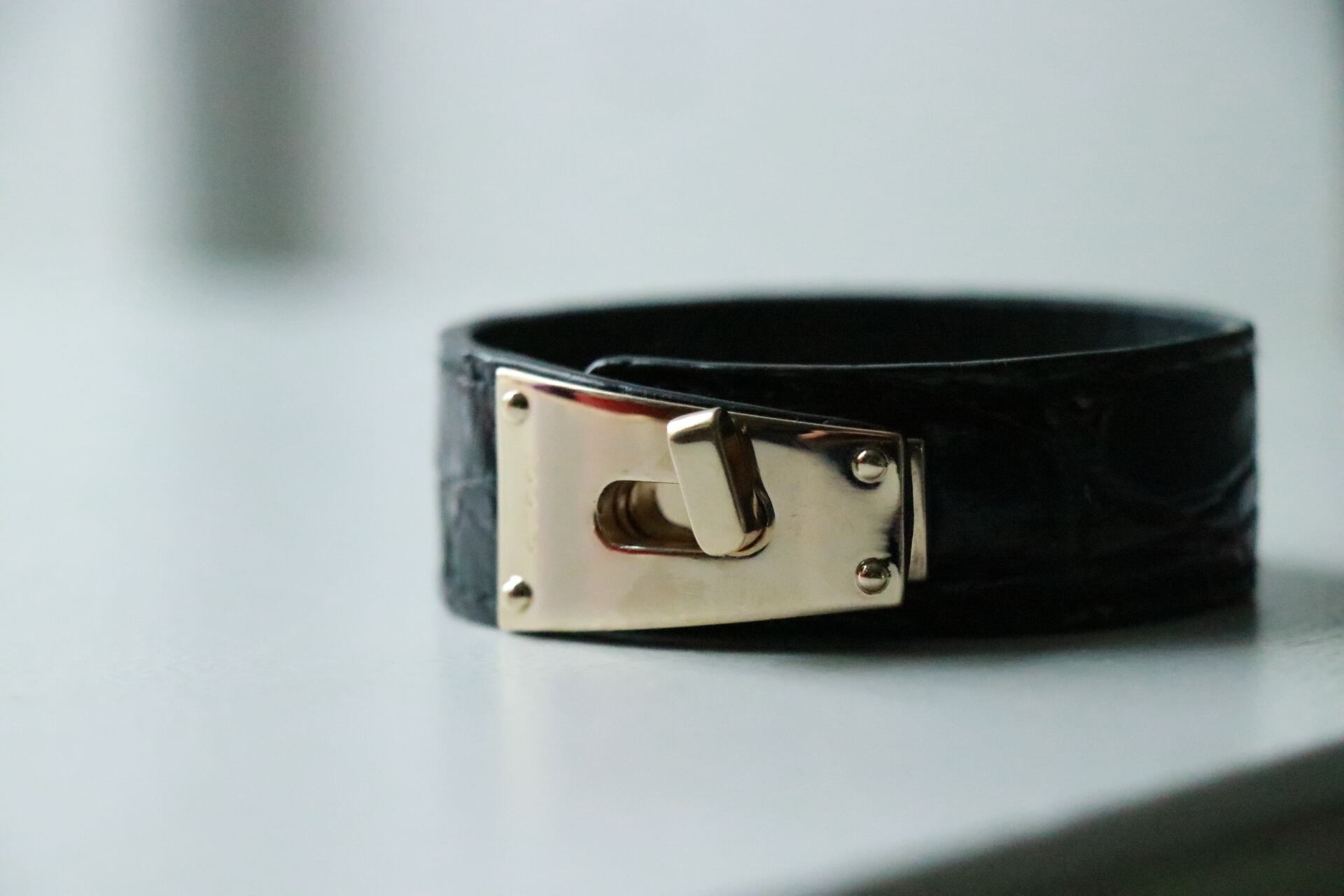光沢のある艶やかな型押しレザーにゴールドバックルで