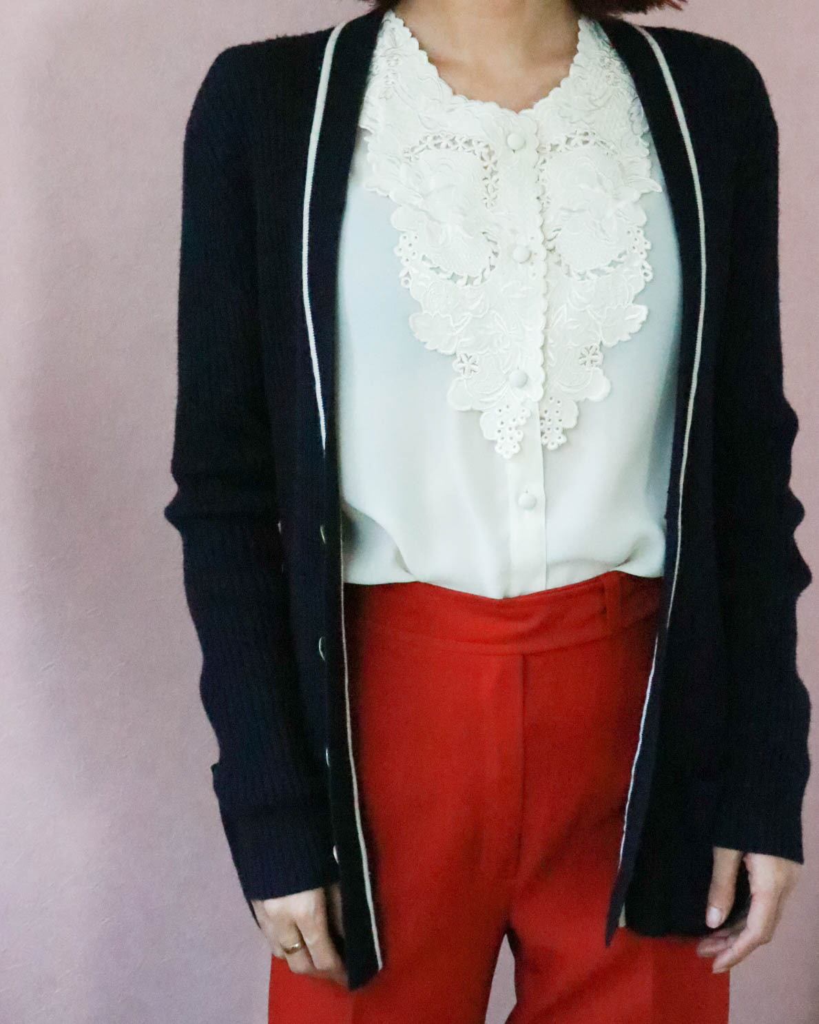 オールドセリーヌならではの馬車のアイコンが刺繍されたネイビーのカーディガン。