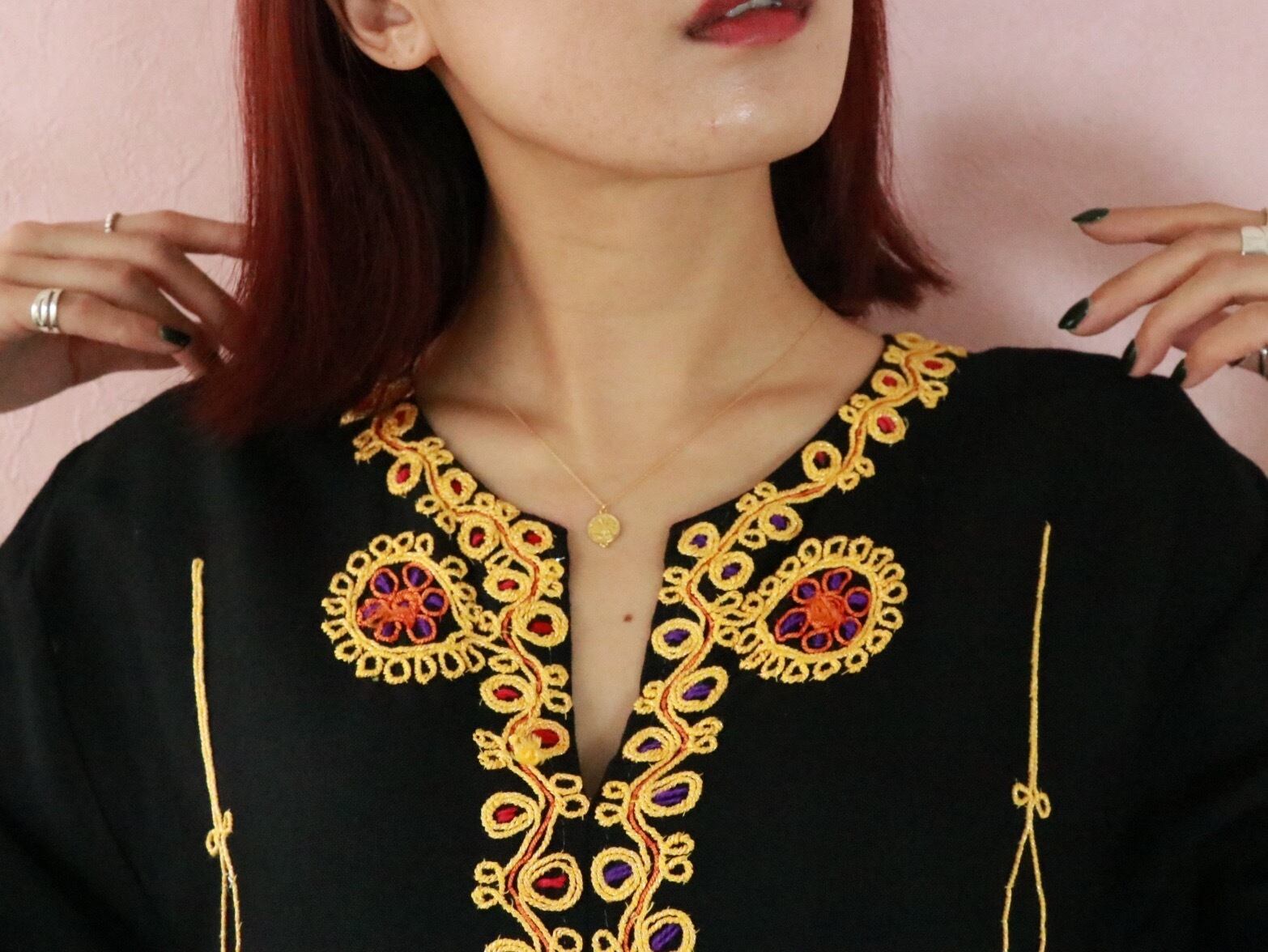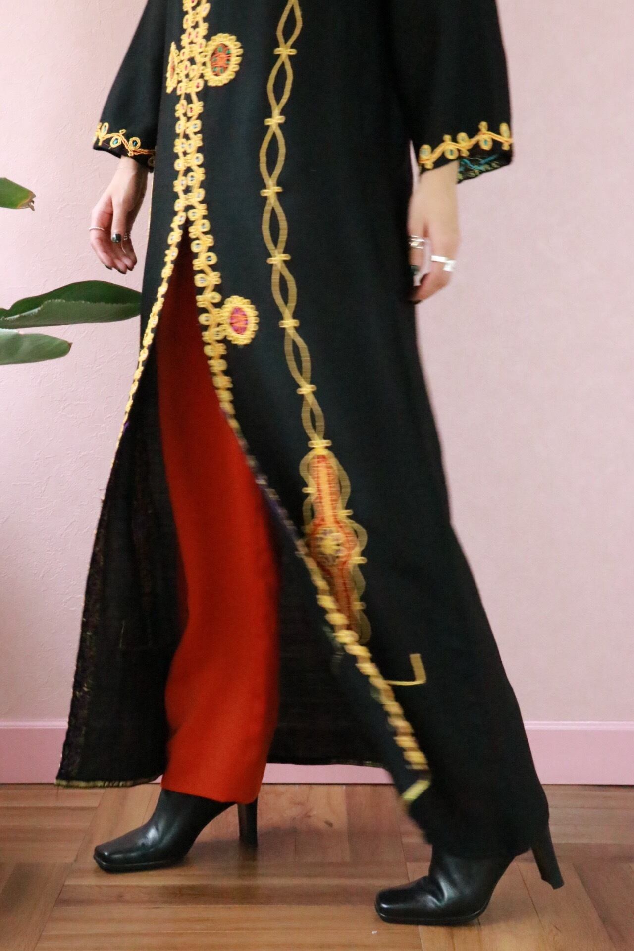 黒ボディーにゴールドのループワークが芸術的で民族衣装のような雰囲気の一着
