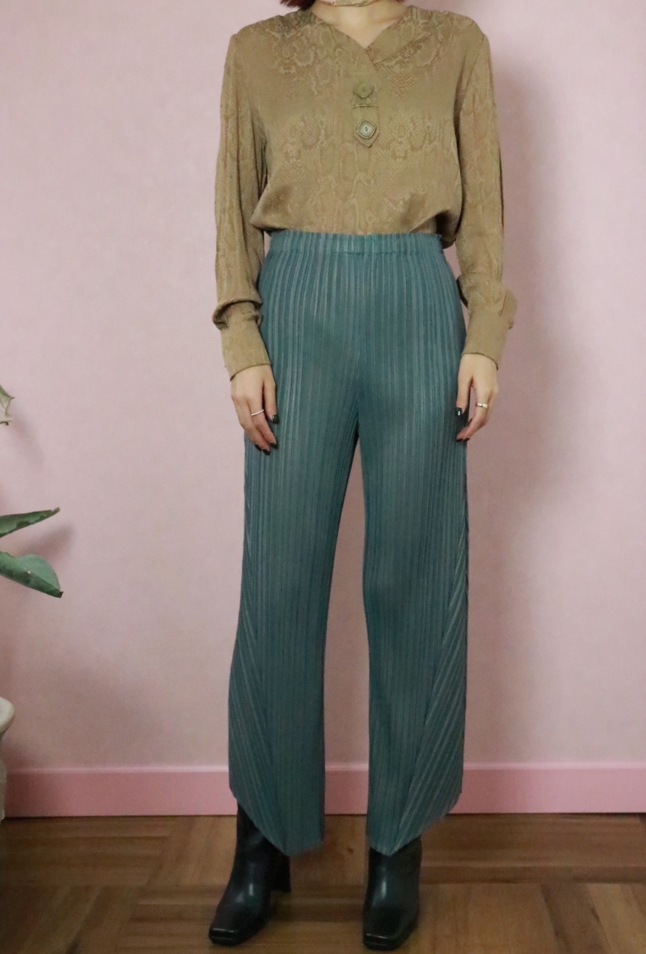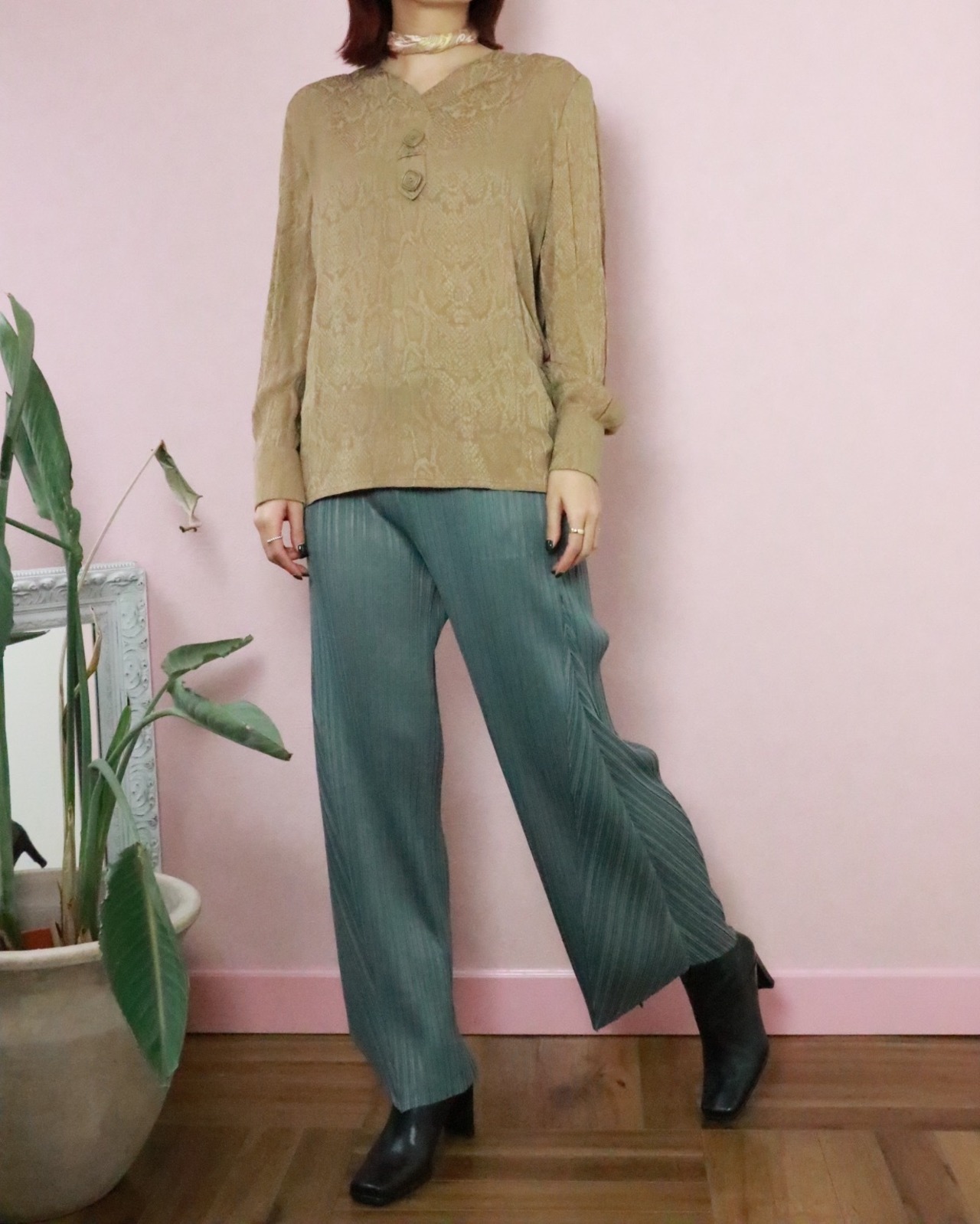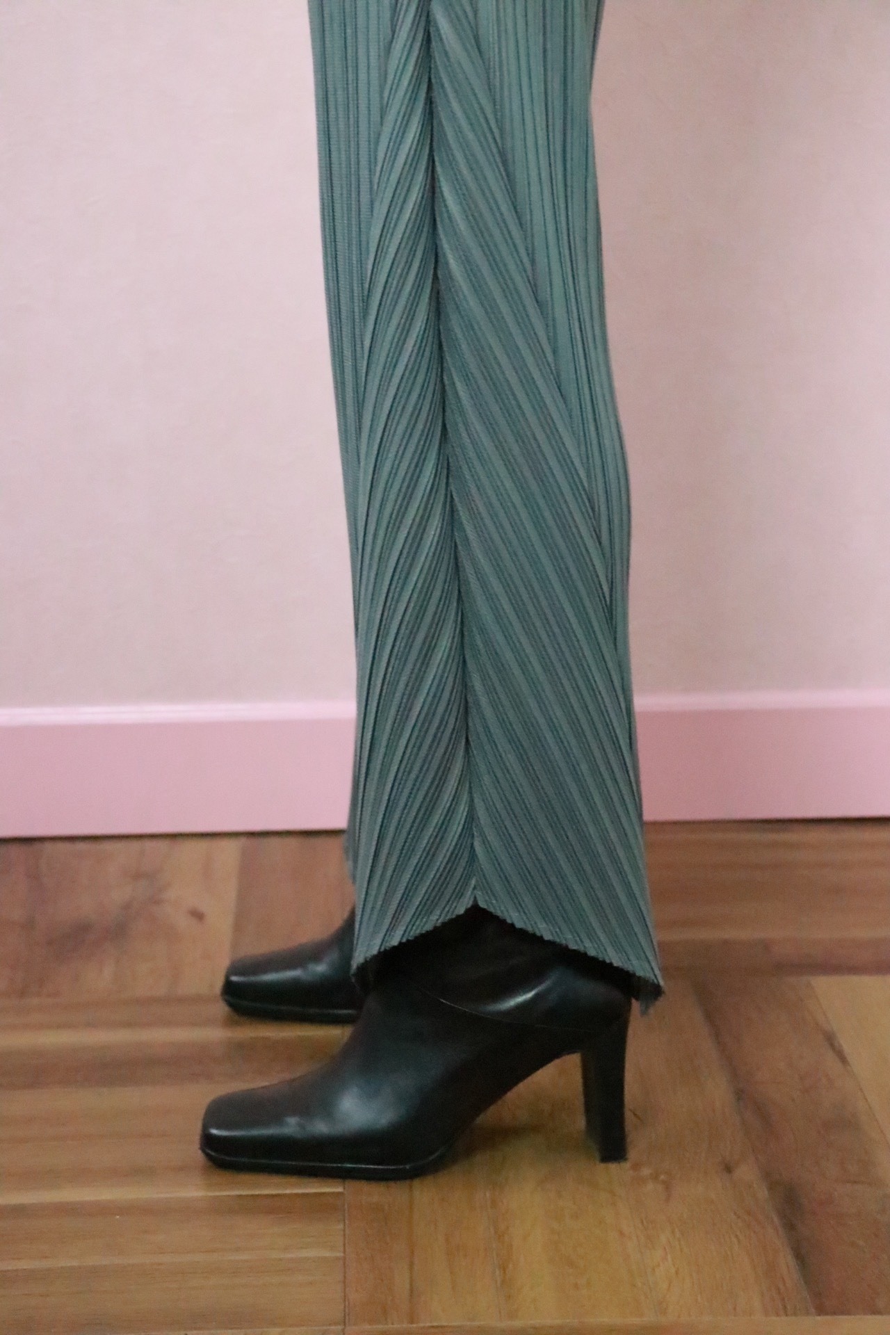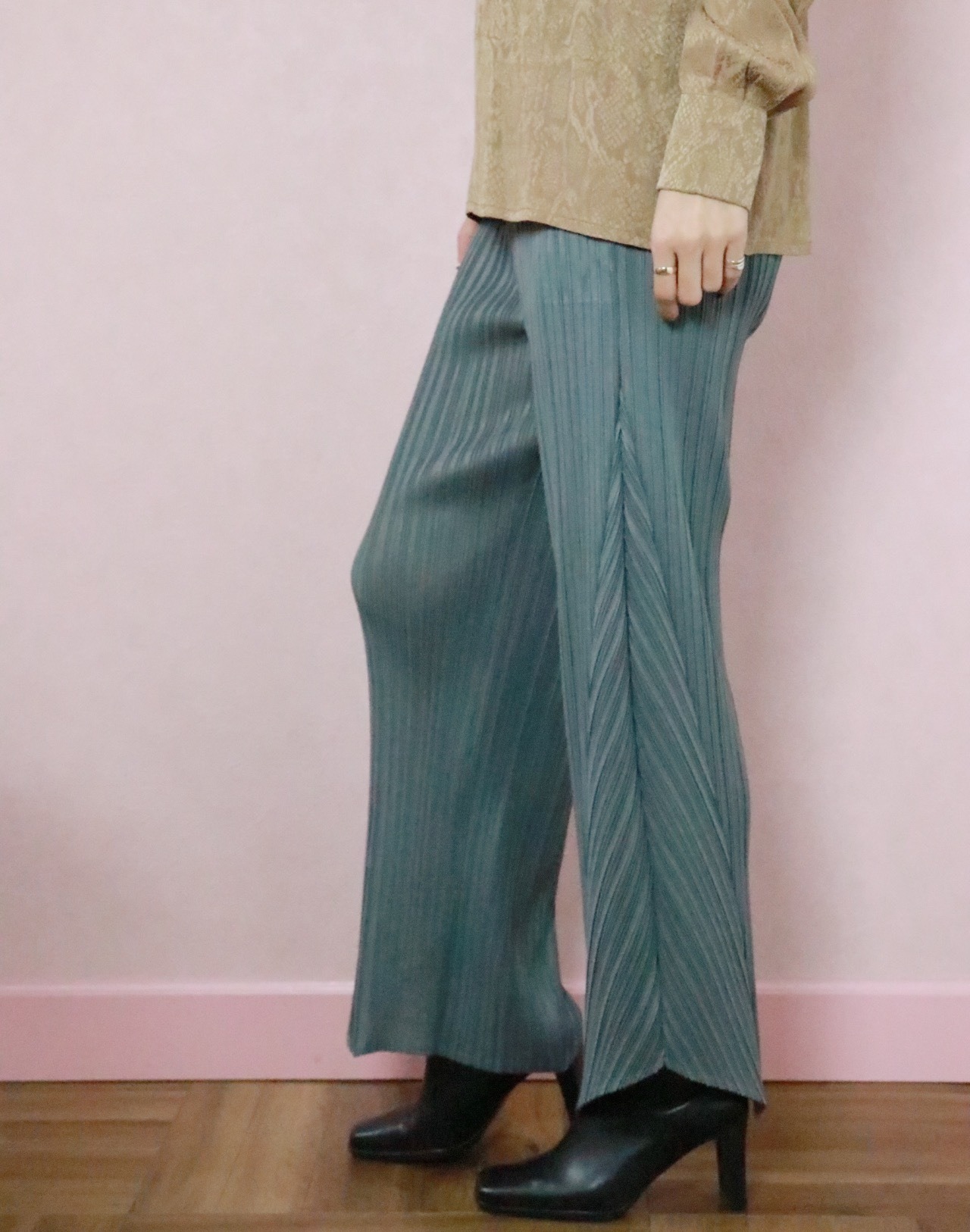 落ち着いたグレーと細やかなプリーツデザイン、サイドの切り替えが立体的な表情を生み出し、モードな着こなしをアシスト。