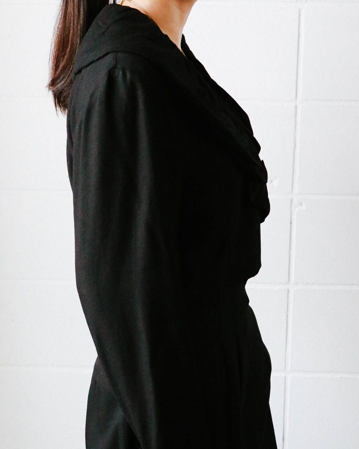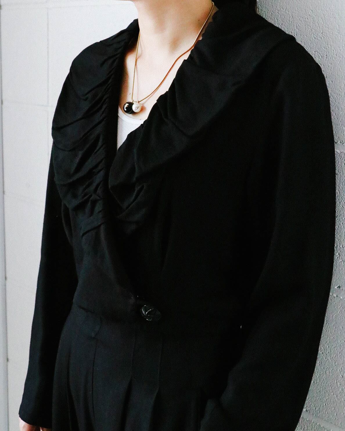 トップスは幅広い襟で、フリルがついたショート丈のワンボタンデザイン、袖は同生地のクルミボタンが上品なディテール。パンツは程よいバランス感のタック入りハイウエストタイプで、美バランスな仕上がりに。とっても気持ちよくソフトな肌触りのちょうどいい素材感も魅力的。