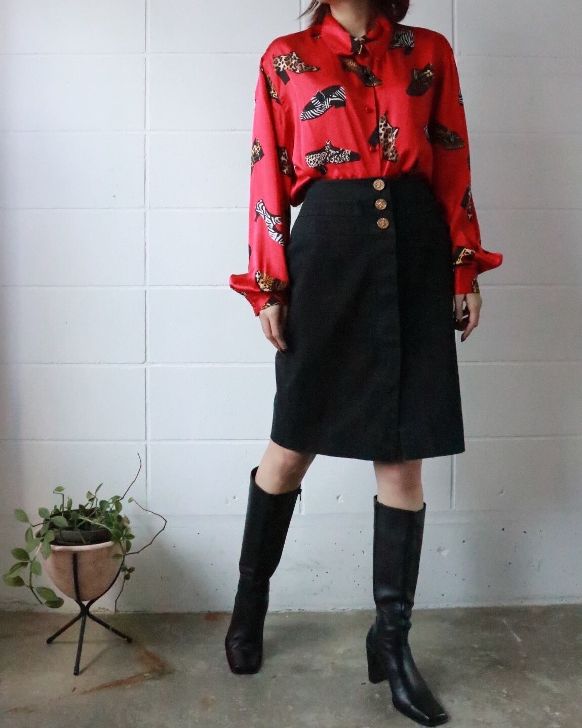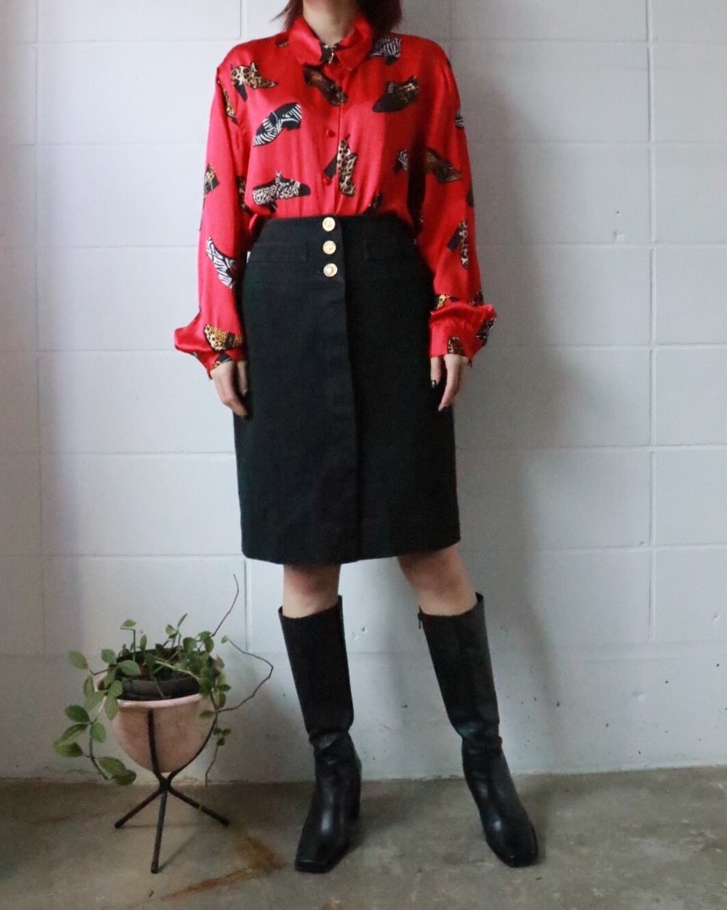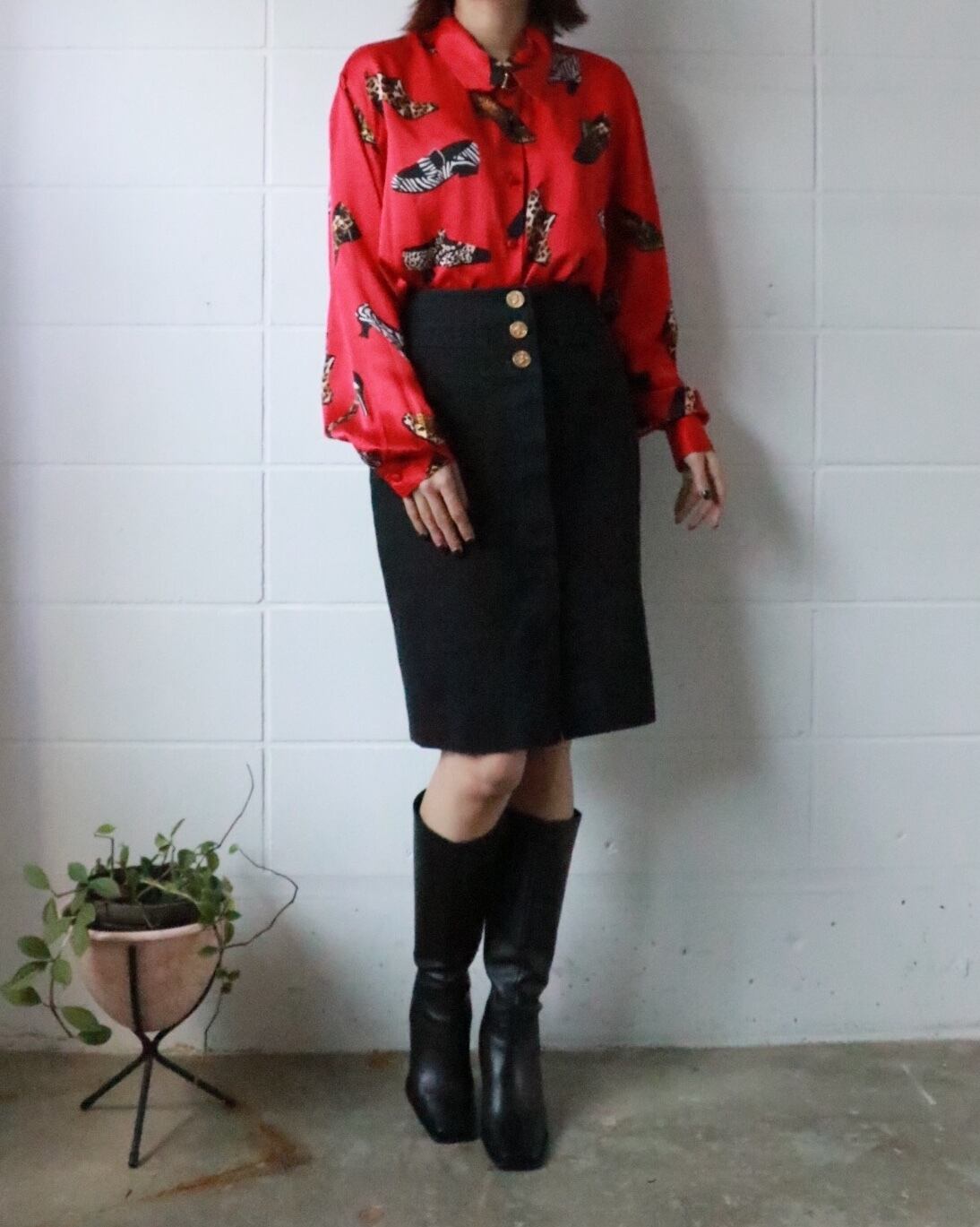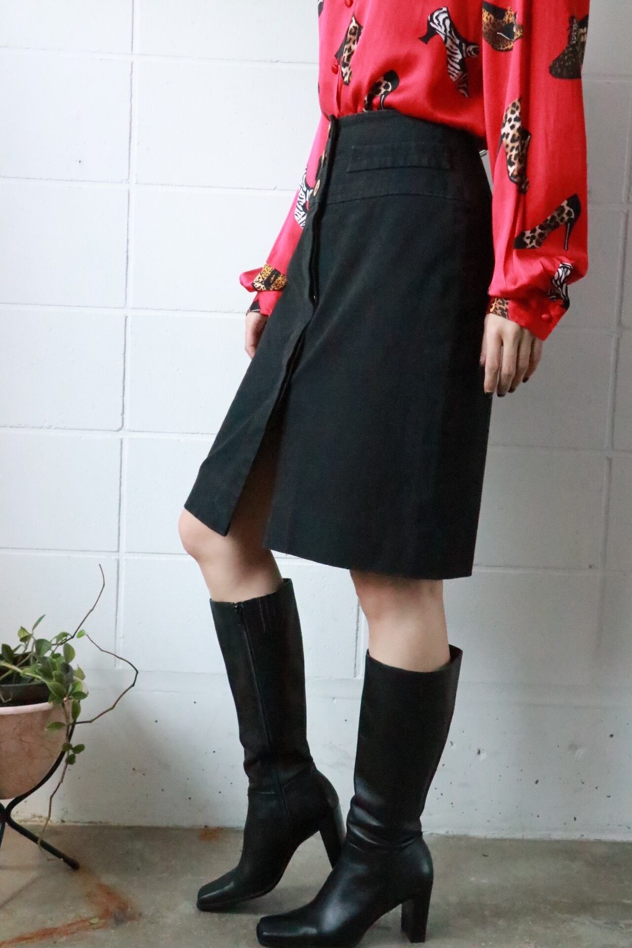ウエスト切り替えの効いた前スリットのボタン開きデザインに