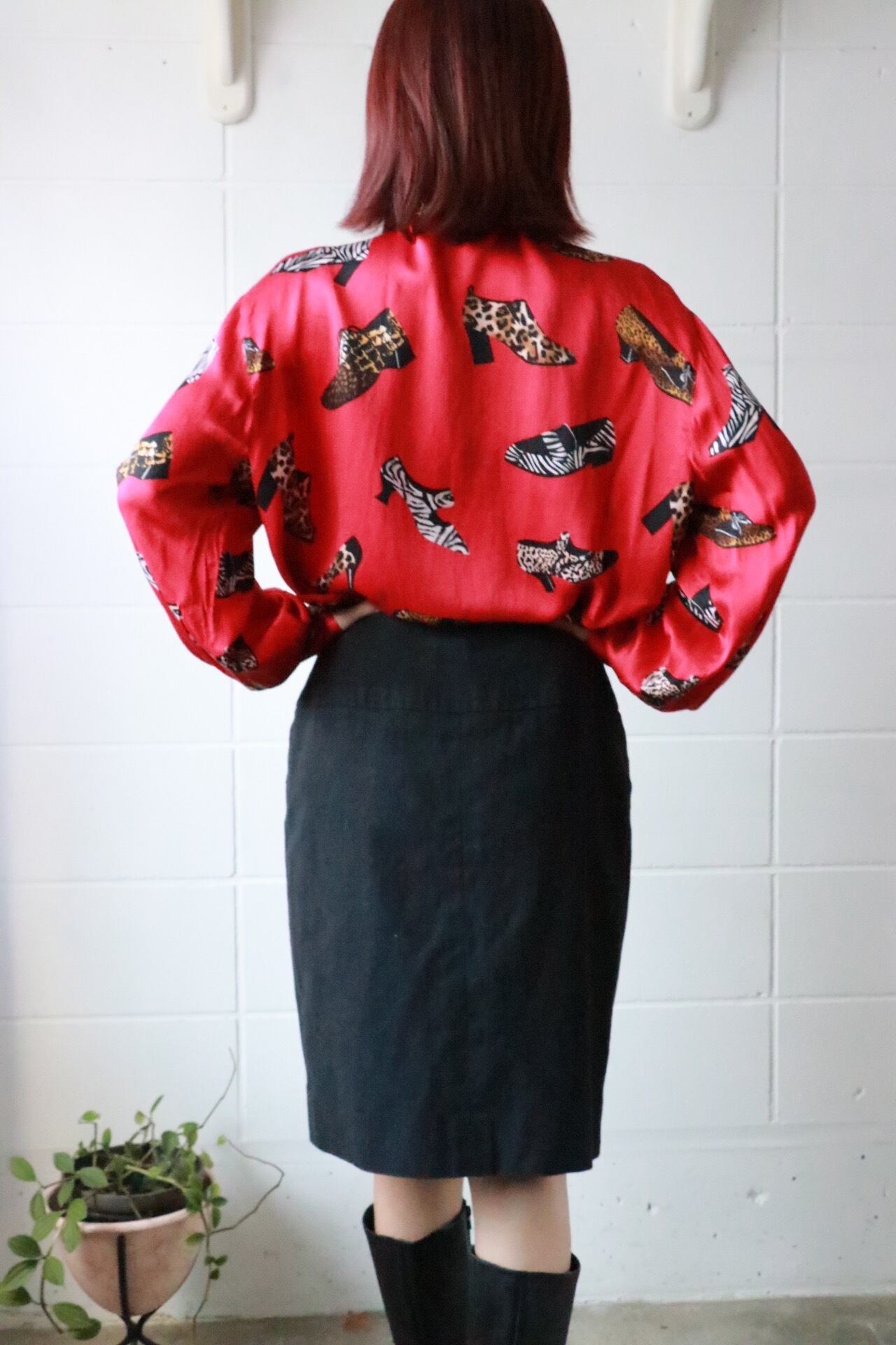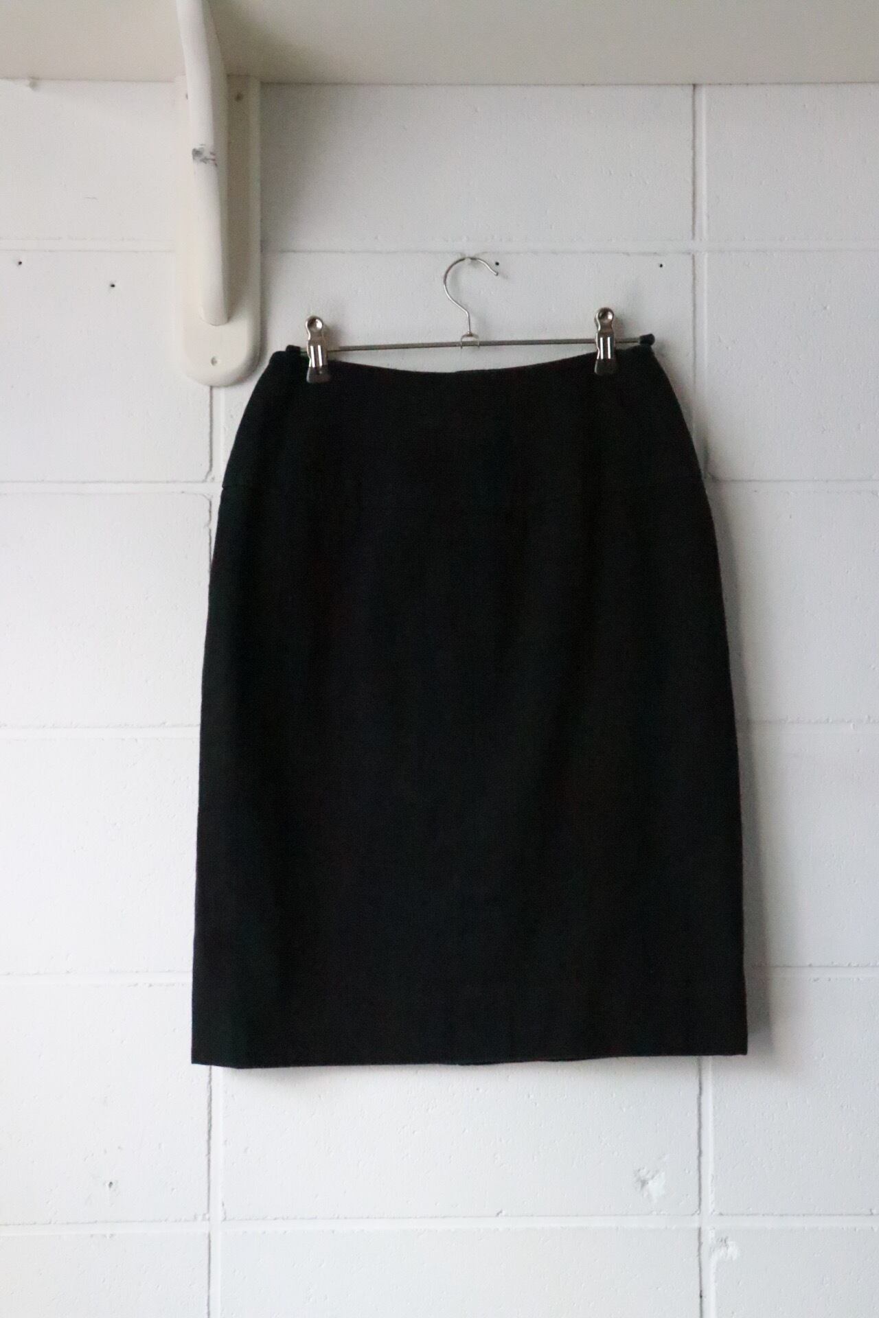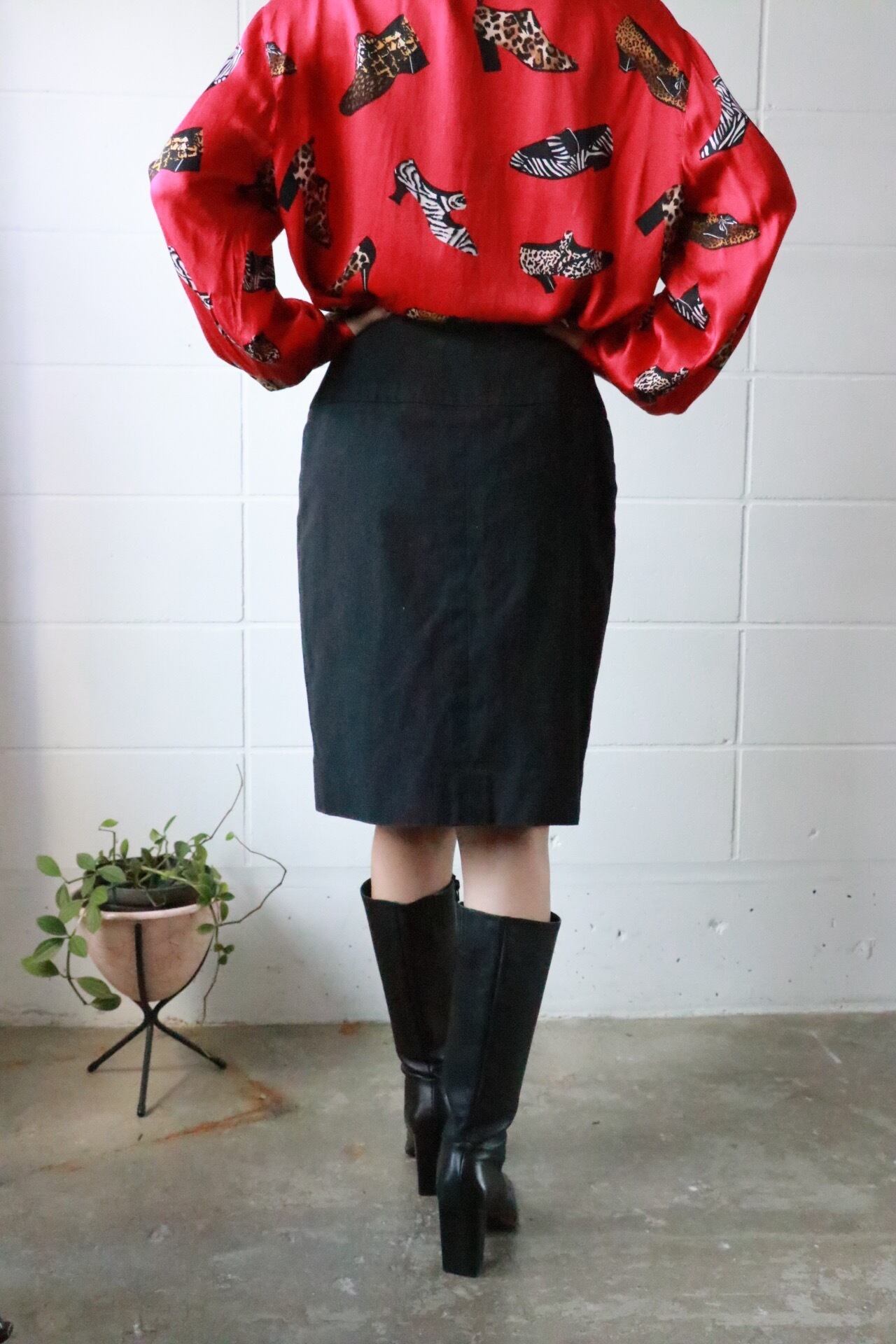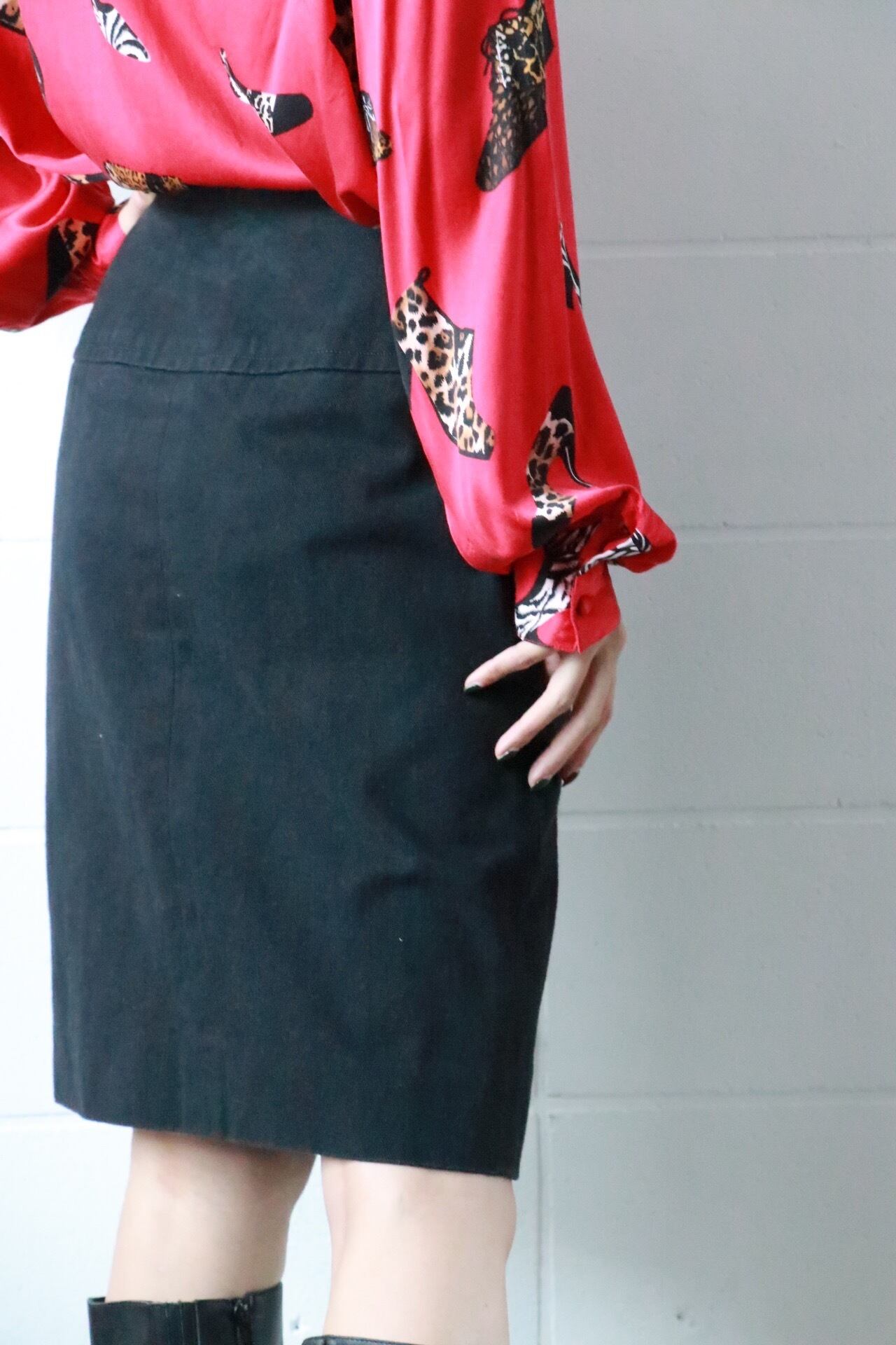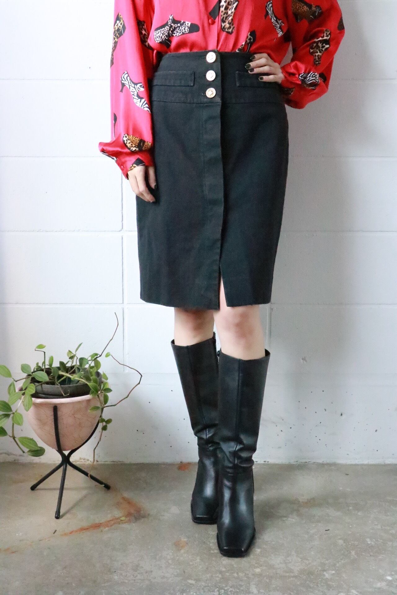 ウエスト切り替えの効いた前スリットのボタン開きデザインに