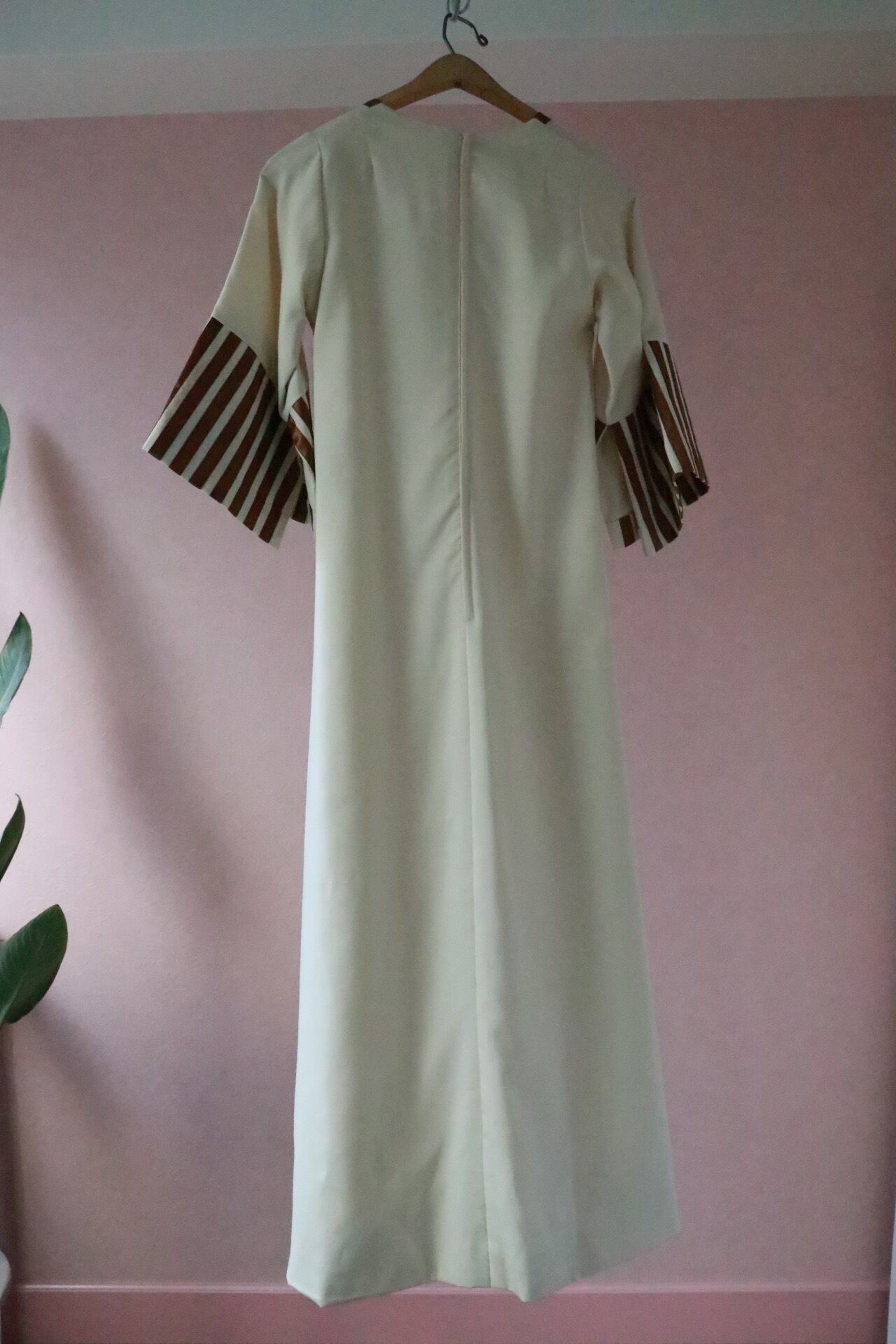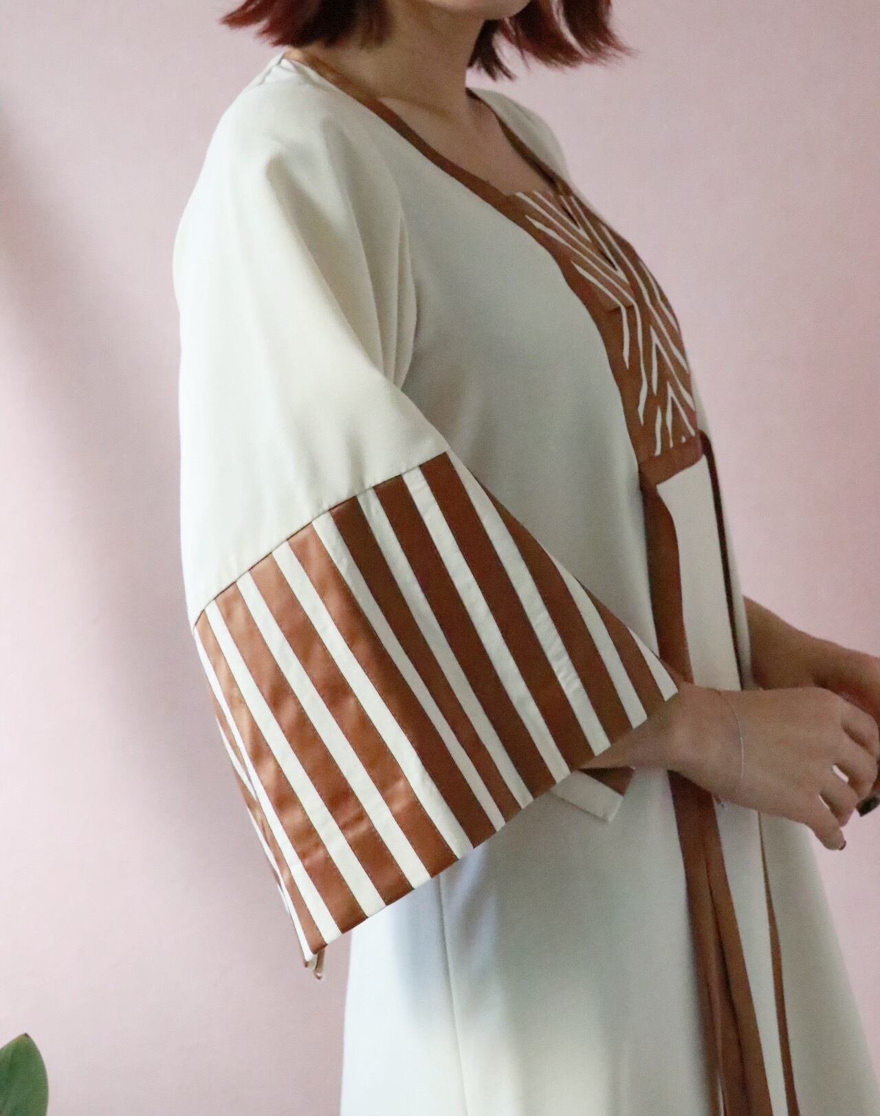 五分丈のスリット入り着物スリーブにはストライプのアクセント、