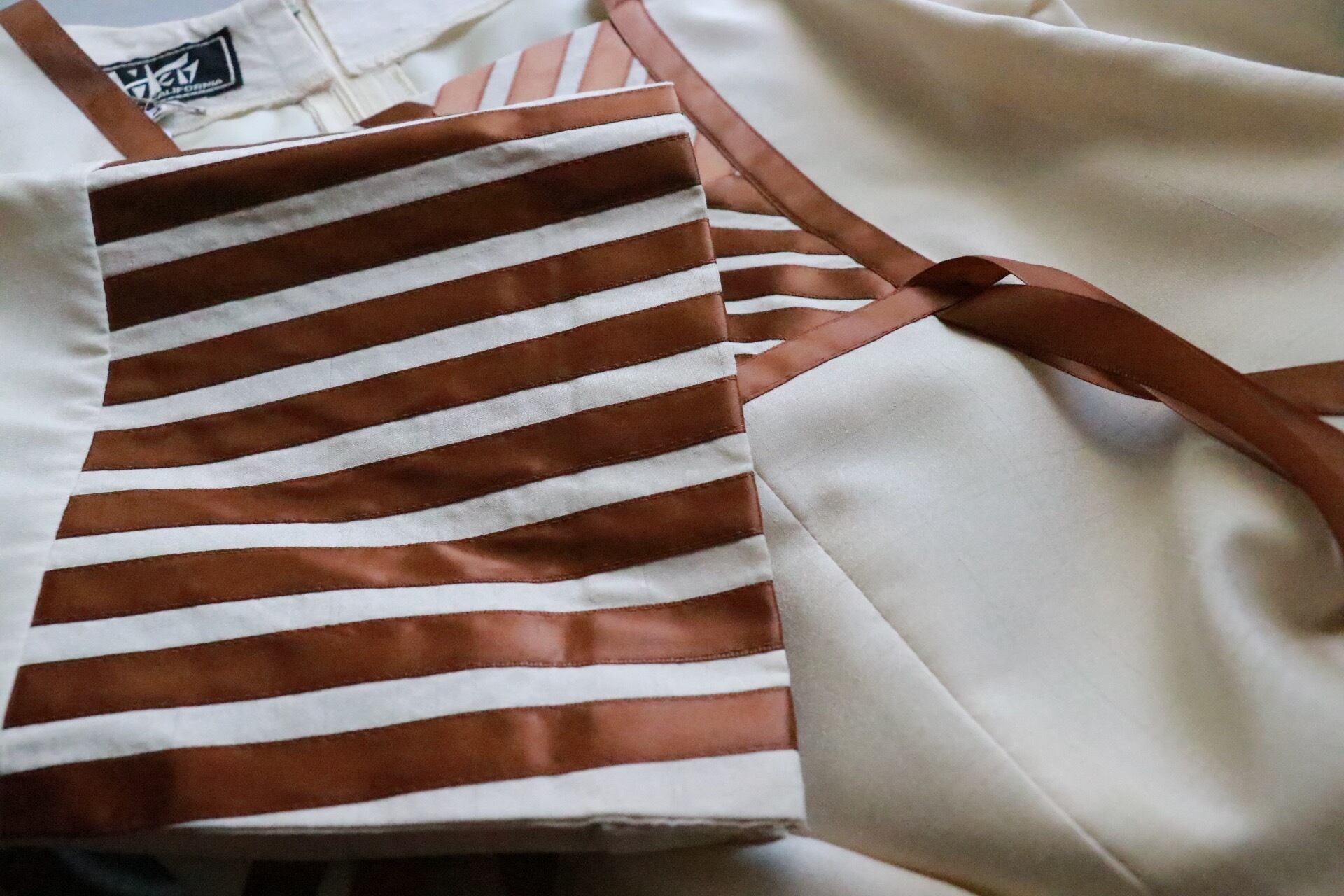 光沢のあるオフホワイト生地にブラウンのサテン生地、エレガントなツヤ感を